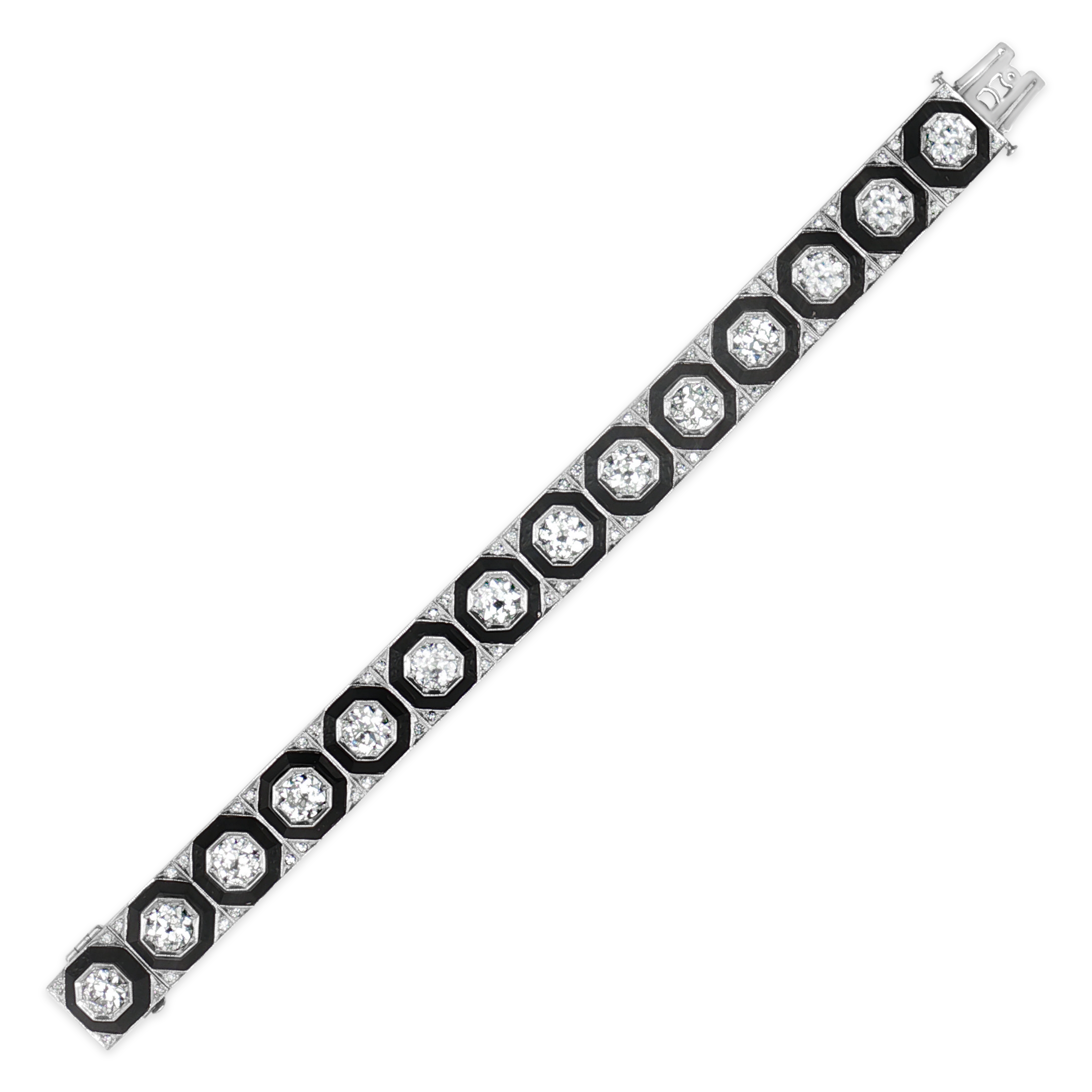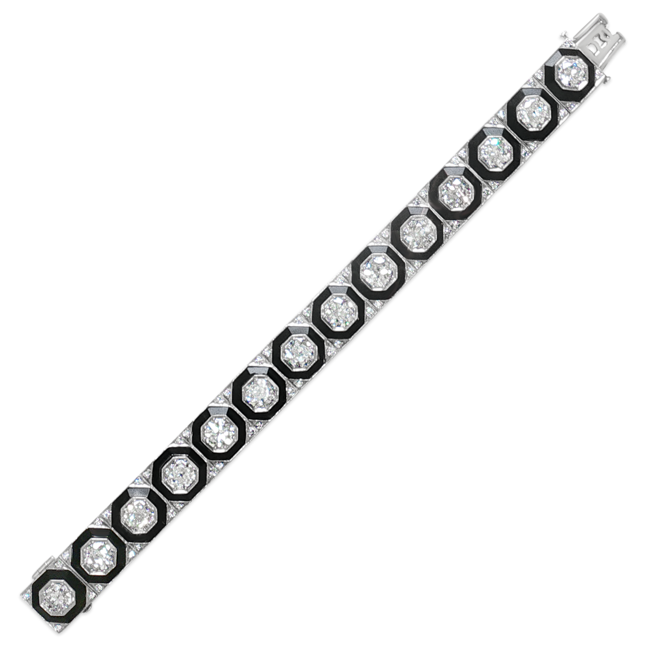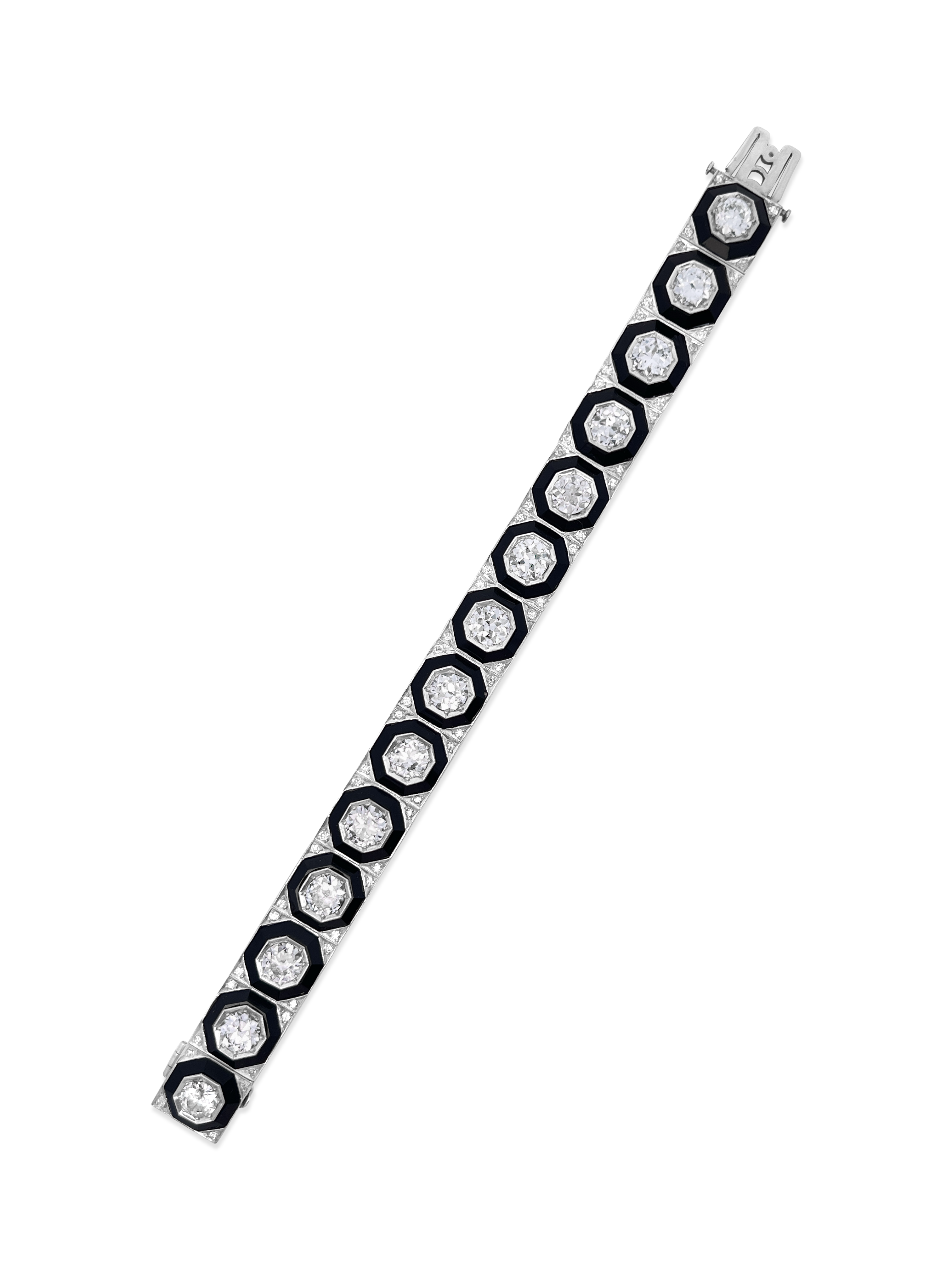 Old European cut diamonds and onyx bracelet. Total weight of the diamonds is 12.50 carats.
