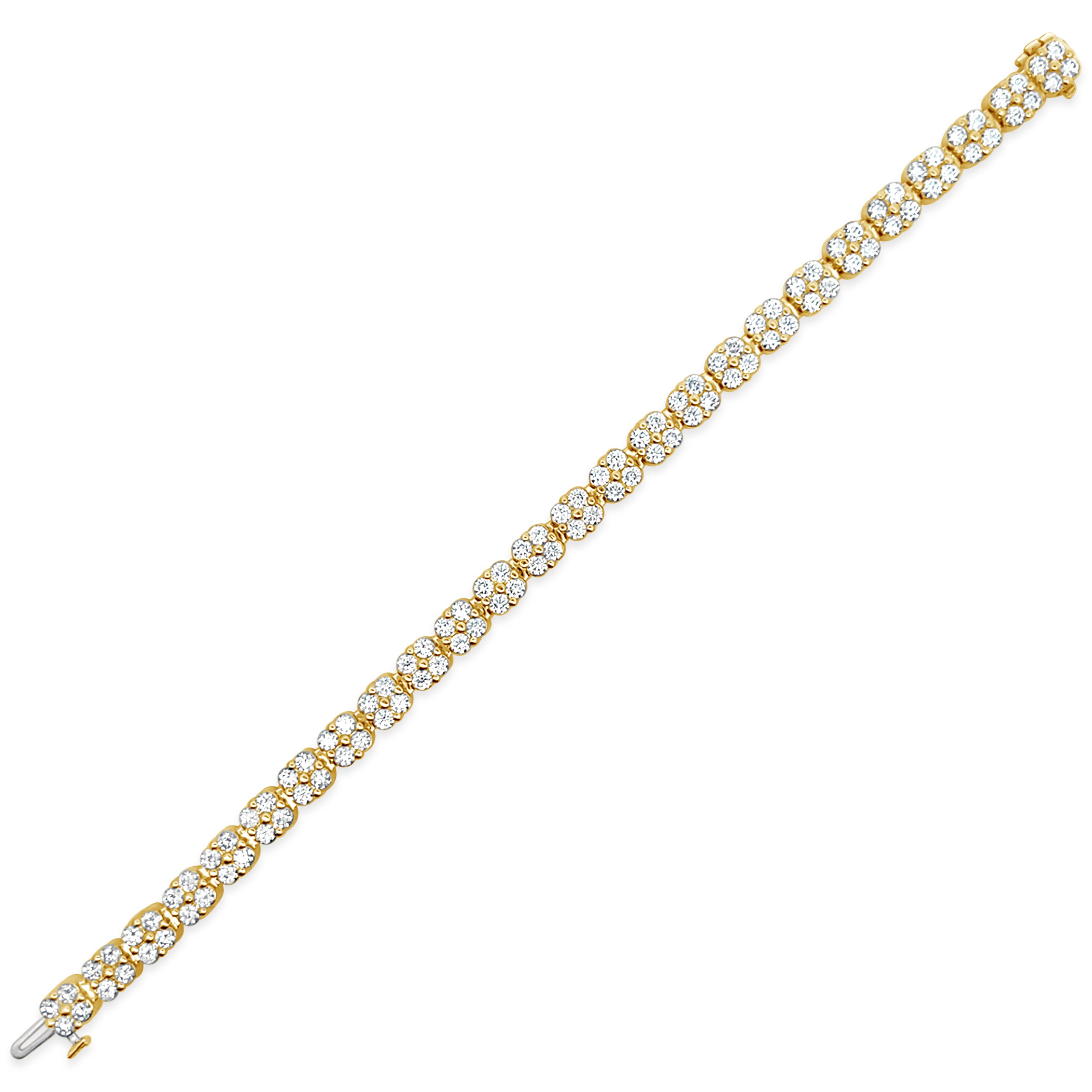 Round diamonds set in 14k yellow gold in this straight cluster design bracelet. Total weight of the diamonds is 7.01 carats.