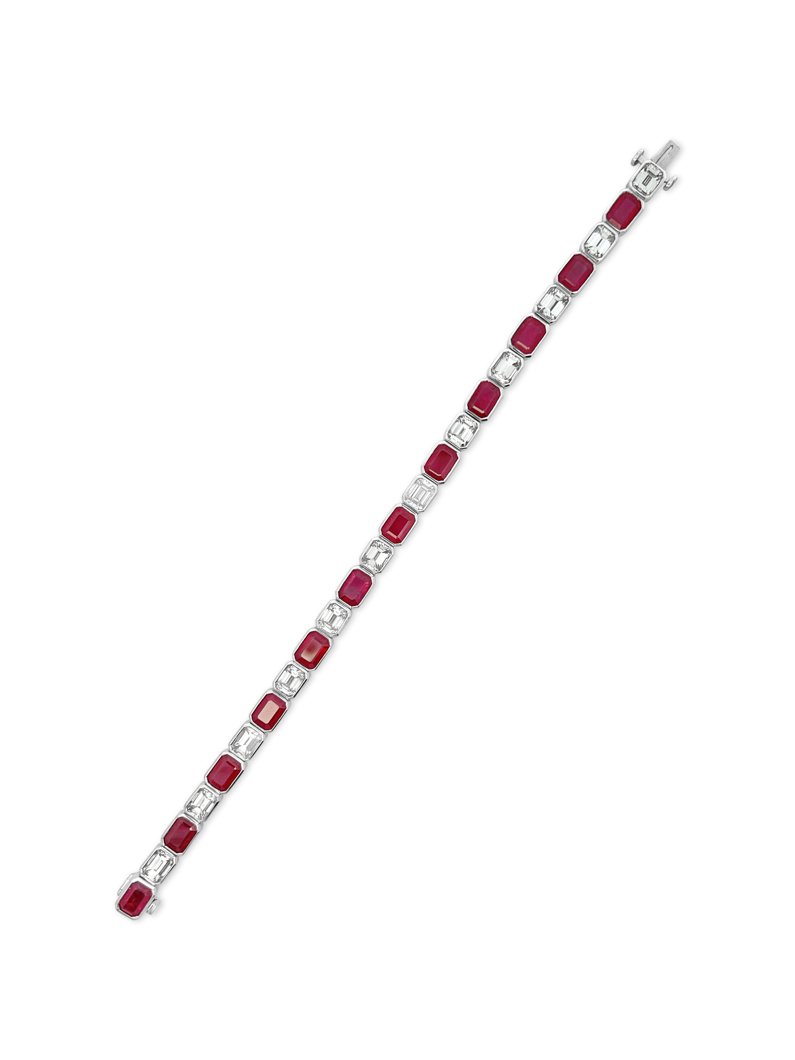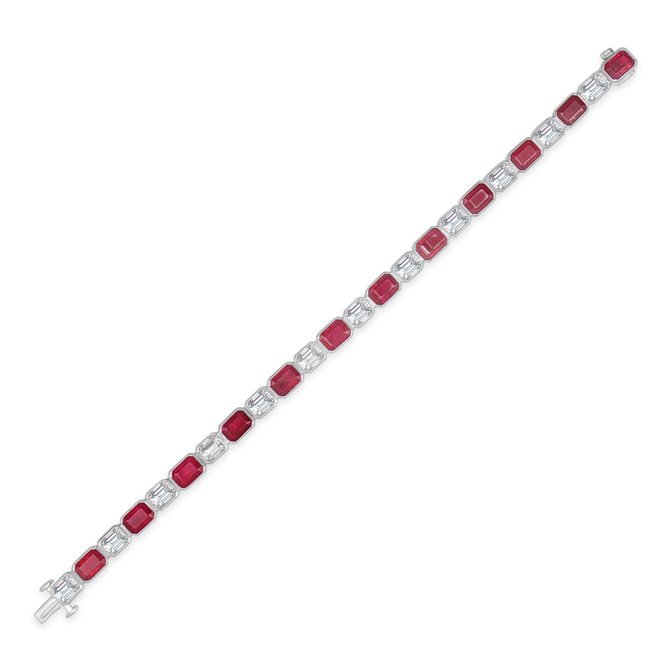 Emerald cut rubies and emerald cut diamonds set in platinum in this bracelet. Total weight of the rubies is 12.69 carats. Total weight of the diamonds is 8.48 carats.