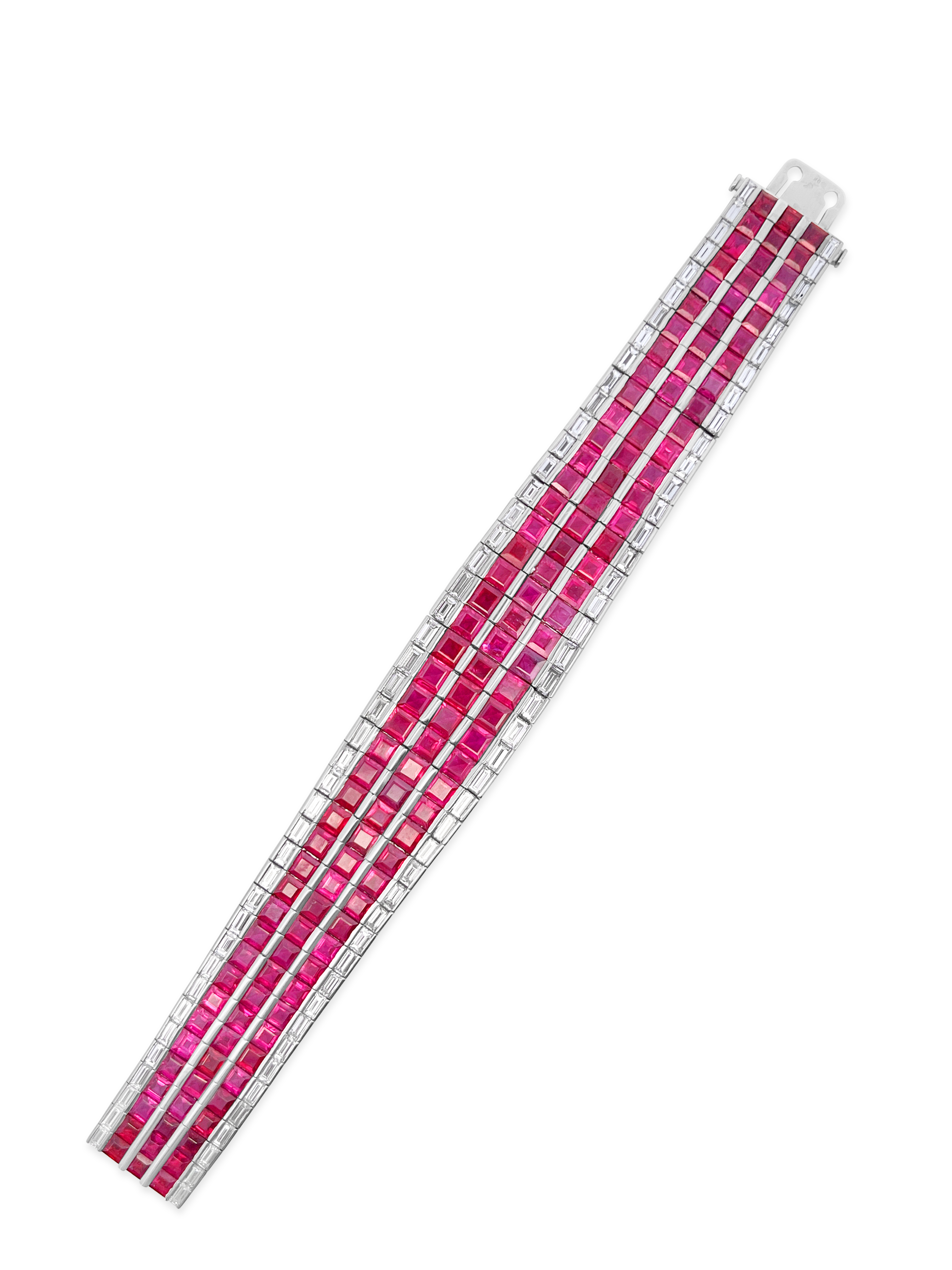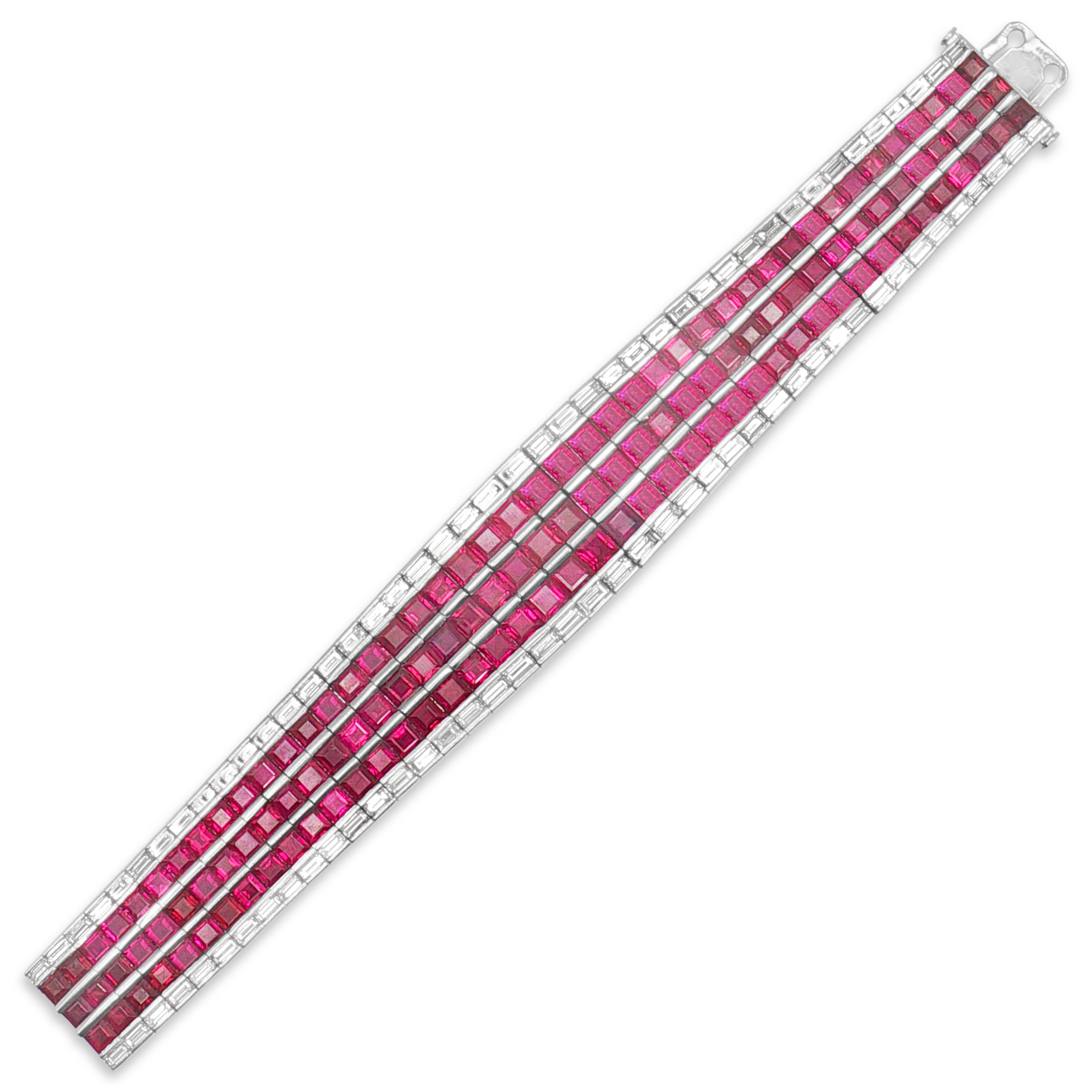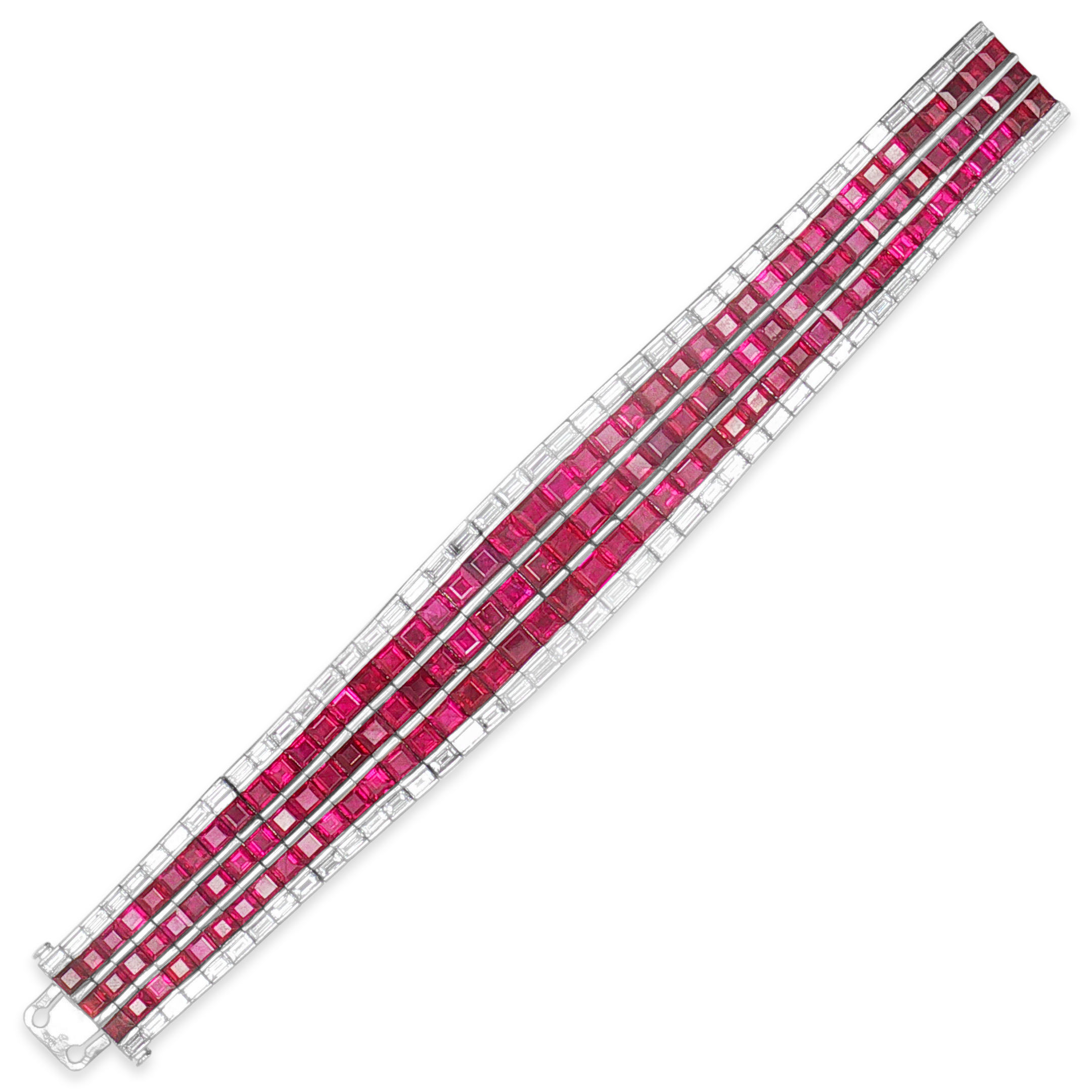 Square ruby and baguette diamond bracelet set in platinum. Total weight of the rubies is 80.00 carats. Total diamond weight is 15.00 carats.