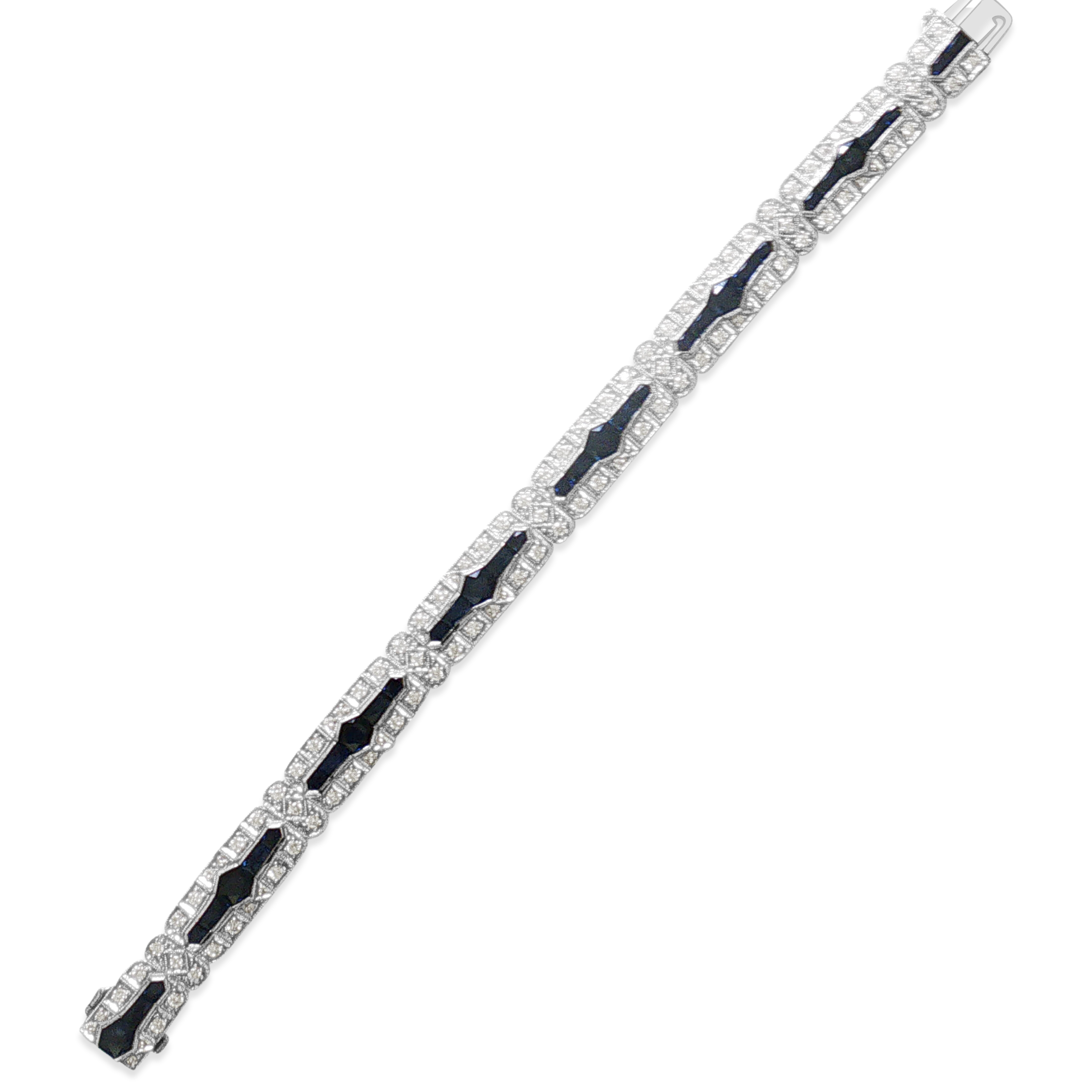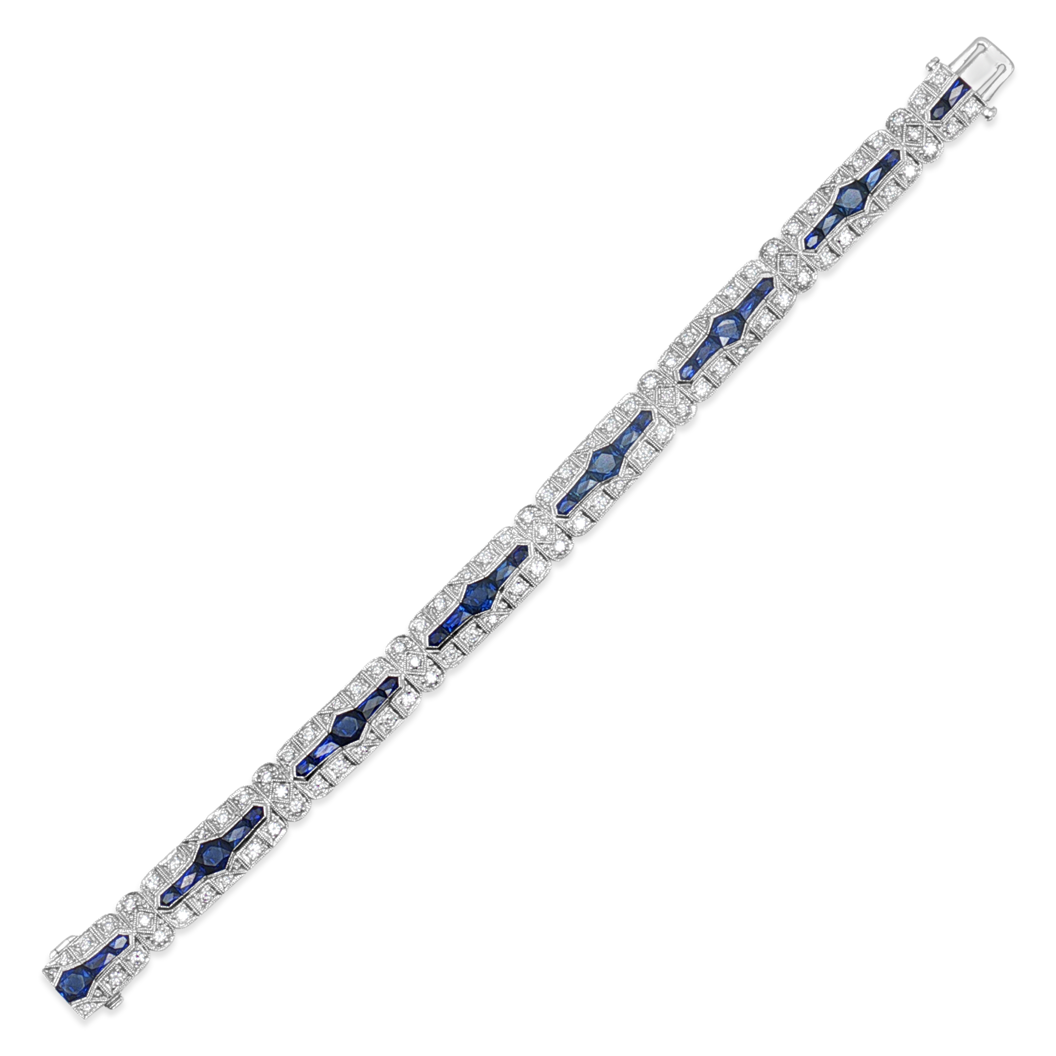 Blue sapphires and diamonds set in platinum. Total weight of the sapphires is 9.87 carats. Total diamond weight is 2.82 carats.
