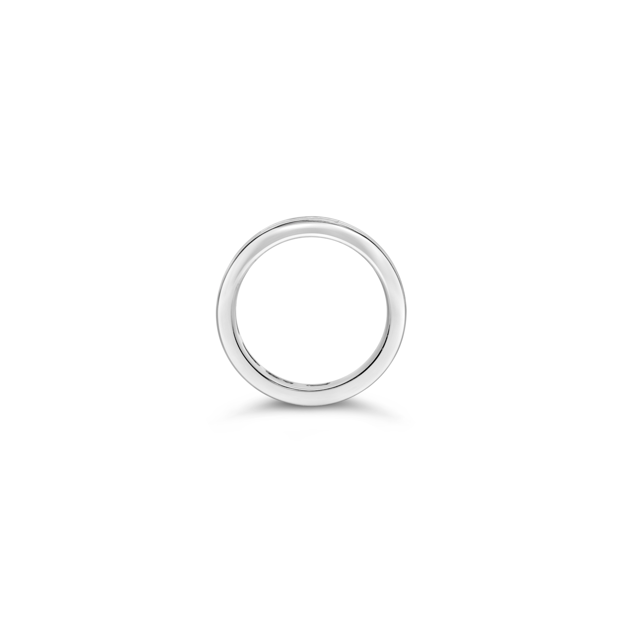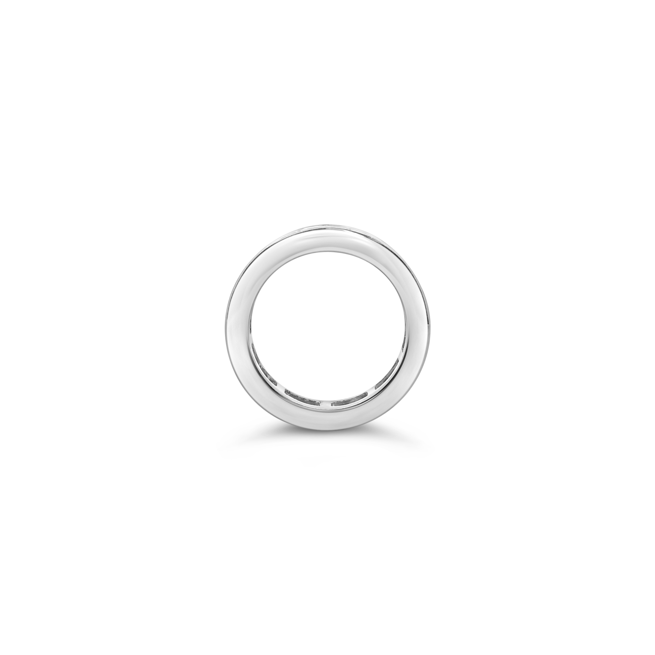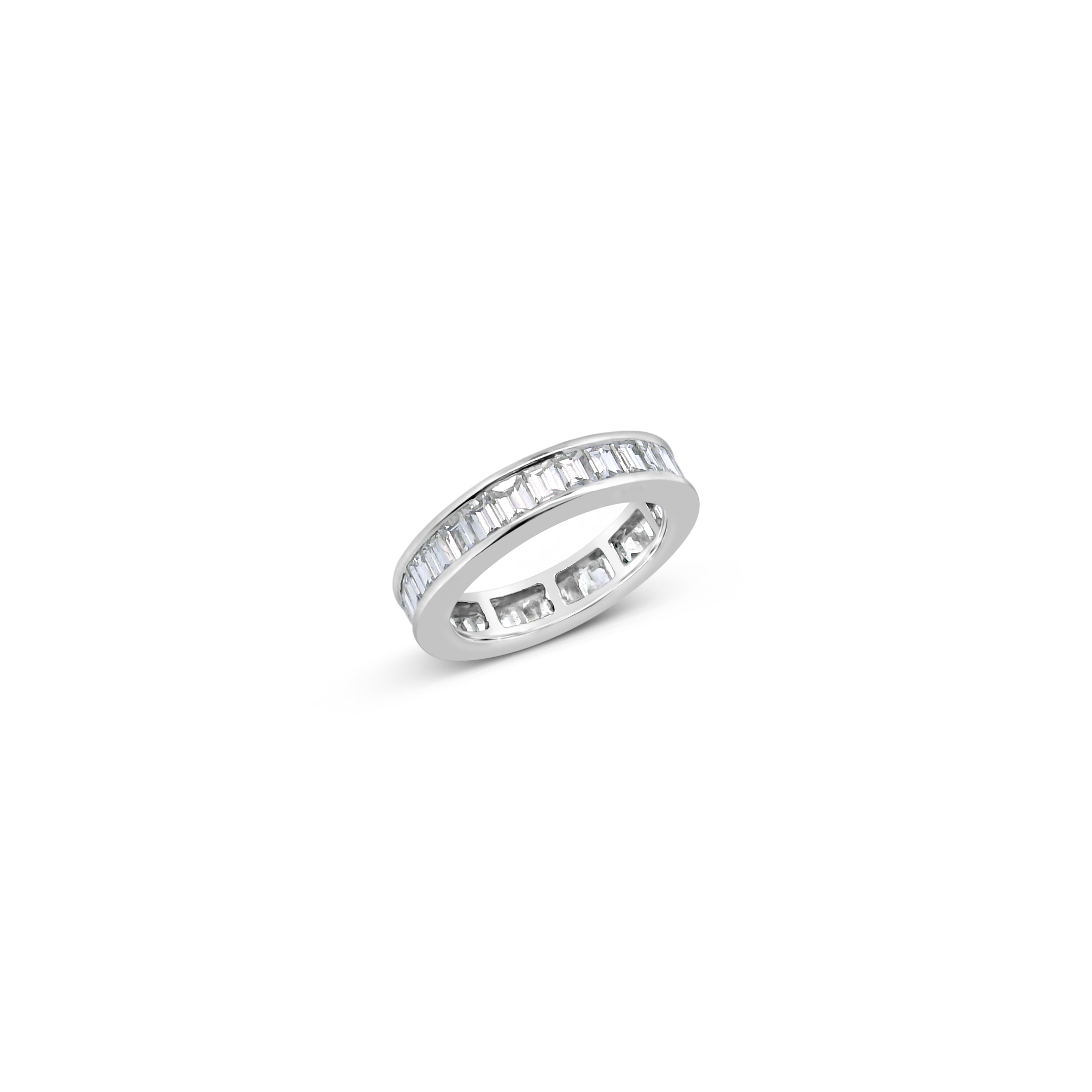 Baguette diamonds channel set in a platinum eternity band. Total diamond weight equals 3.30 carats.