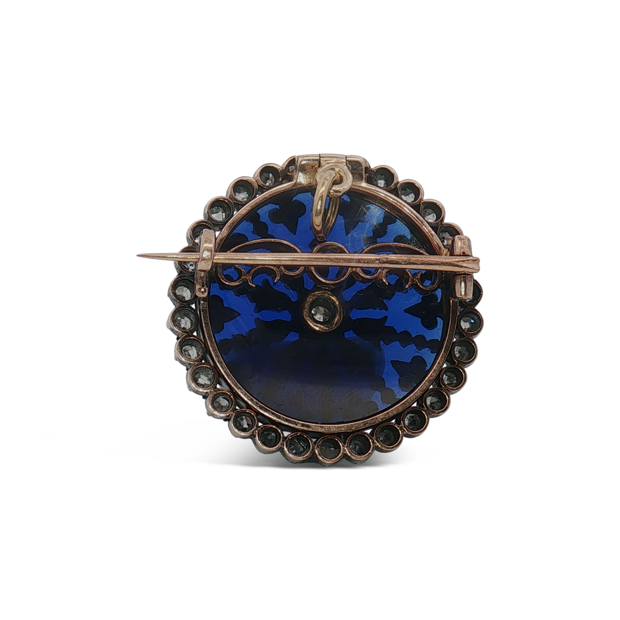 Rose cut diamonds with a backing of cobalt blue glass set in 18k rose gold with Victorian silver in this earring and pin/pendant set, Circ 1880's. Approximate carat weight of the diamonds is 3.75 carats.