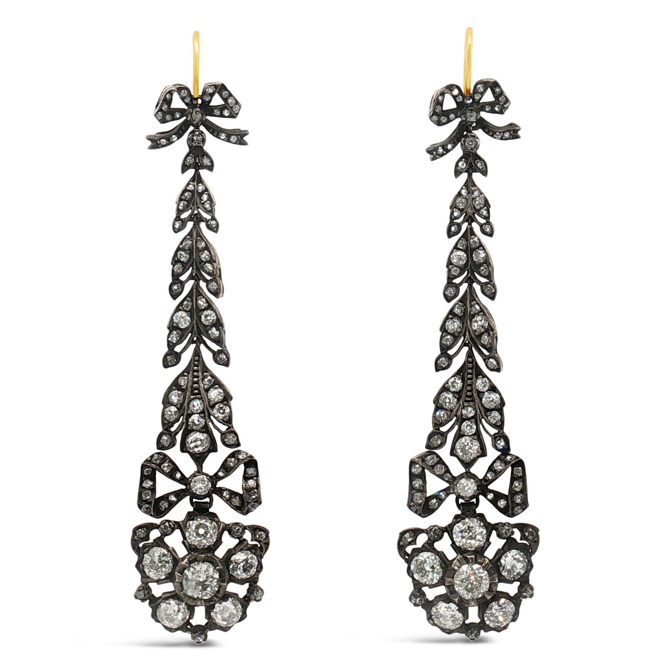 Diamonds set in Silver on gold in these antique drop earrings. Total weight of the diamonds is approximately 5.00 carats.