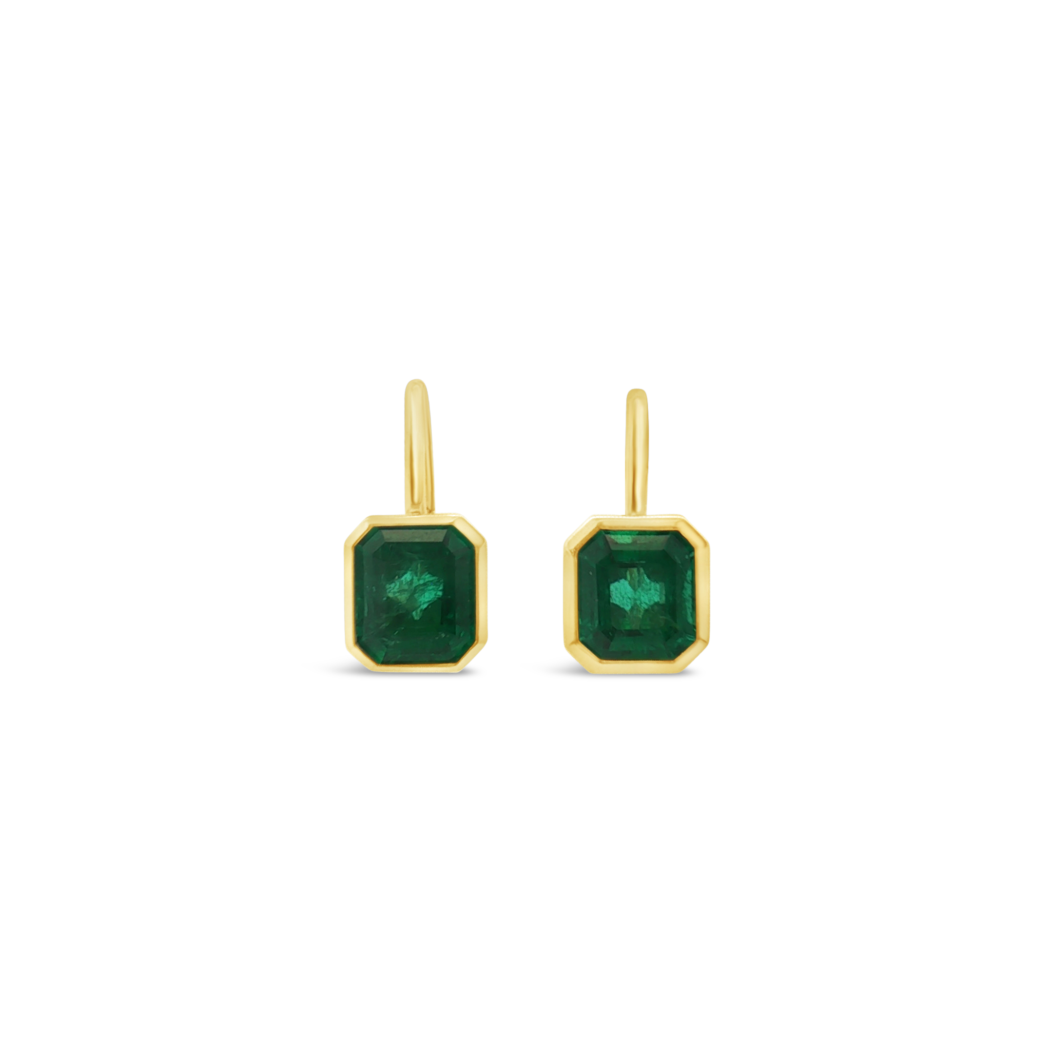 Emerald cut emeralds bezel set in 18k yellow gold in these lever back earrings. Total weight of the two emeralds is 5.00 carats.