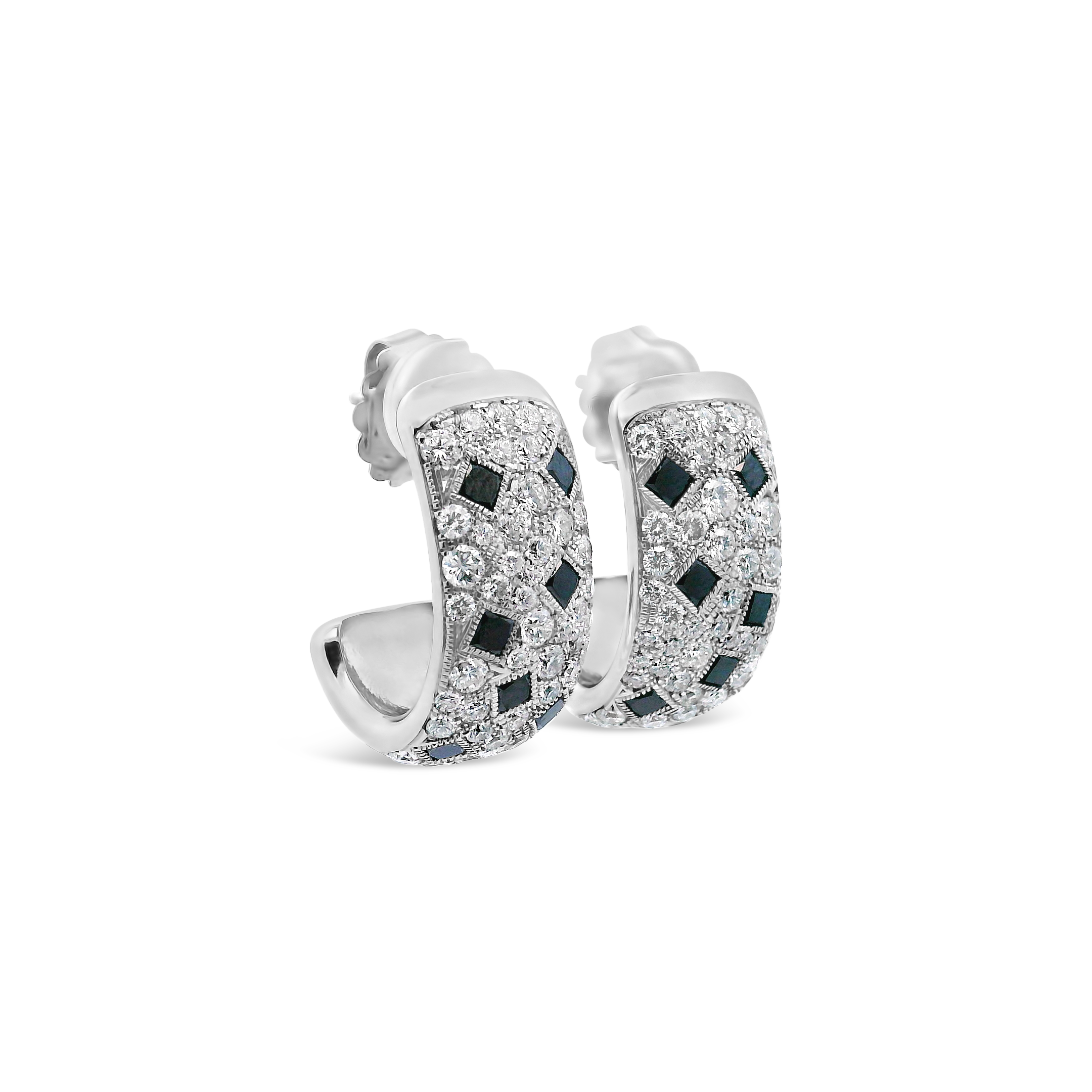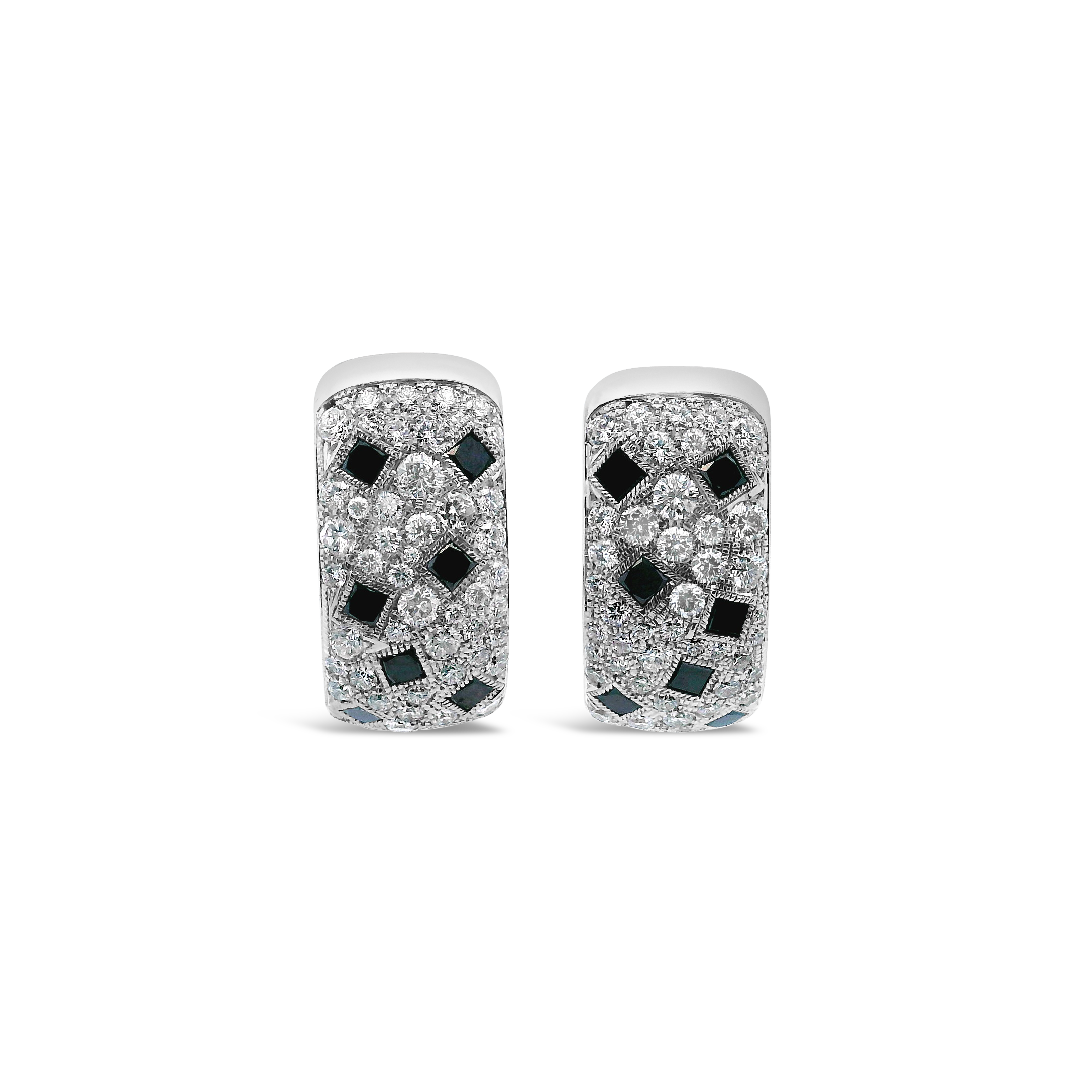 Round black and white diamonds set in 18k white gold in these earrings. Total weight of the black diamonds is 2.18. Total weight of the white diamonds is 1.45 carats.