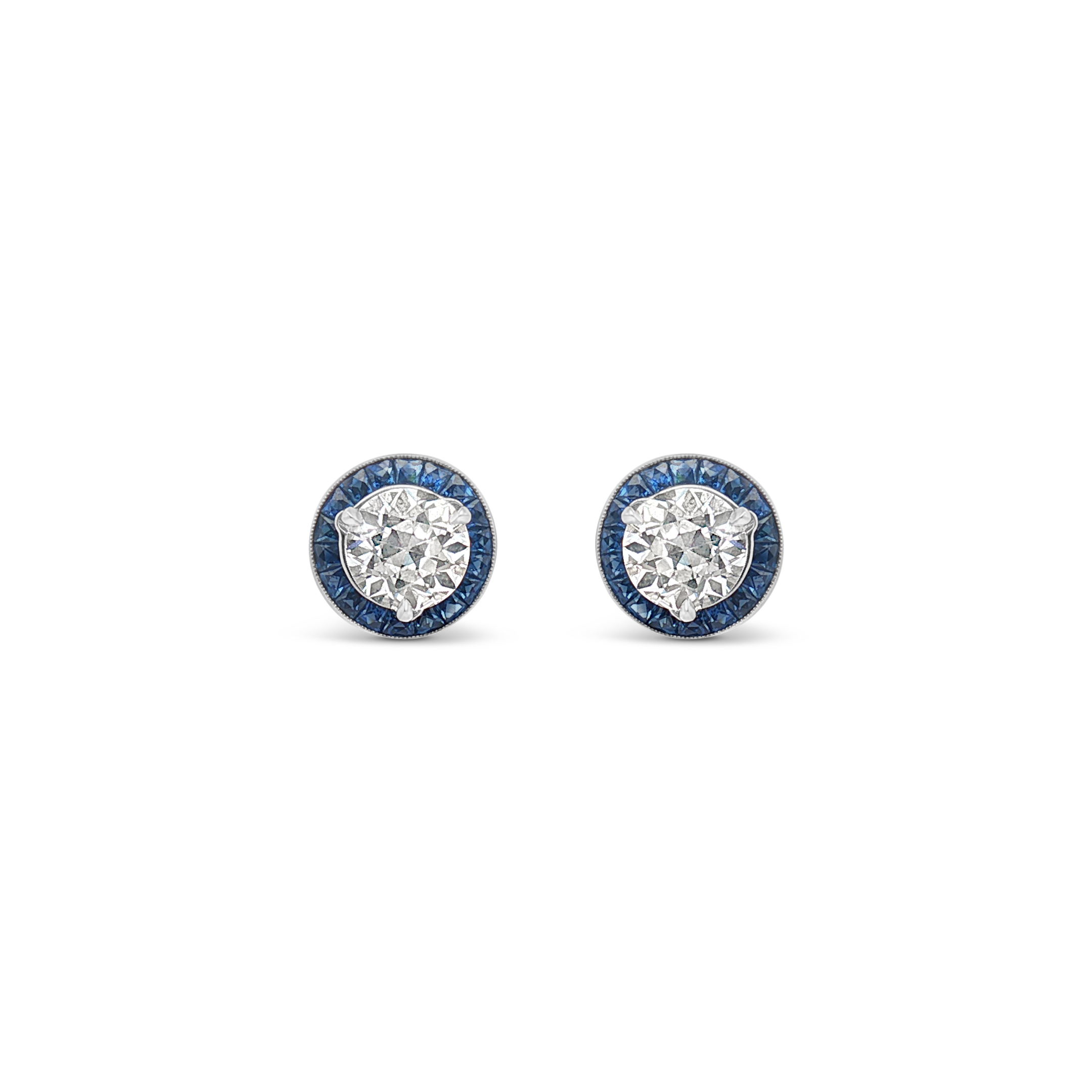 Round diamonds surrounded by fancy cut blue sapphires set in platinum in these earrings. Total weight of the diamonds is 1.23 carats. Total sapphire weight is 2.62 carats.