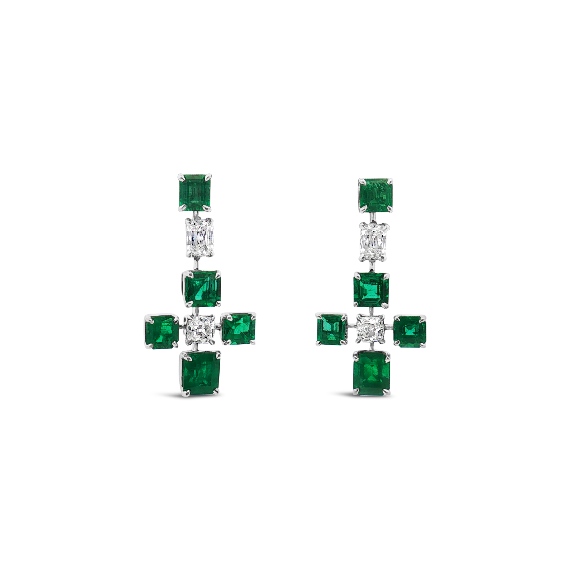 Emerald cut emeralds with round and emerald cut diamonds set in platinum in these cross design dangle earrings. Total weight of the emeralds is 4.90 carats. Total diamond weight is 1.31 carats.