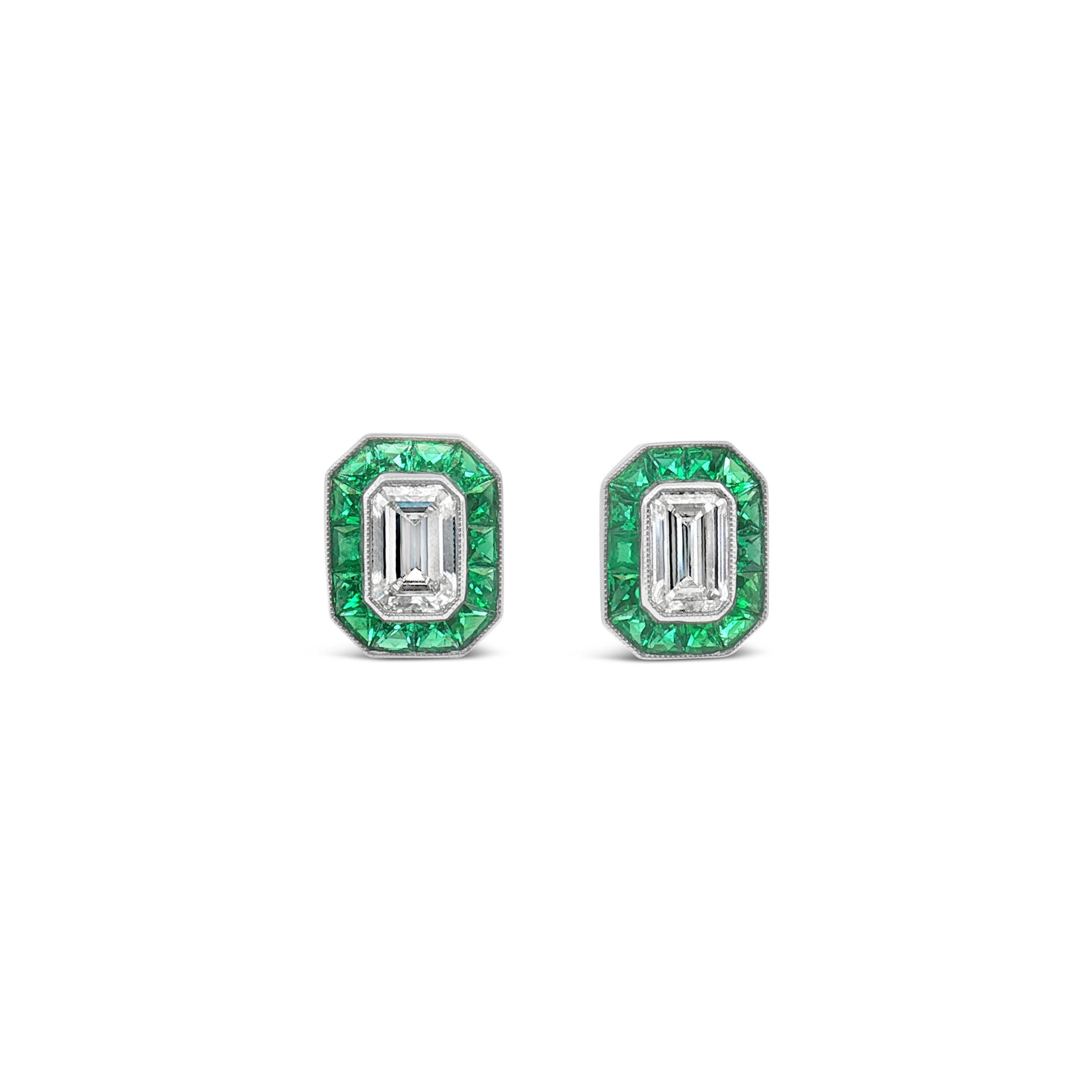 Emerald cut diamonds surrounded by emeralds set in platinum in these earrings. Total diamond weight is 3.00 carats.