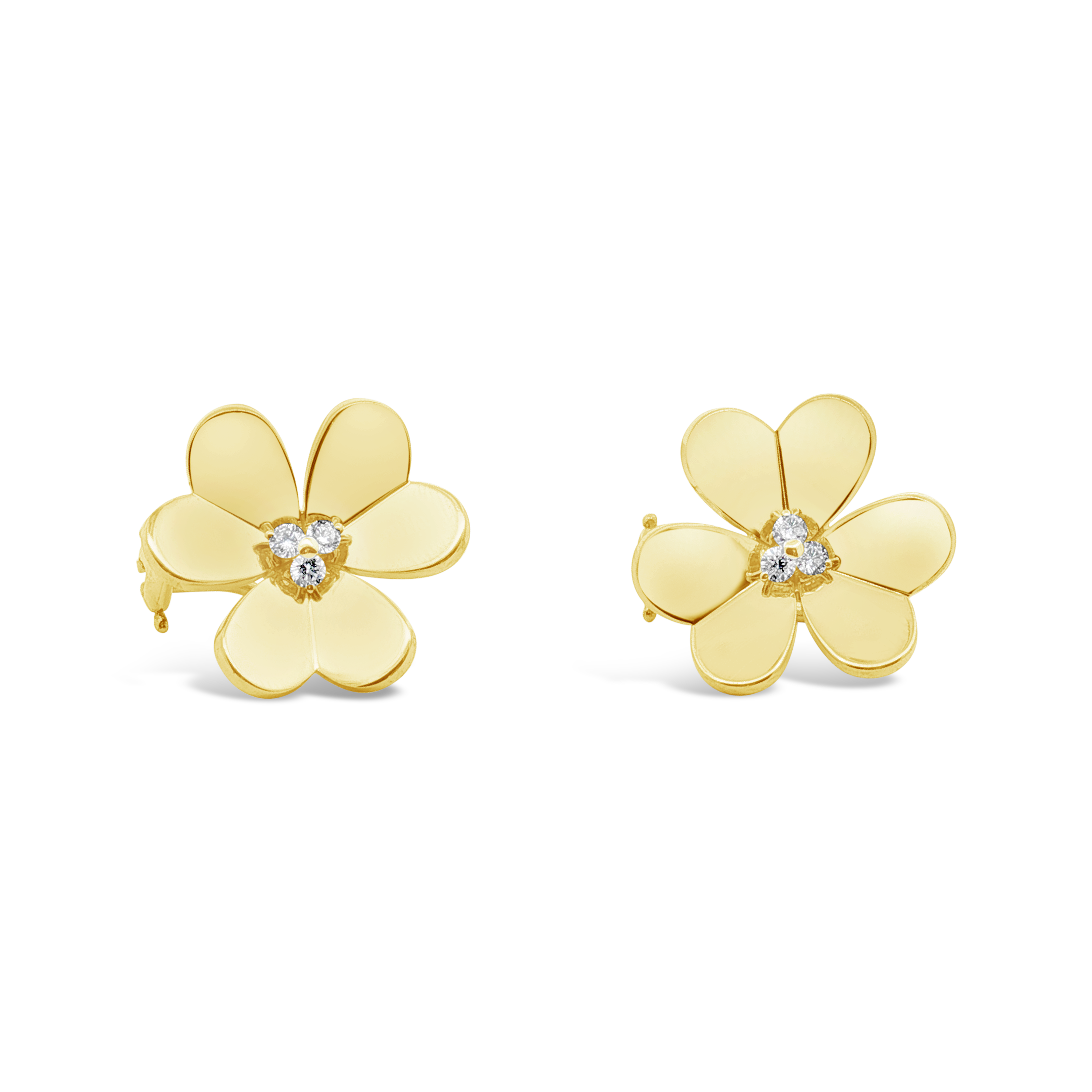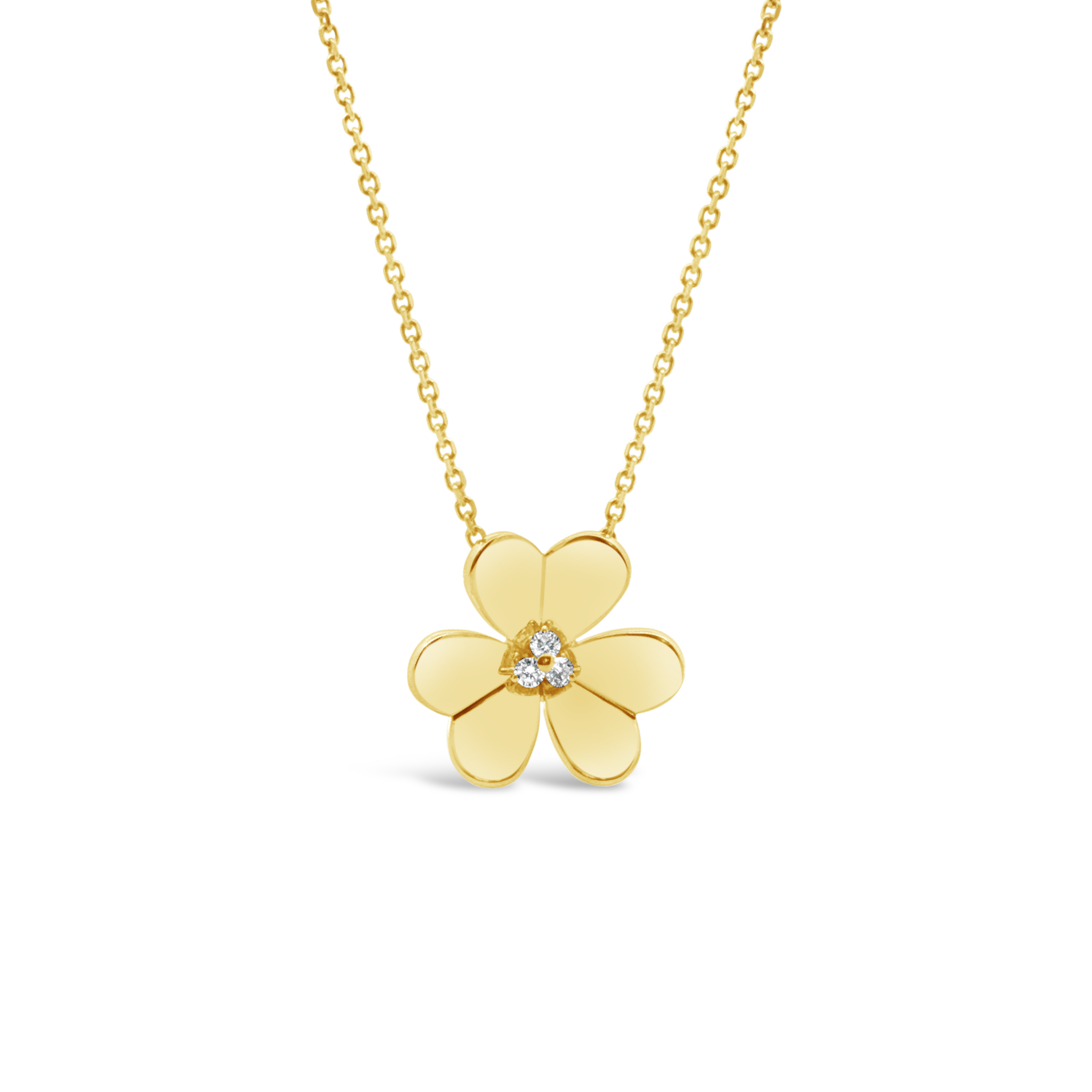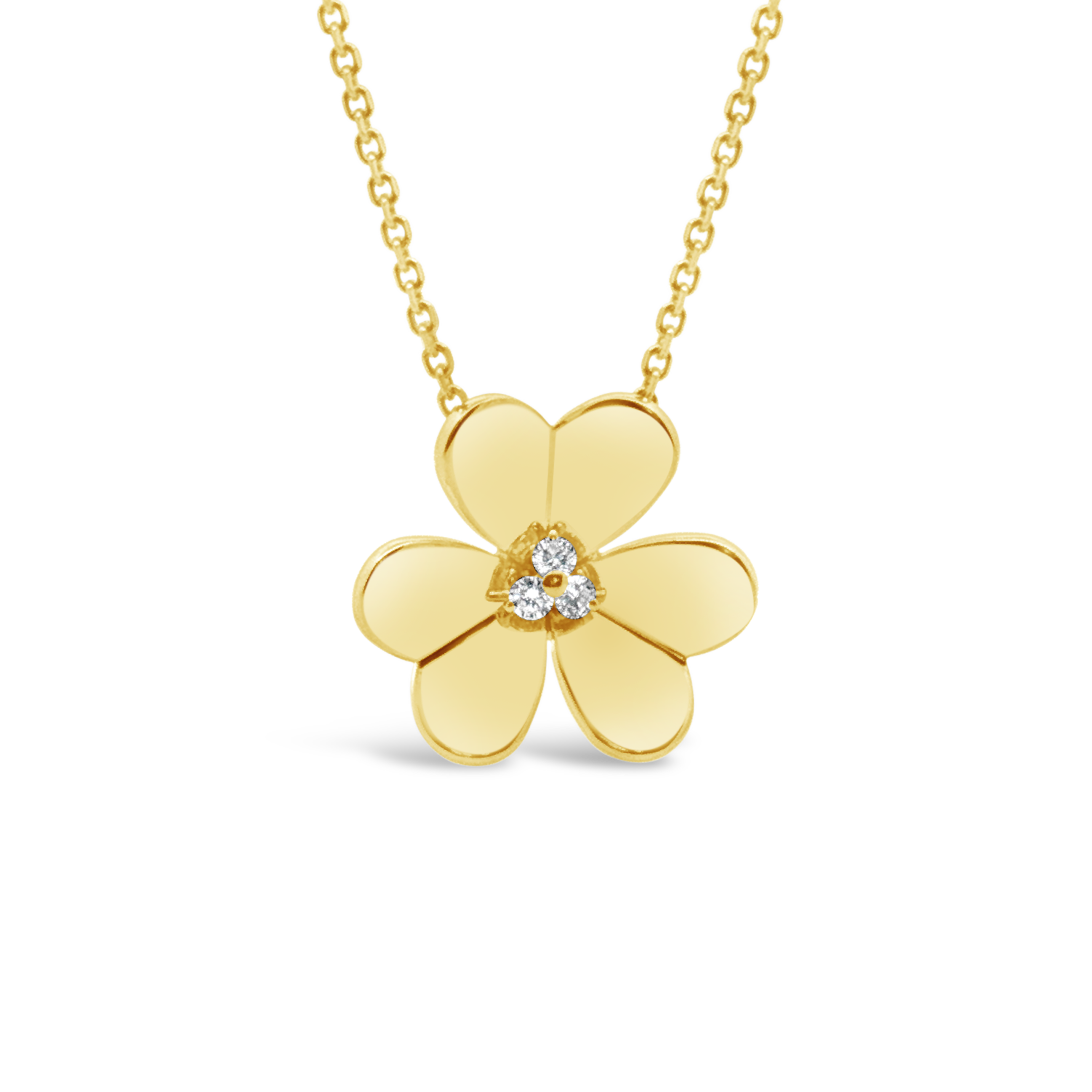 Yellow gold and round diamond pendant and earrings set in a flower design.