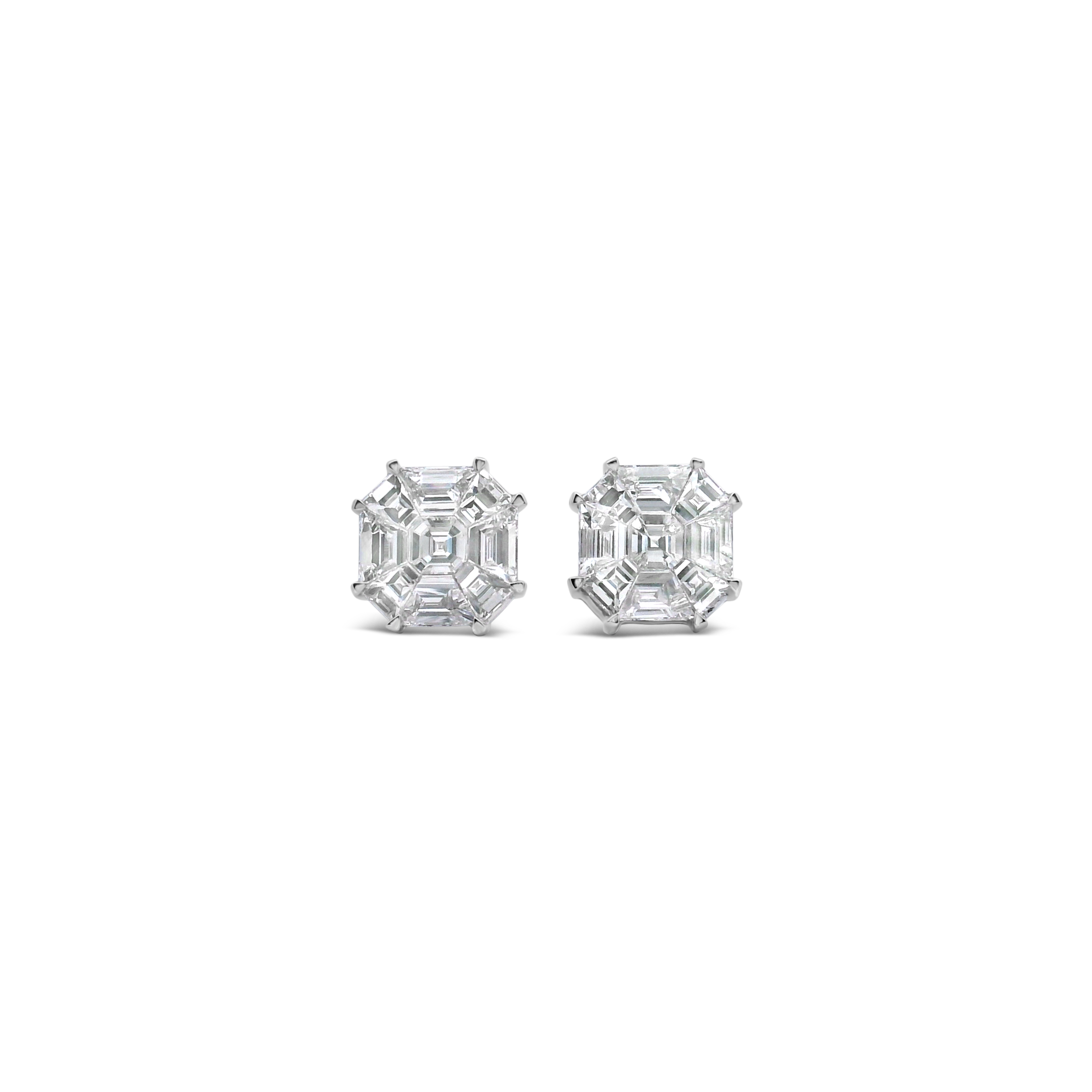 Fancy cut diamonds illusion set in 18k white gold in these earrings. Total weight of the diamonds is 2.45 carats.
