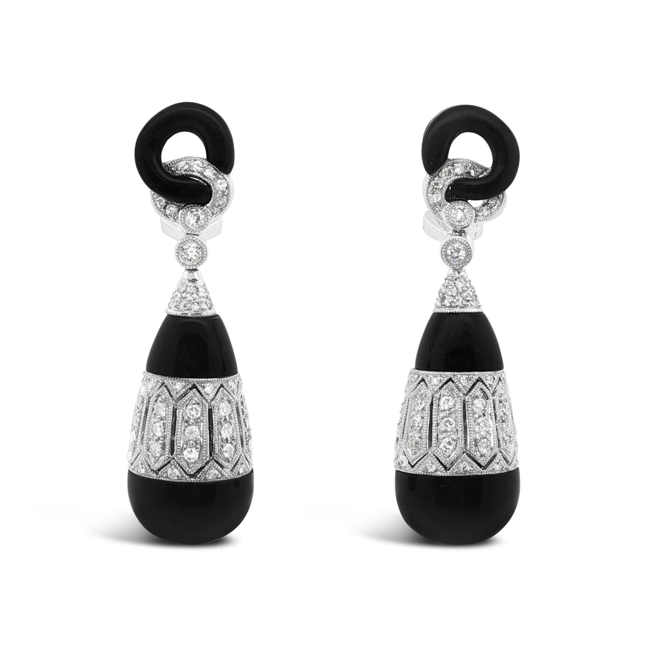 Diamonds and onyx set in 18k white gold in these dangle earrings. Total weight of the diamonds is .40 carats.
