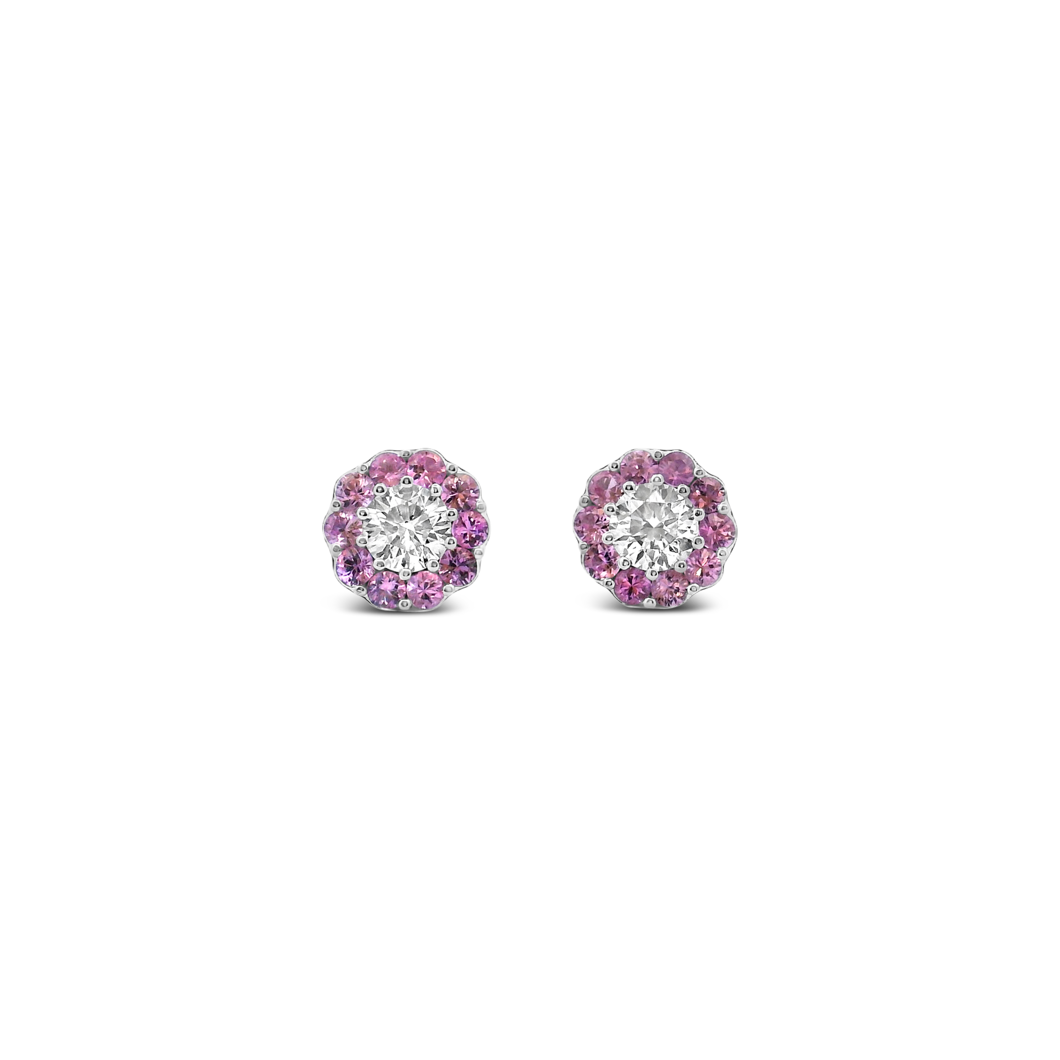 Round diamonds surrounded by round pink sapphires set in 14k white gold in these halo style earrings. Total weight of the diamonds is 1.37 carats. Total weight of the pink sapphires is 1.45 carats.