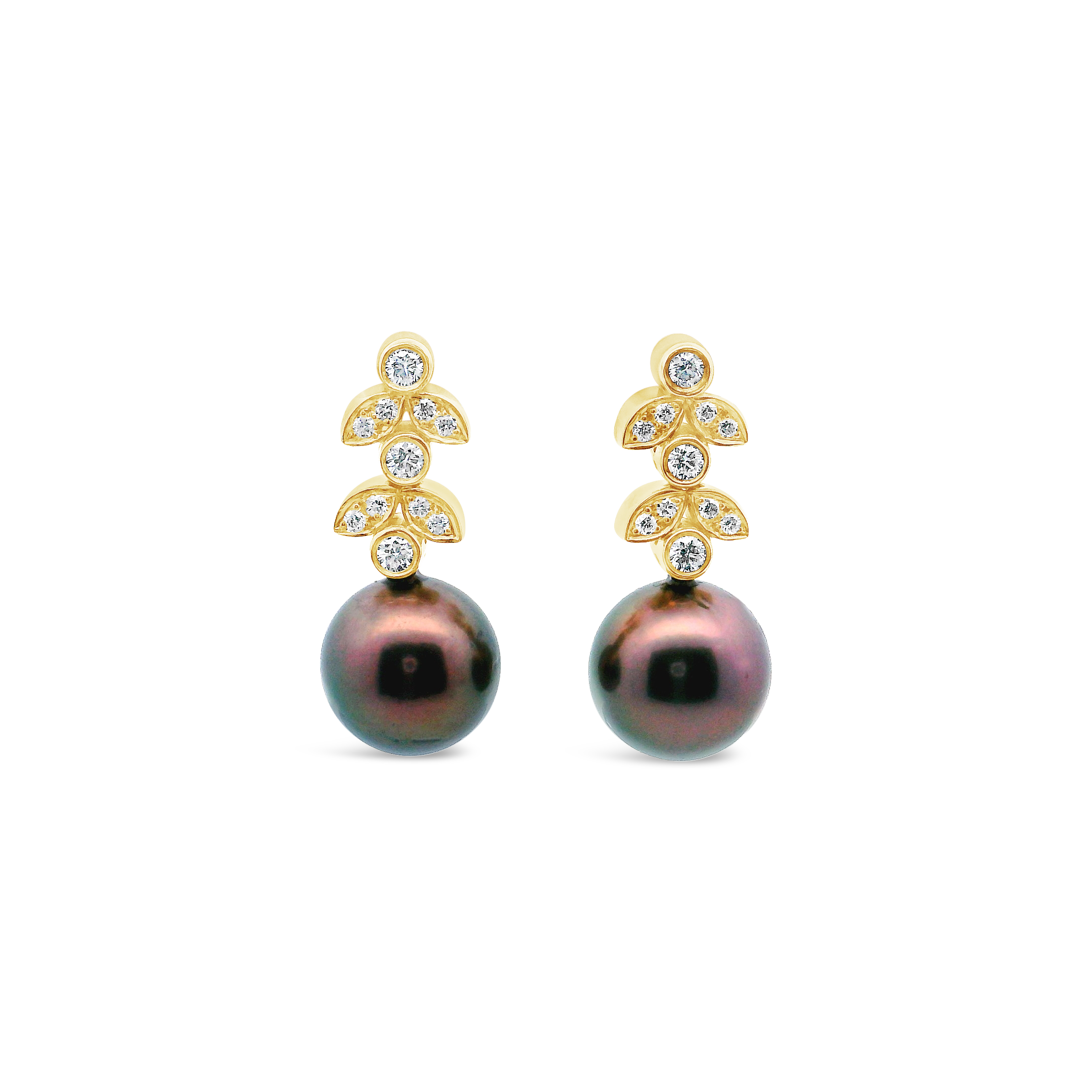 Tahitian pearls with round diamonds set in a leaf design in 18k yellow gold in these earrings. Total weight of the diamonds is .52 carat.