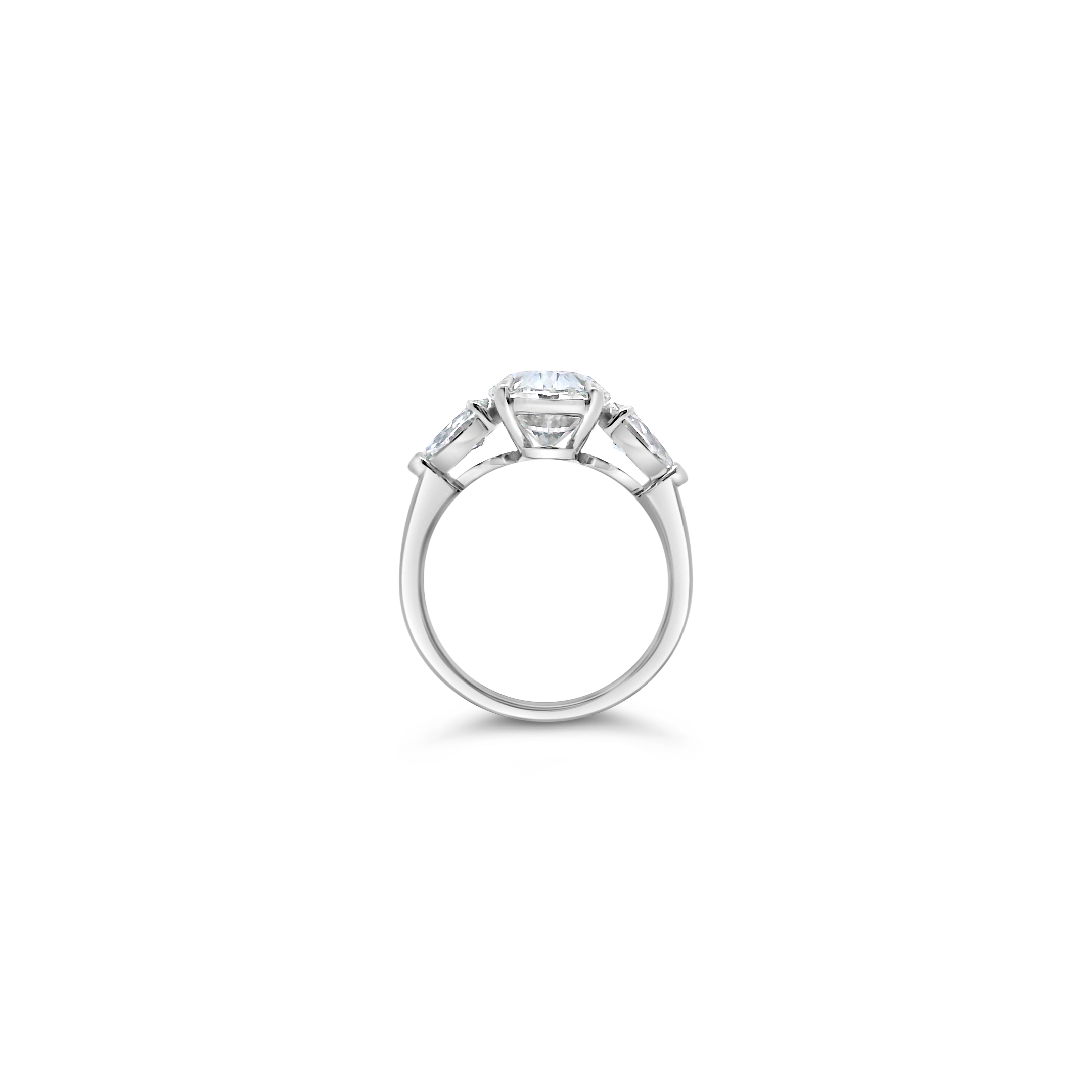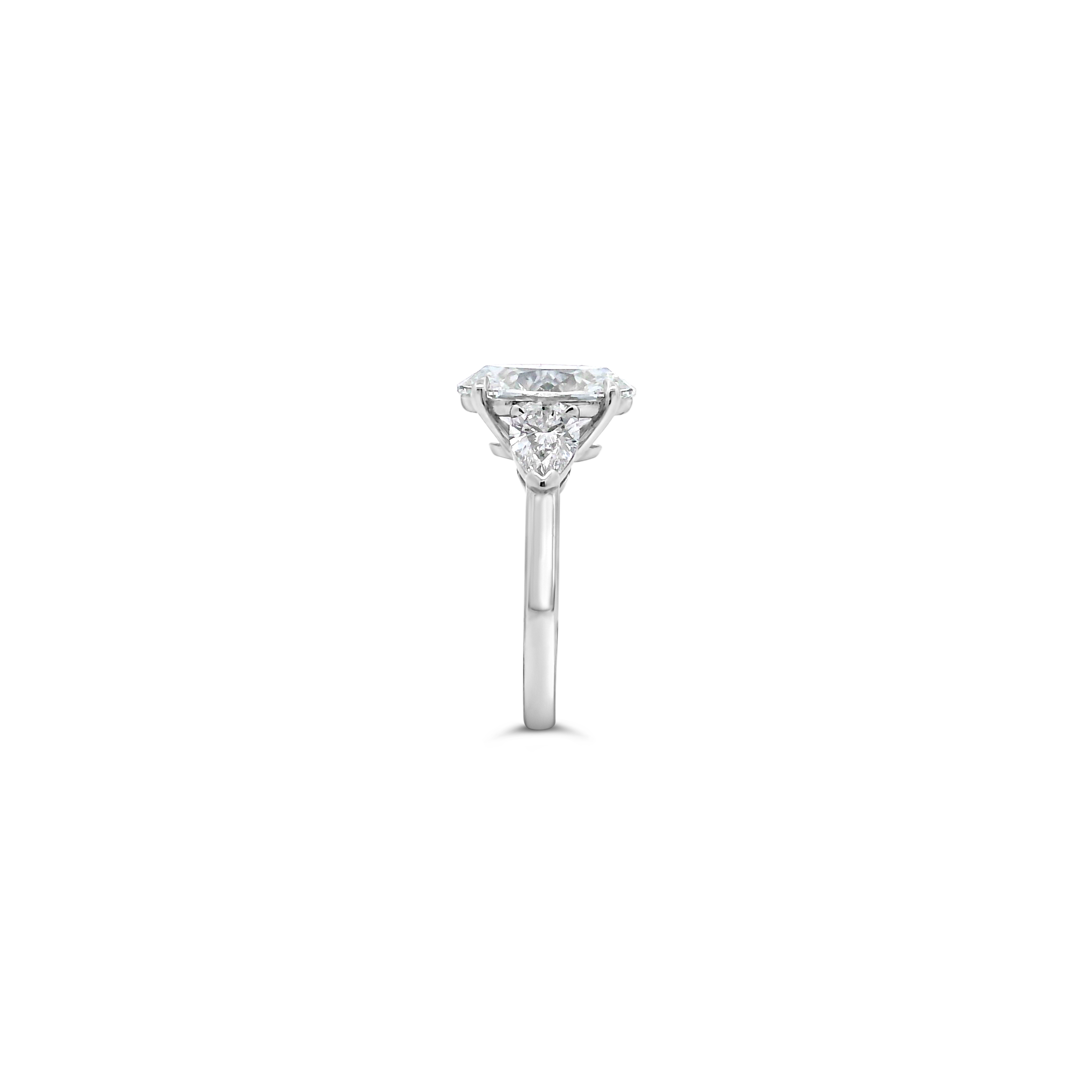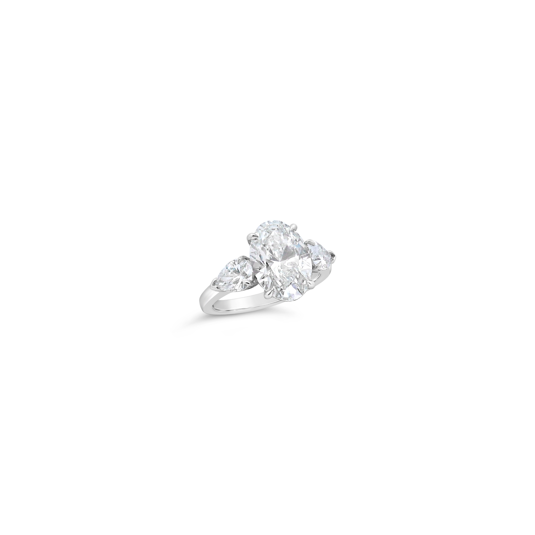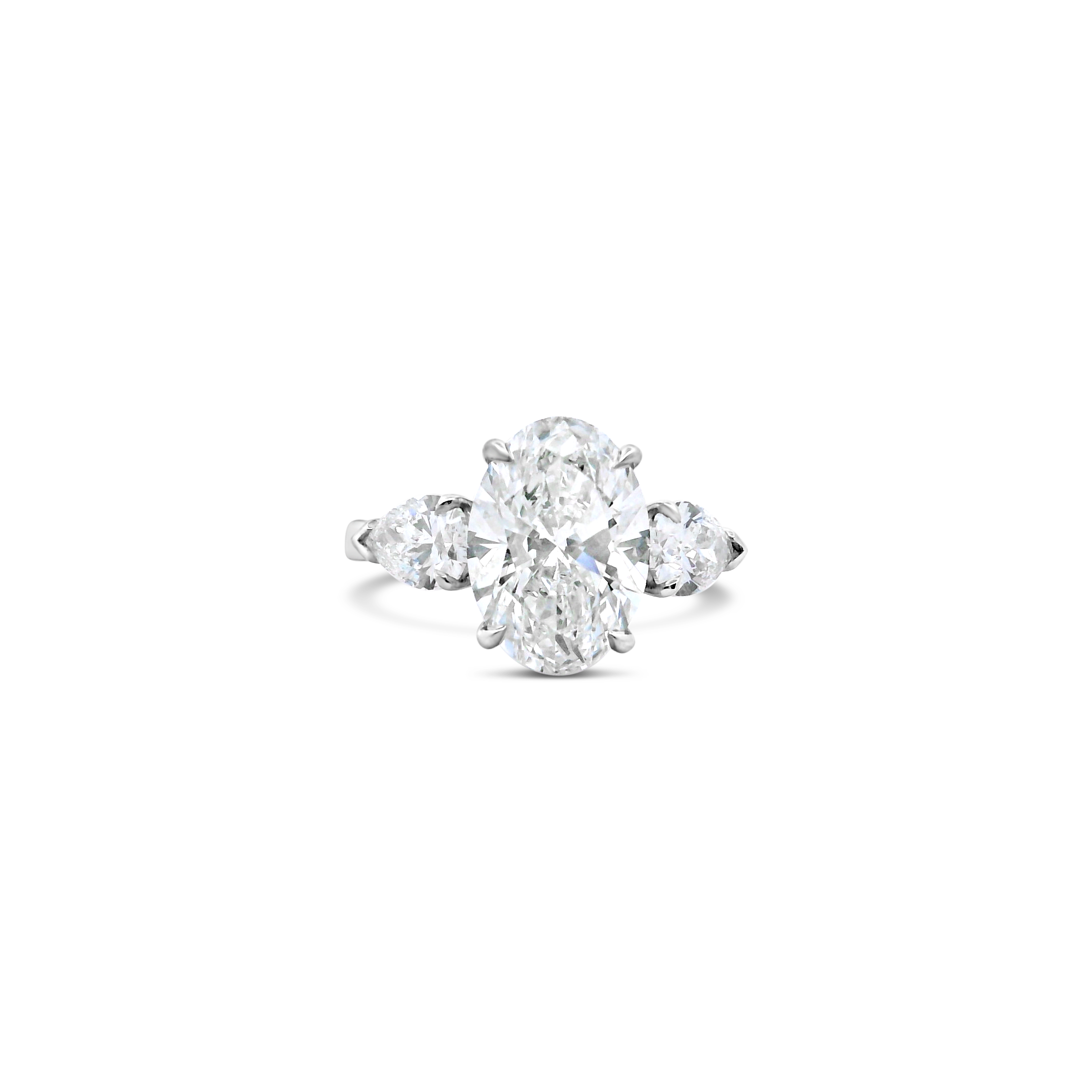 Oval diamond flanked by pear shaped diamonds set in platinum in this three stone engagement ring. Weight of the oval diamond is 3.53 carats. Total weight of the pear shaped diamonds is 1.00 carat.