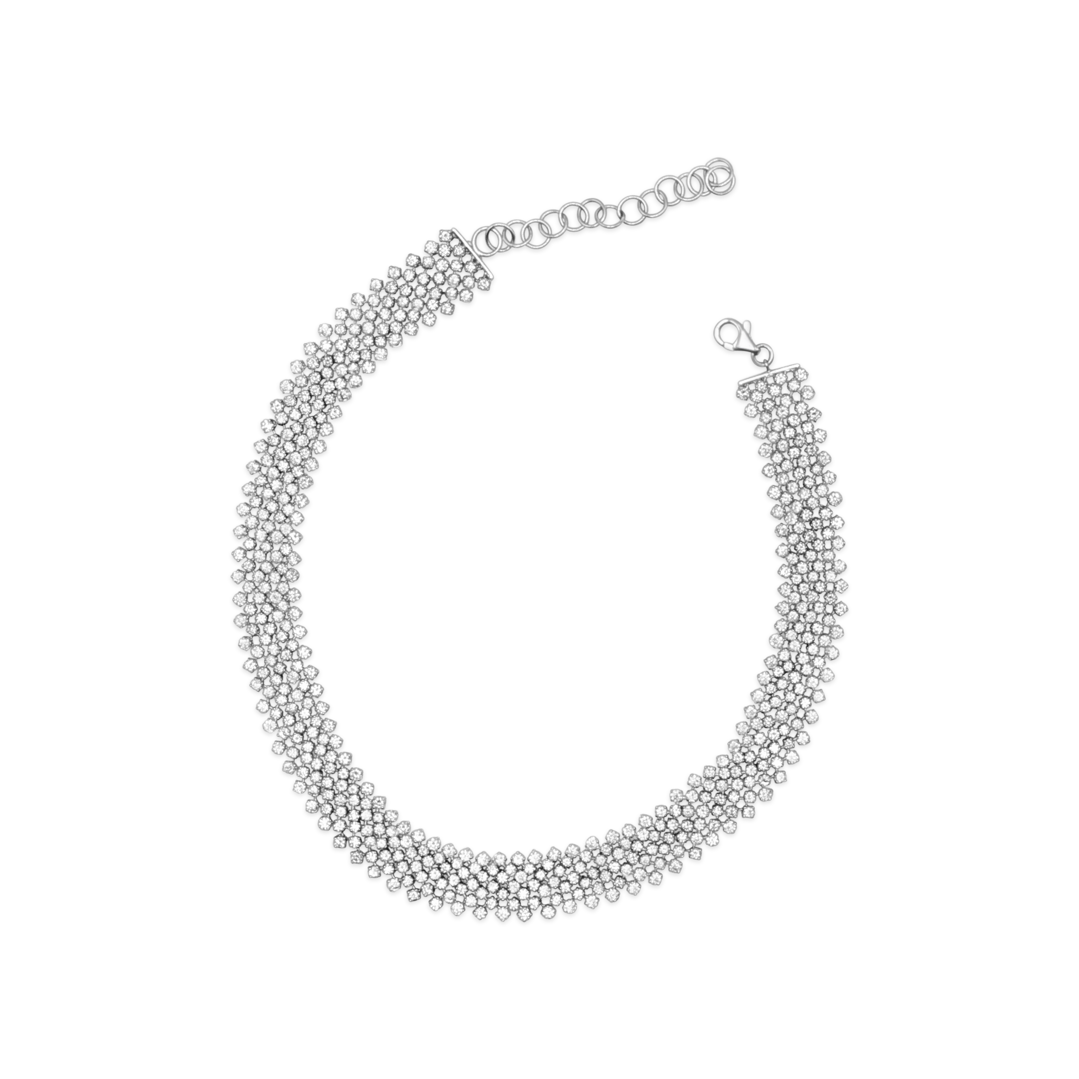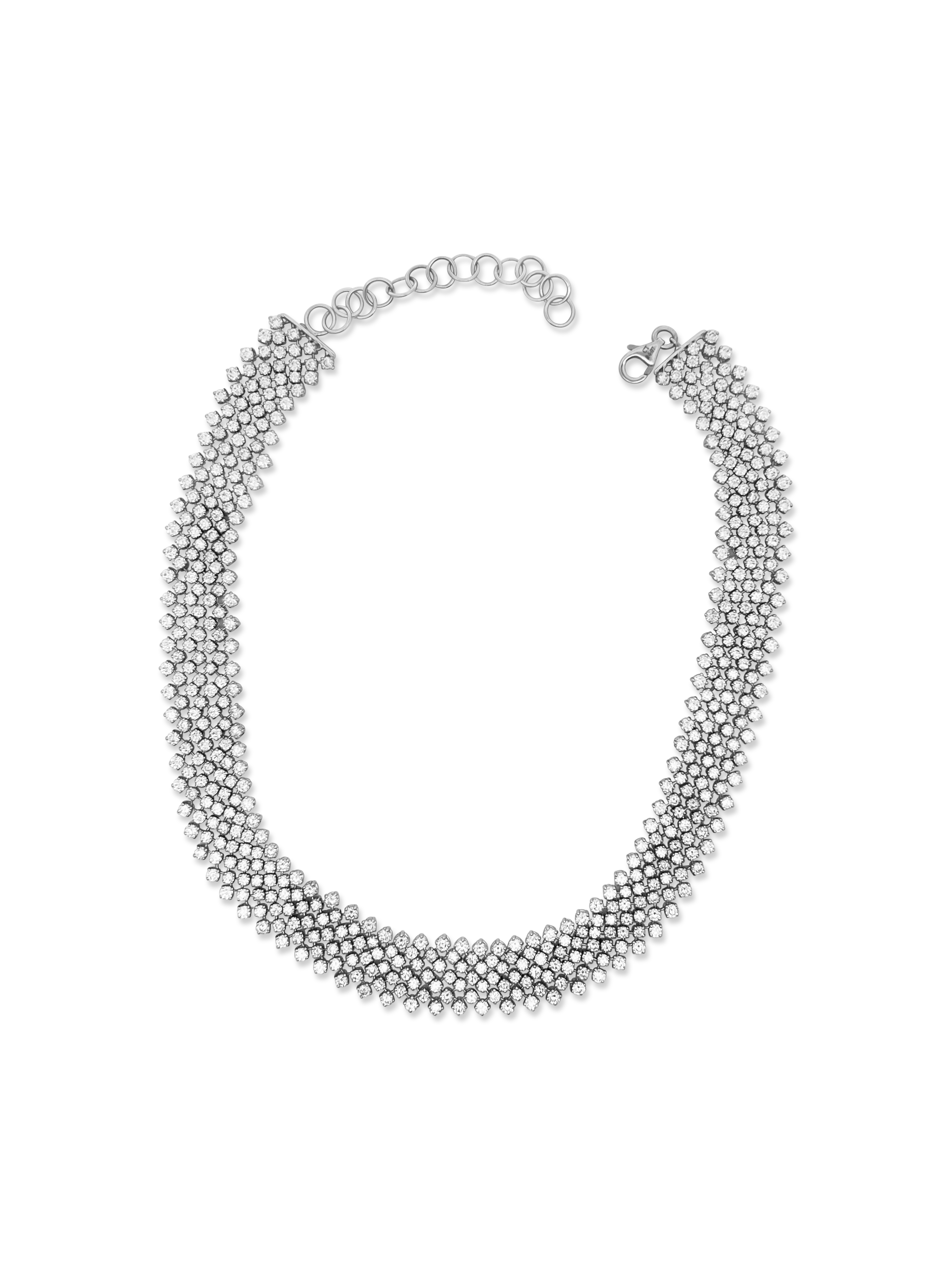 Round diamonds set in 18k white gold in this choker necklace. Total weight of the diamonds is 14.07 carats.
