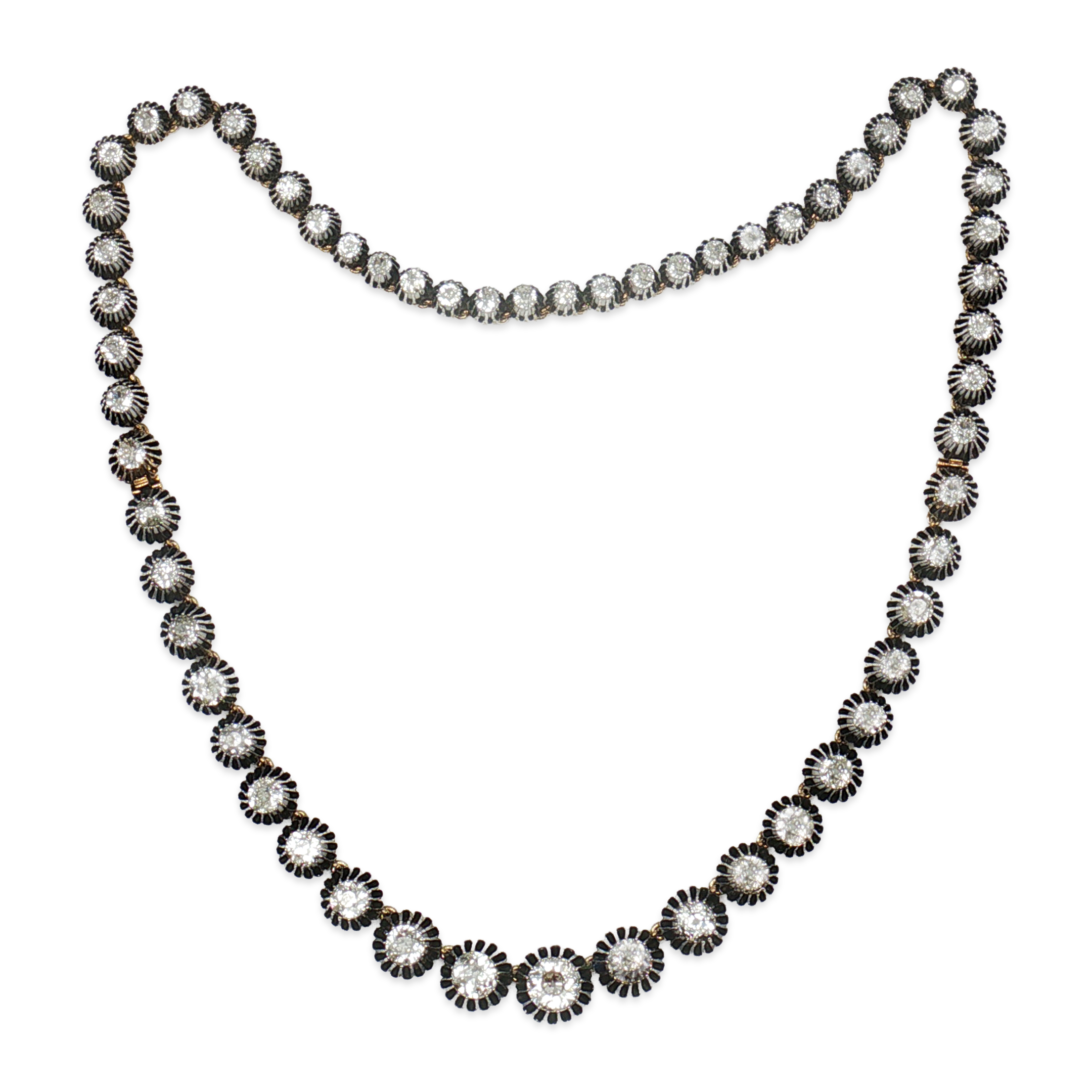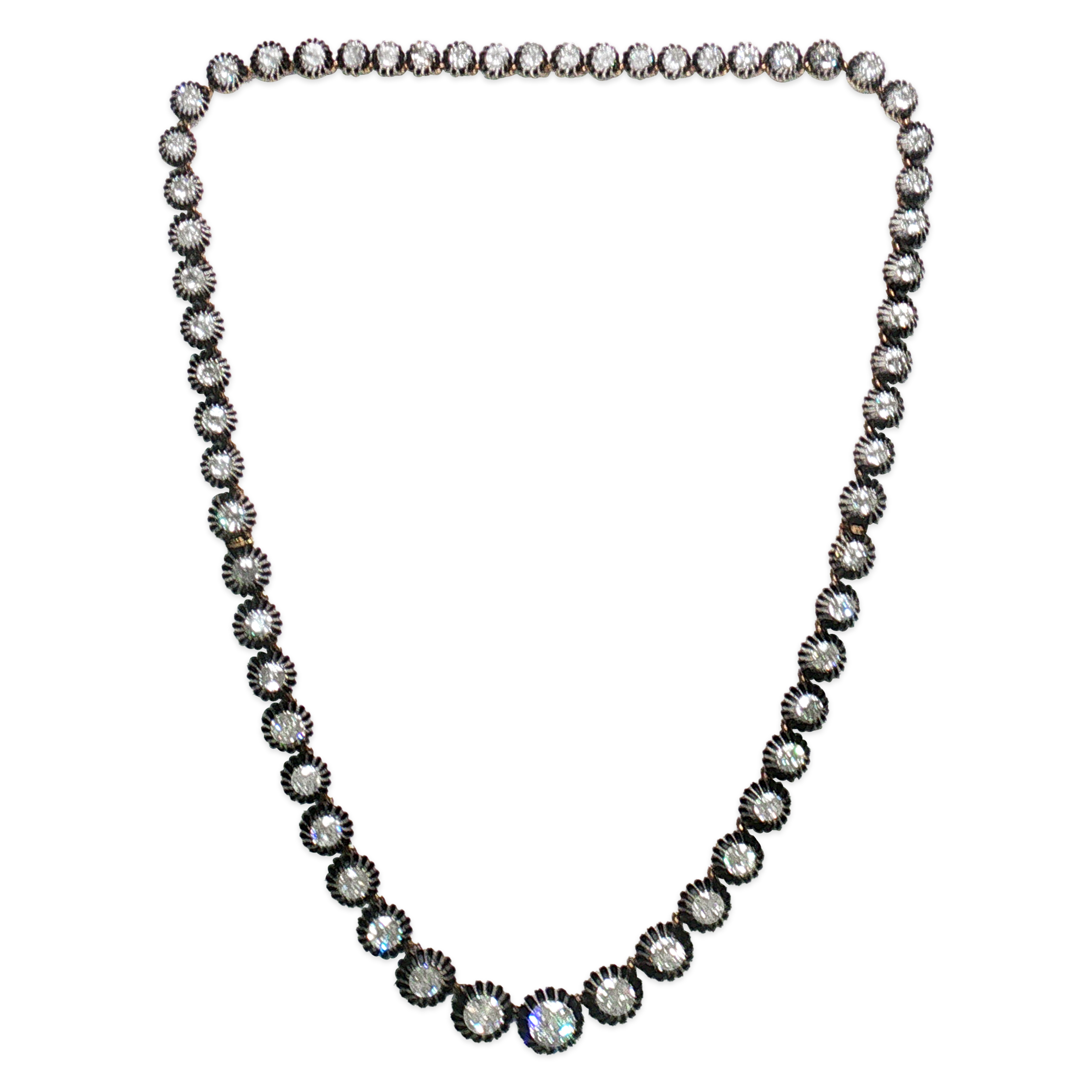 Button back collet set diamond Riviera necklace in silver on gold. Total diamond weight is 20.98 carats.