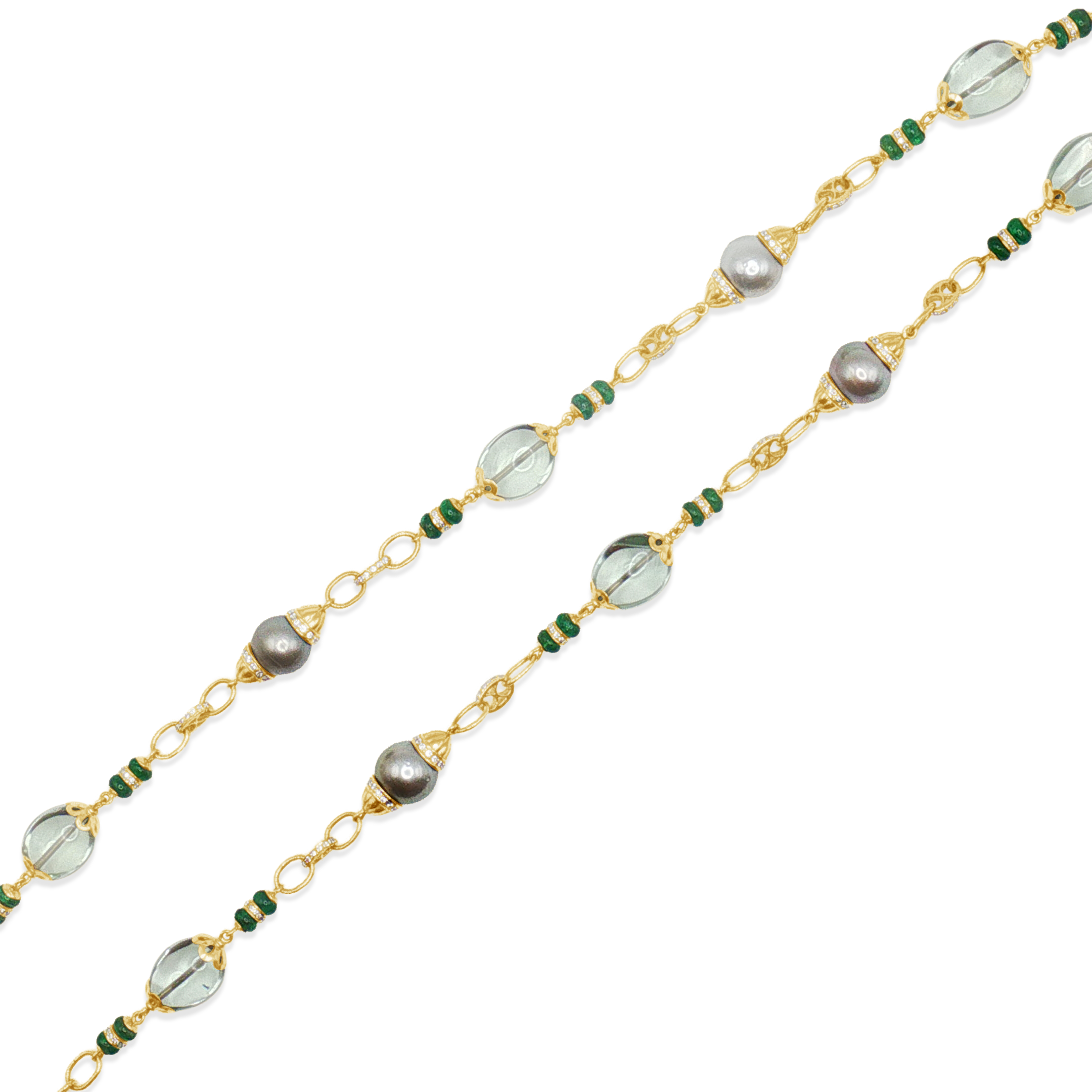 Emerald beads, aquamarine beads, Tahitian pearl and diamonds set in 18k yellow gold in this estate necklace.  Since this is from an estate, its availability is subject to prior sale.
