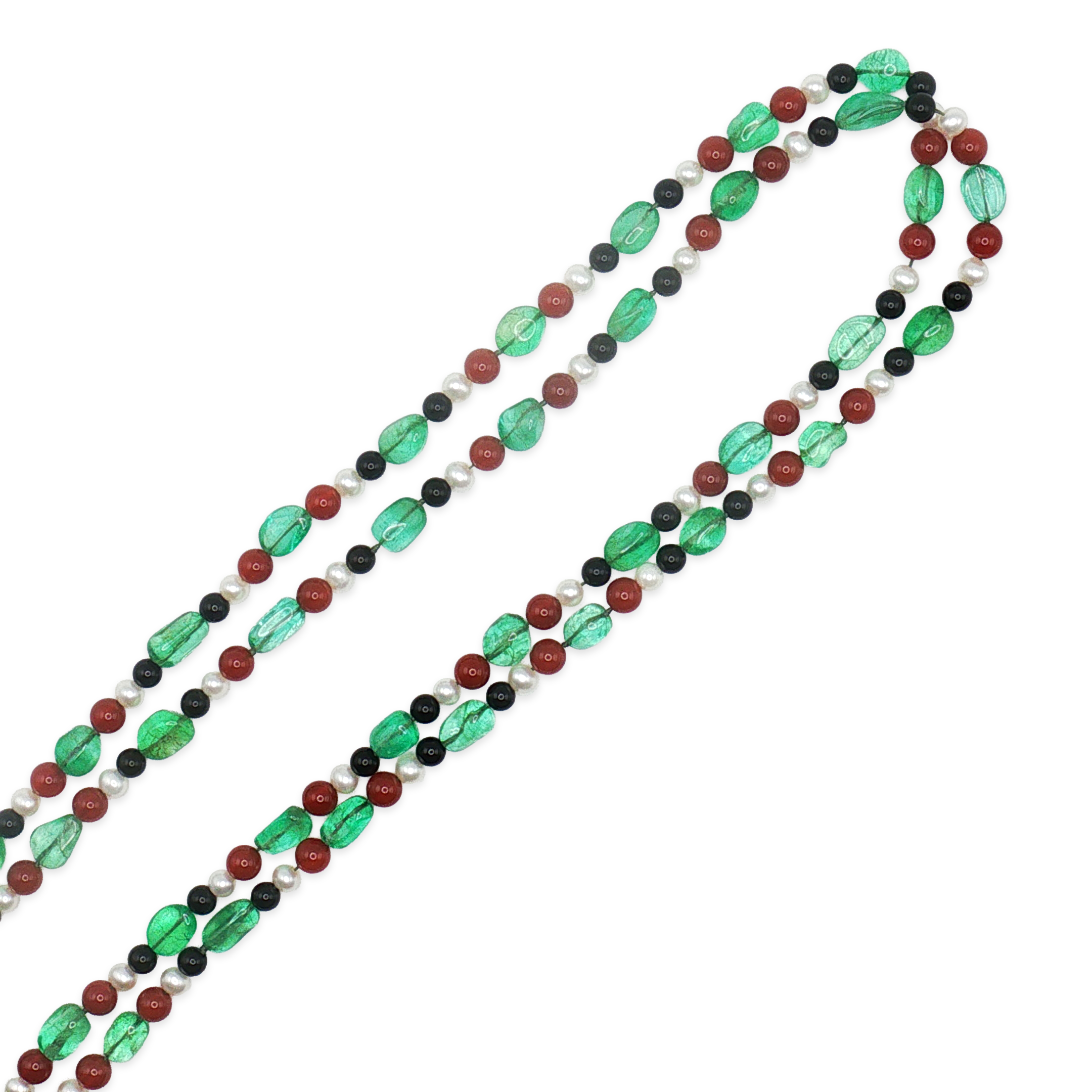 Emerald, ruby and onyx beads with pearls in this necklace. Total carat weight is 113.55.