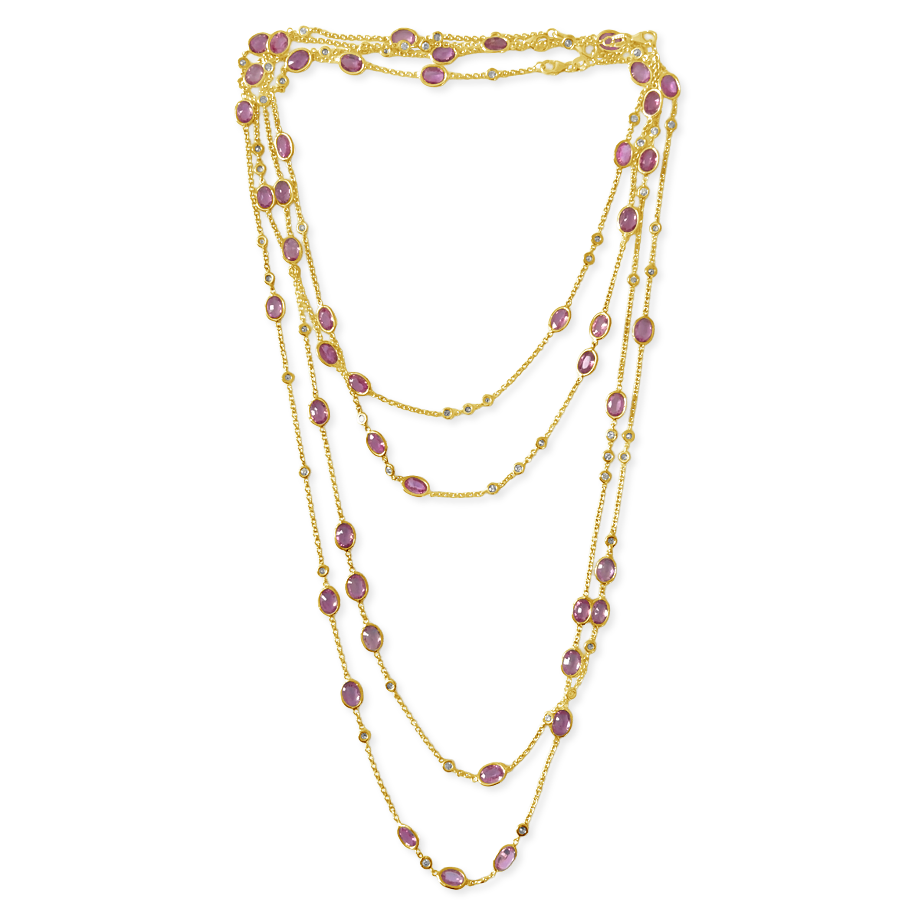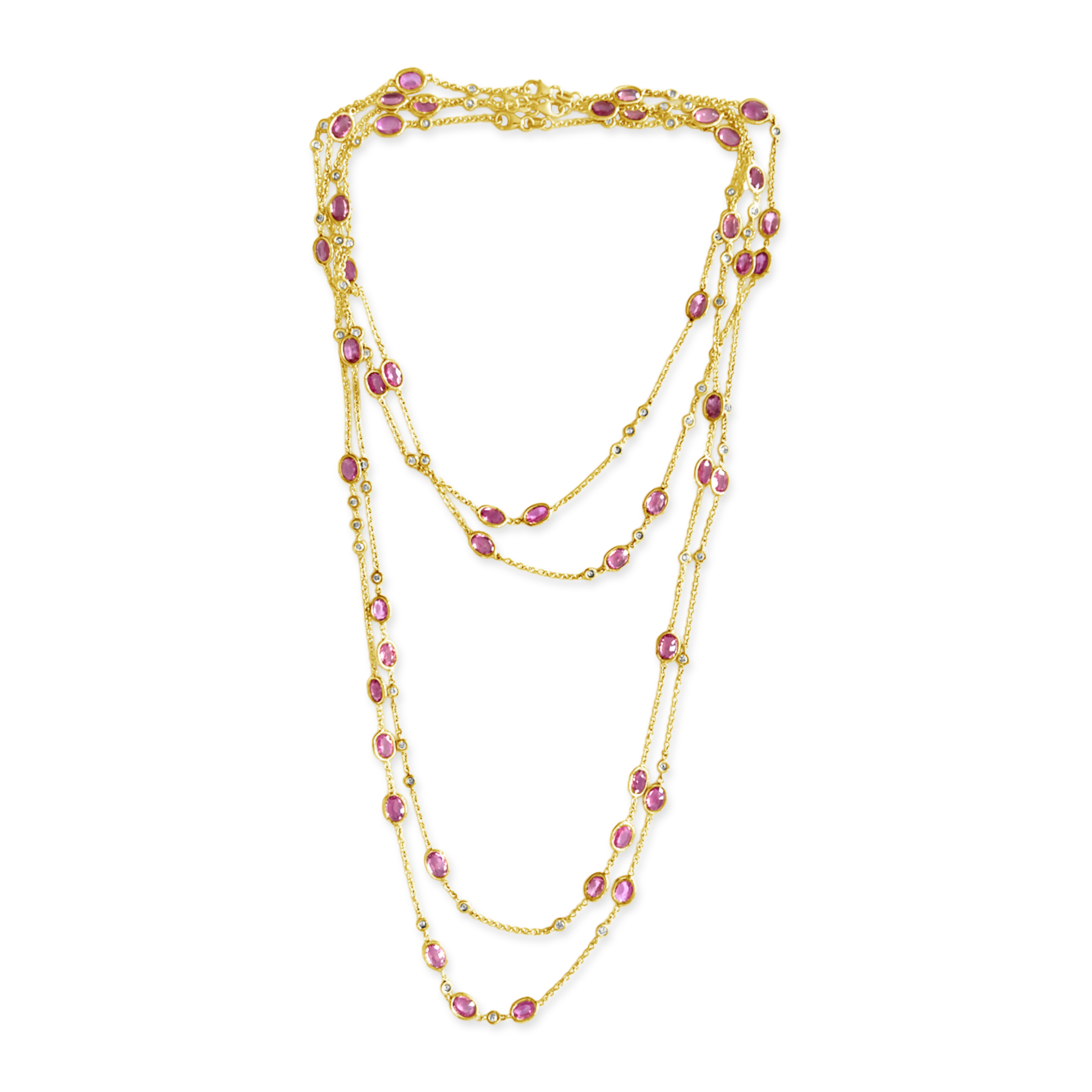 Oval pink sapphires bezel set in 18k yellow gold in this necklace.