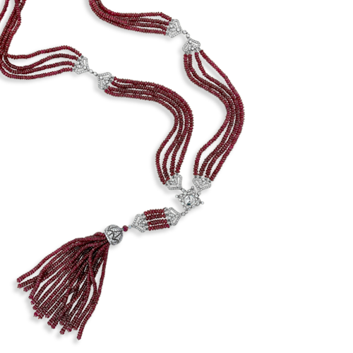 Ruby beads with round diamonds set in platinum in this tassel necklace. Total weight of the rubies is 307.00 carats. Total diamond weight is 5.57 carats.