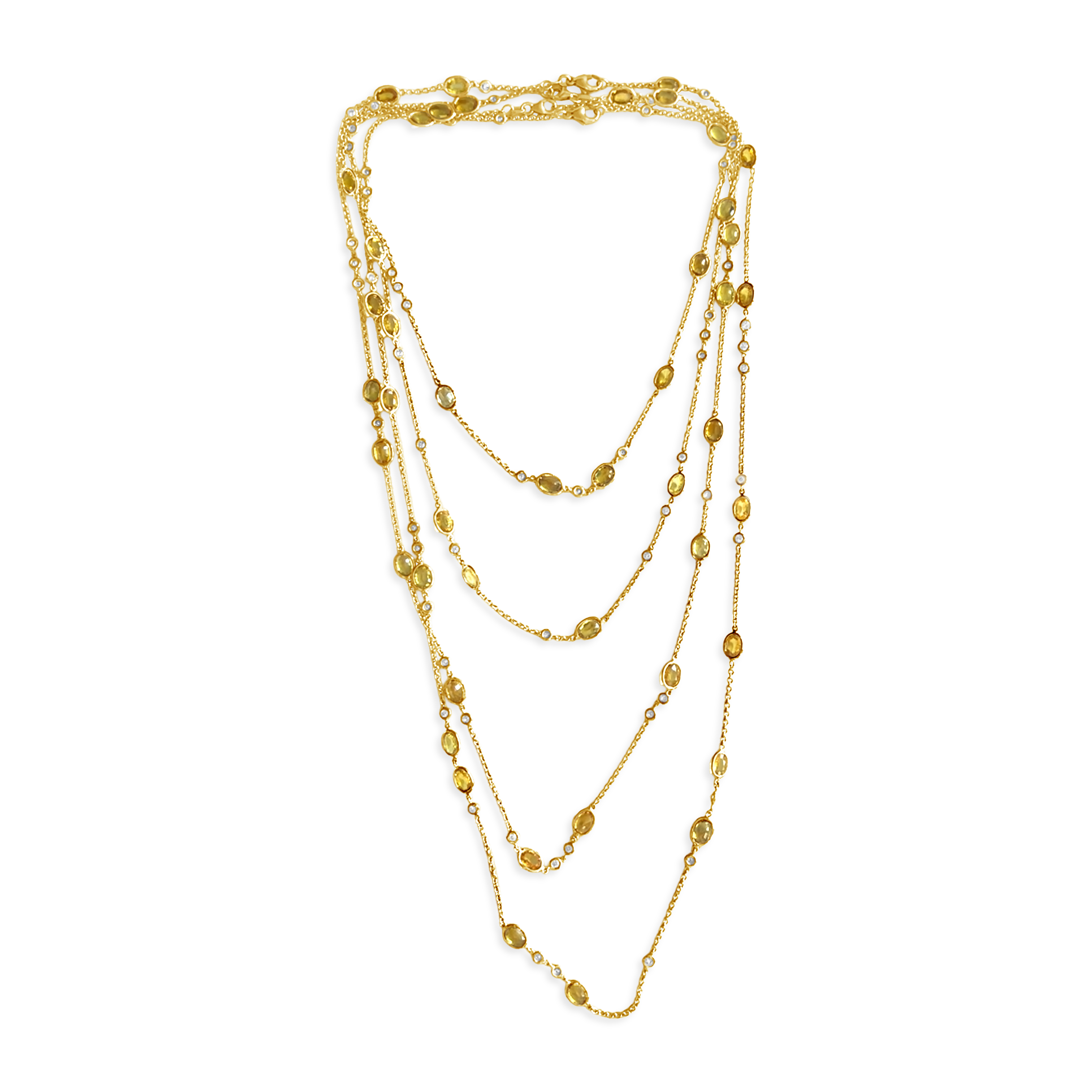 Oval yellow sapphires and round diamonds bezel set in 18k yellow gold in this necklace.