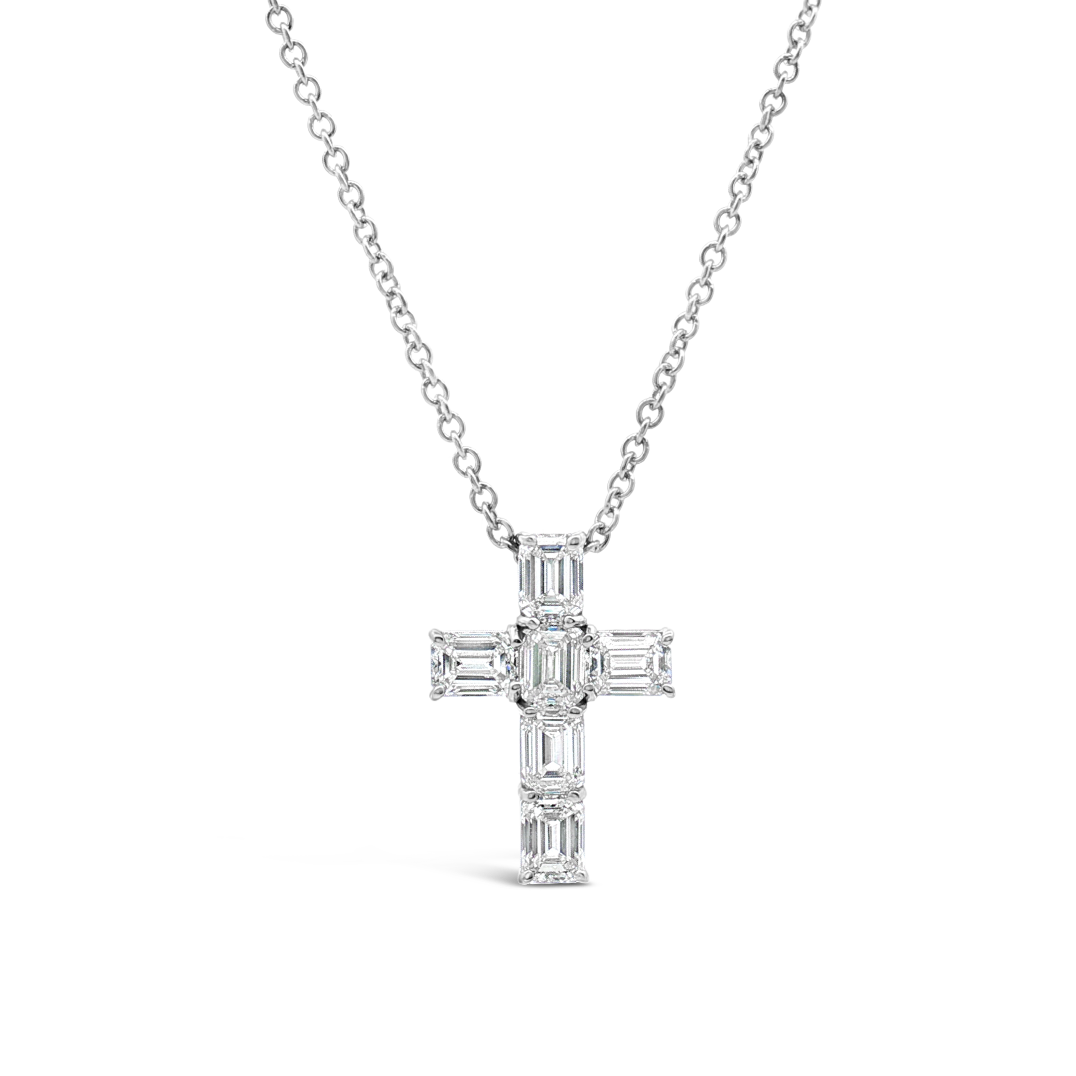 Emerald cut diamonds set in 18k white gold in this cross pendant. Total weight of the diamonds is 2.36 carats.