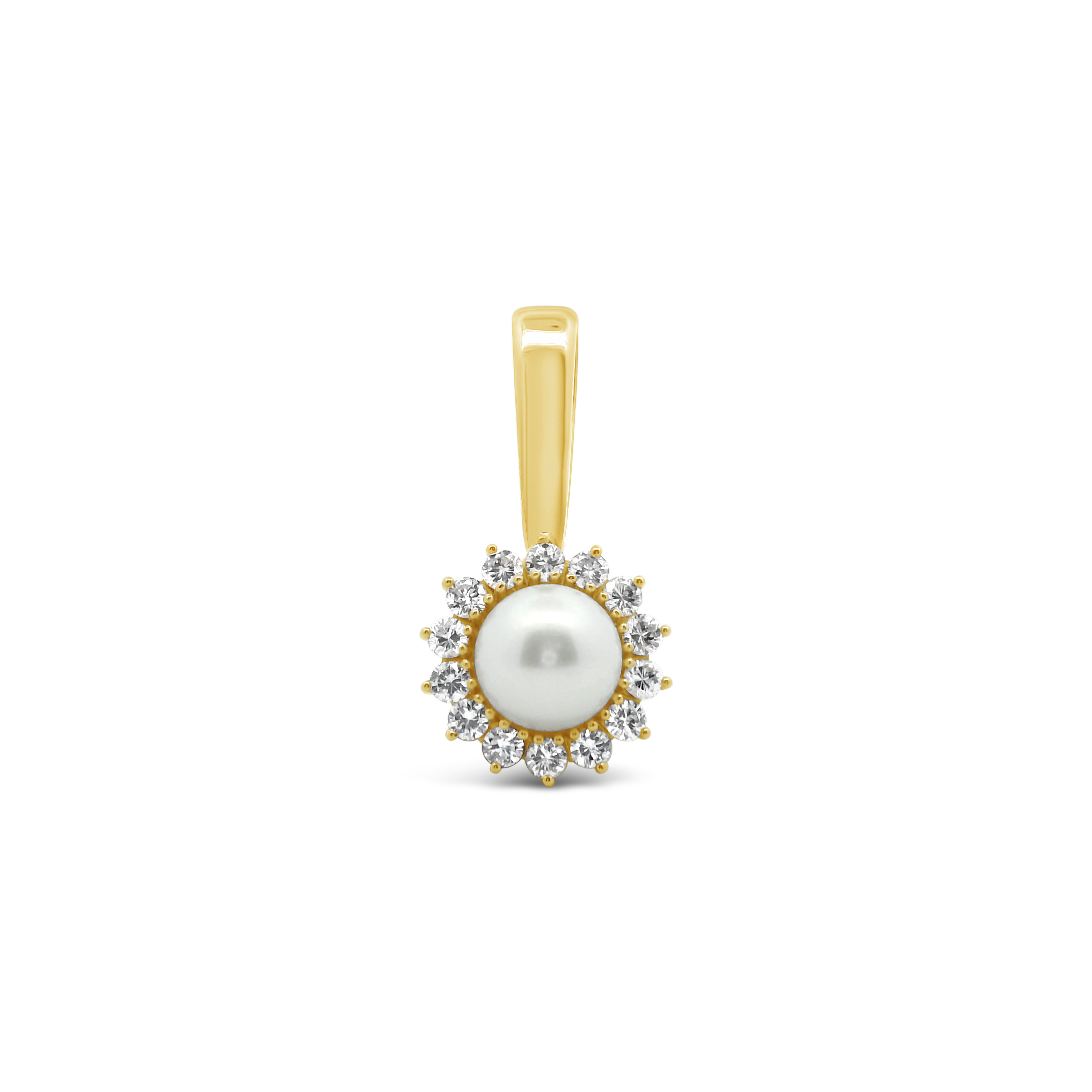 Mikimoto pearl surrounded by round diamonds set in 18k yellow gold in this pendant. Total diamond weight is .70 carat.