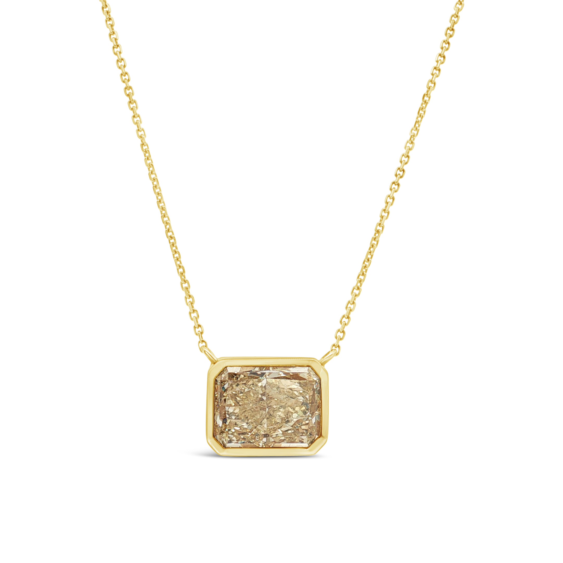 Radiant cut yellow diamond bezel set in an East/West fashion in 18k yellow gold in this pendant necklace. Weight of the diamond is 3.72 carats.