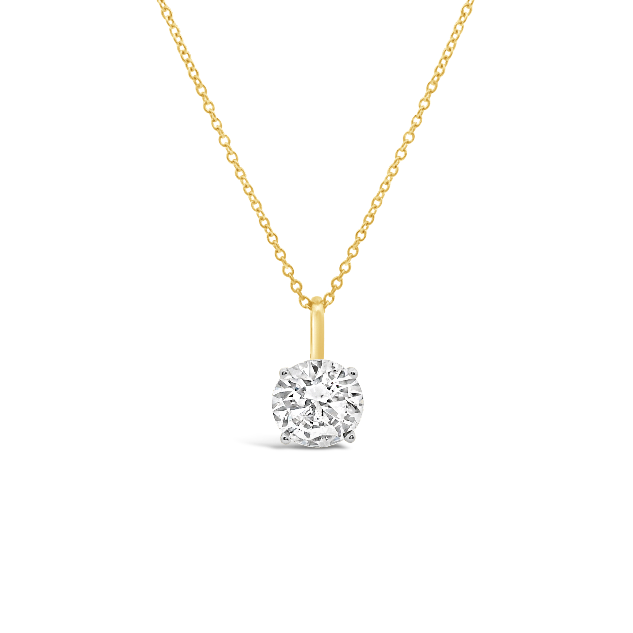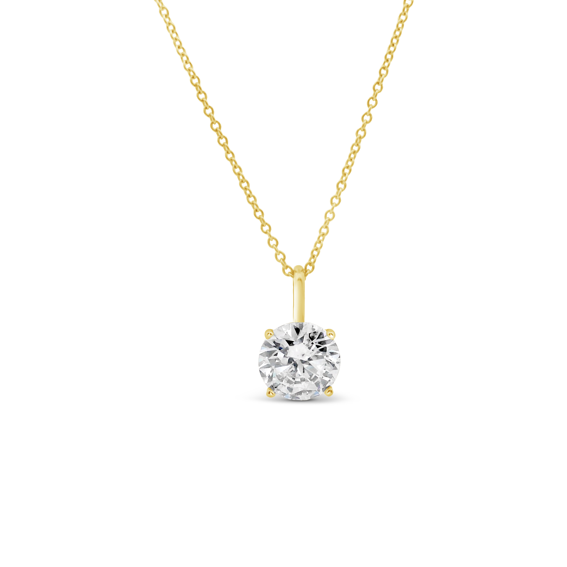 Round diamond prong set in 14k yellow gold in this solitaire style pendant. Diamond weight is 2.00 carats.