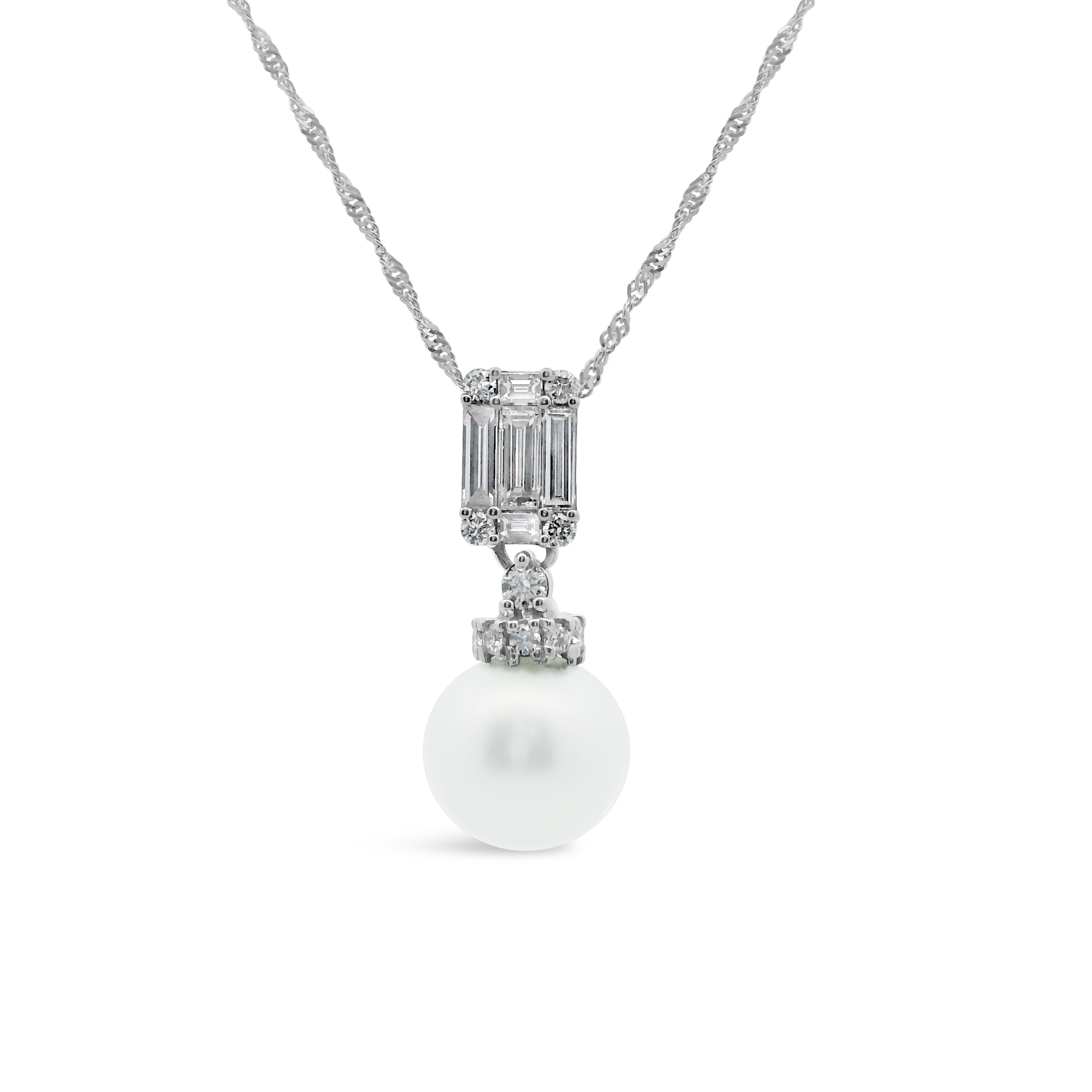 South Sea pearl with baguette and round diamonds set in 14k white gold in this pendant. Total weight of the diamonds is .89 carat.