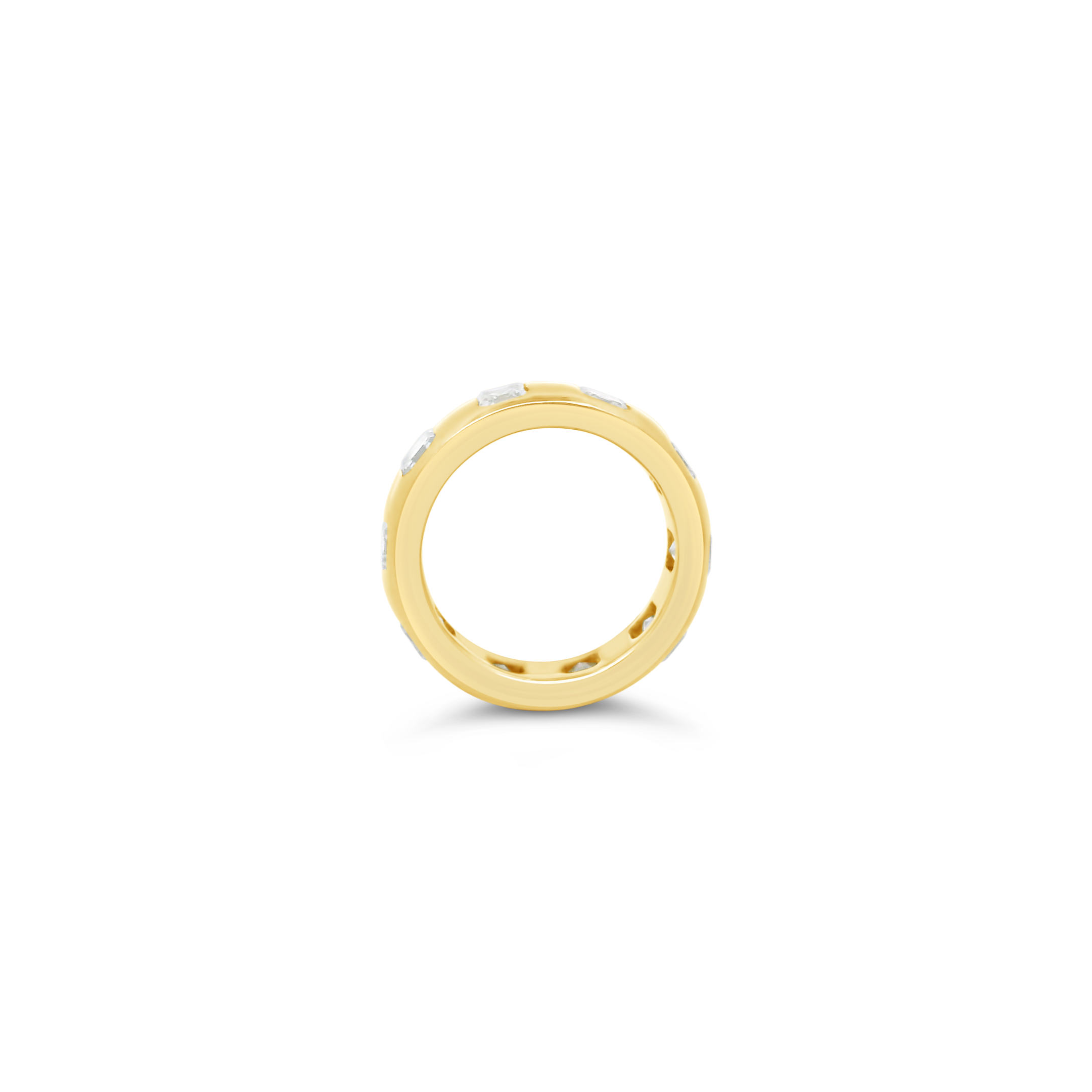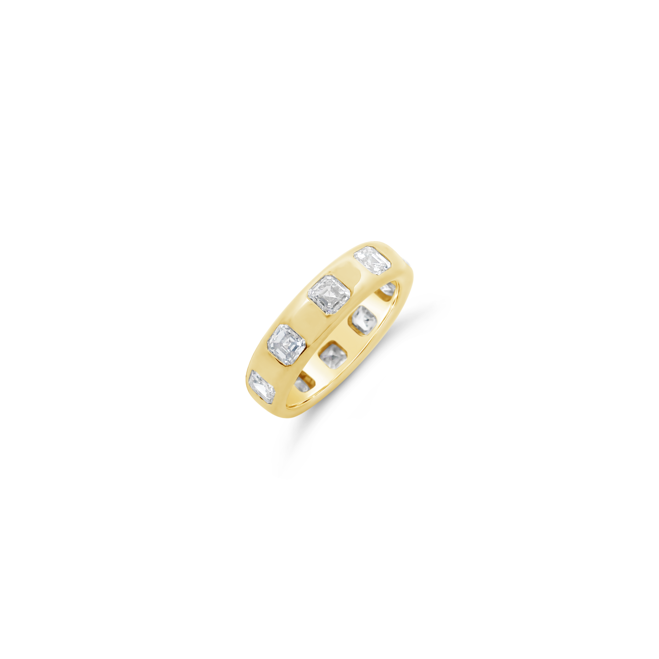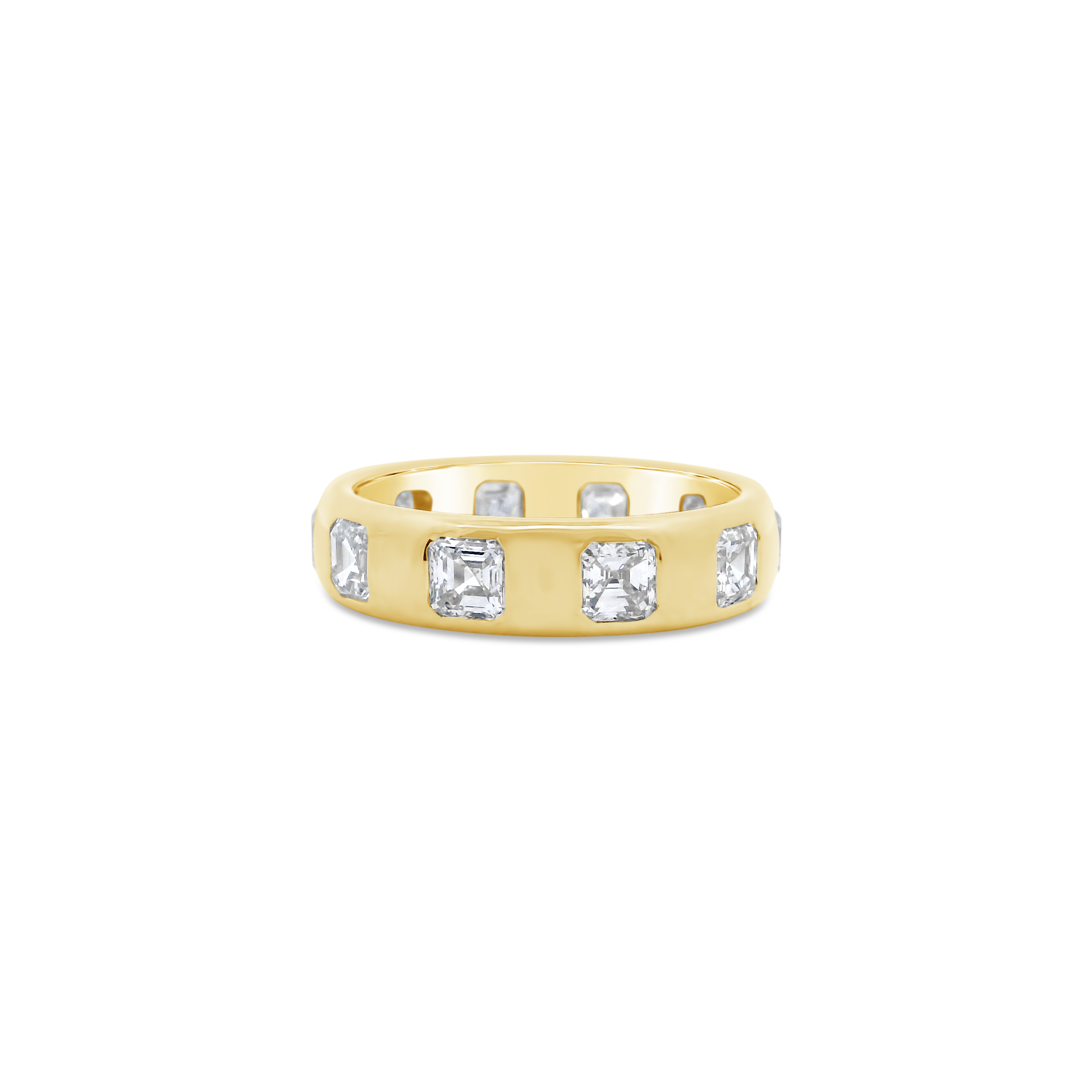Asscher cut diamonds set in 18k yellow gold in this band style ring. Total weight of the diamonds is 3.57 carats.
