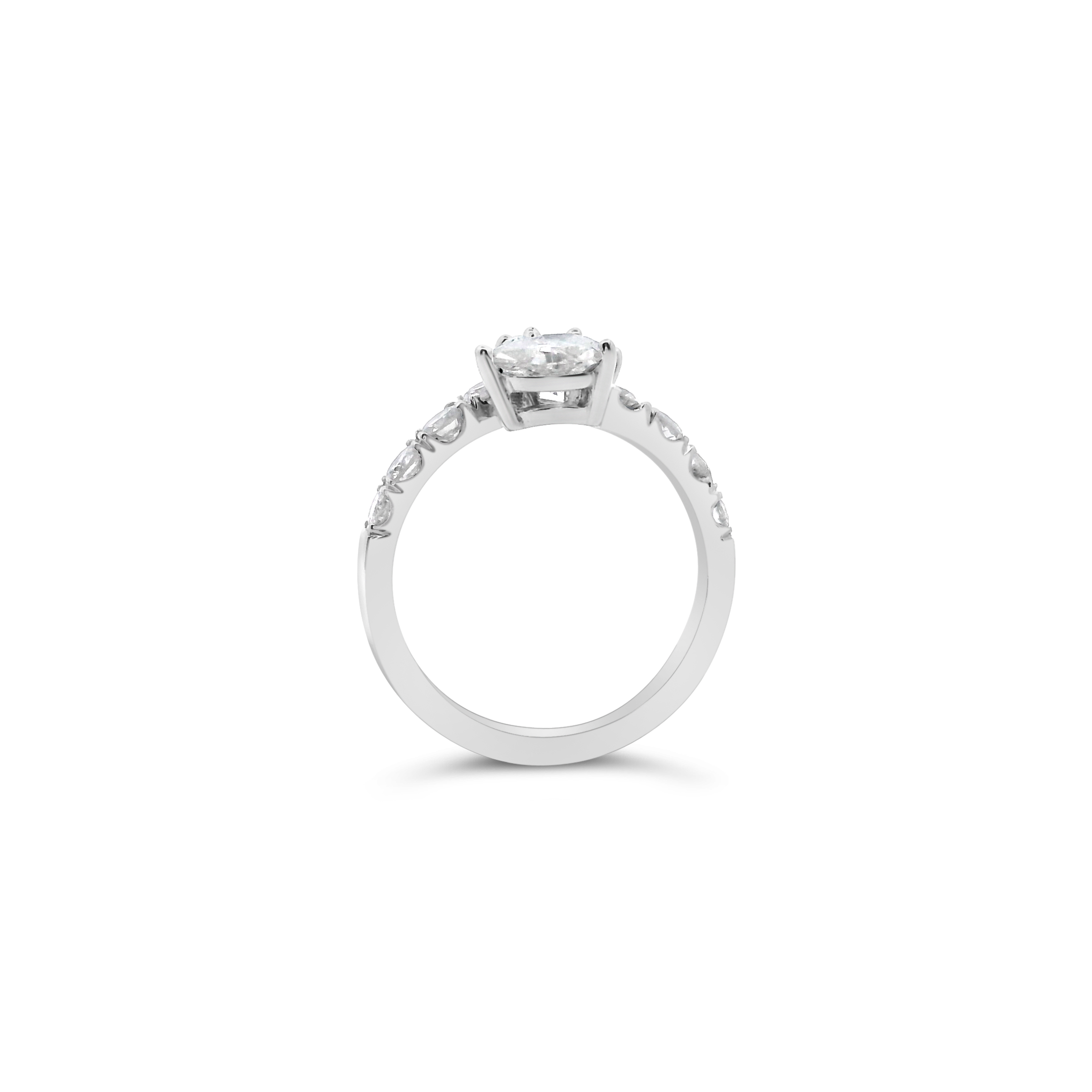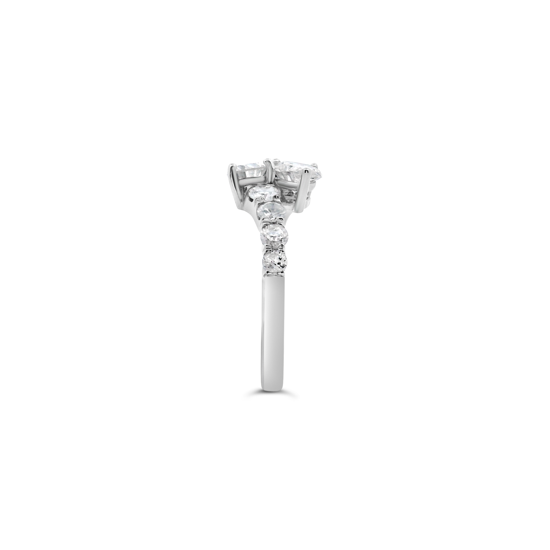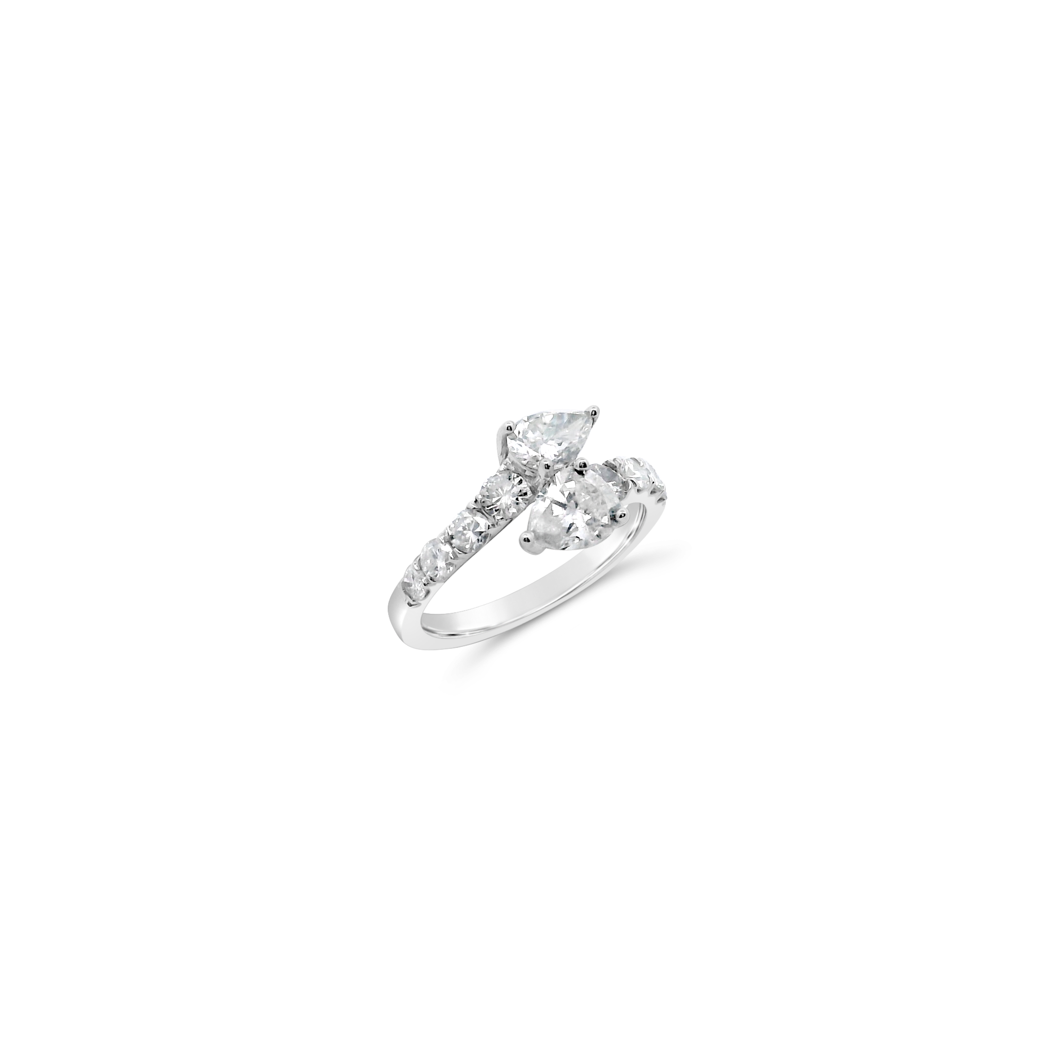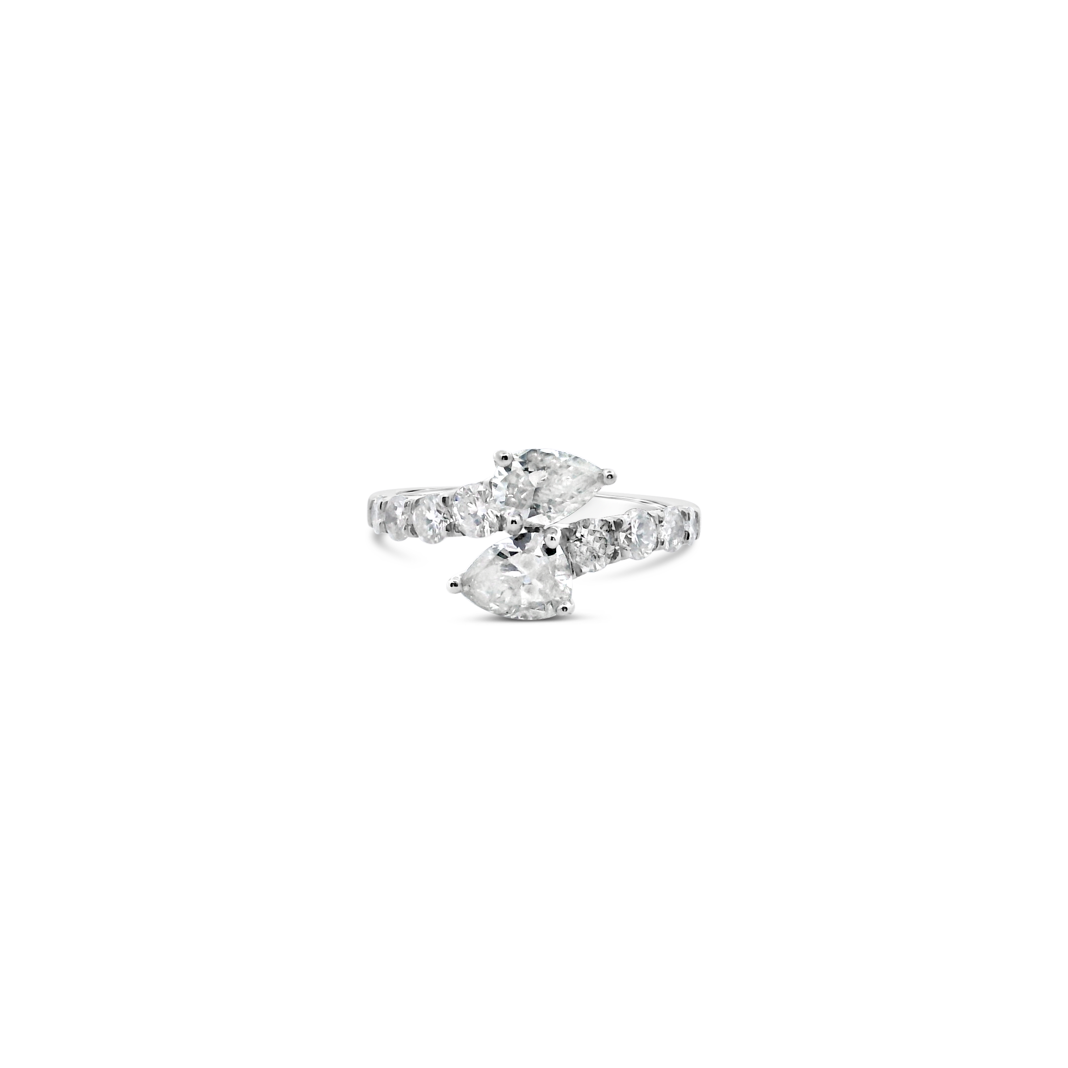 Pear shaped diamonds with round diamonds set in platinum in this bypass style ring. Total weight of the diamonds is 1.64 carats.
