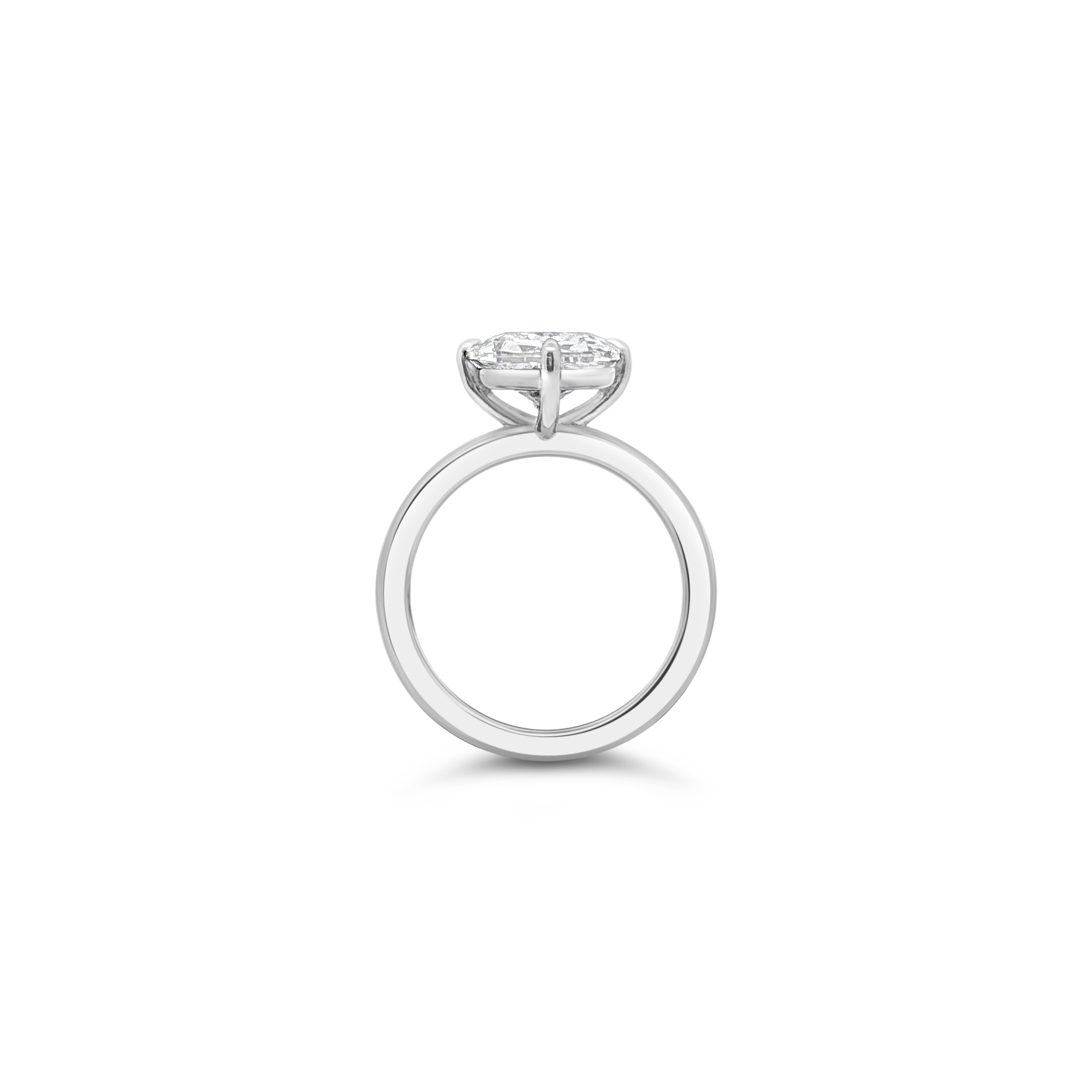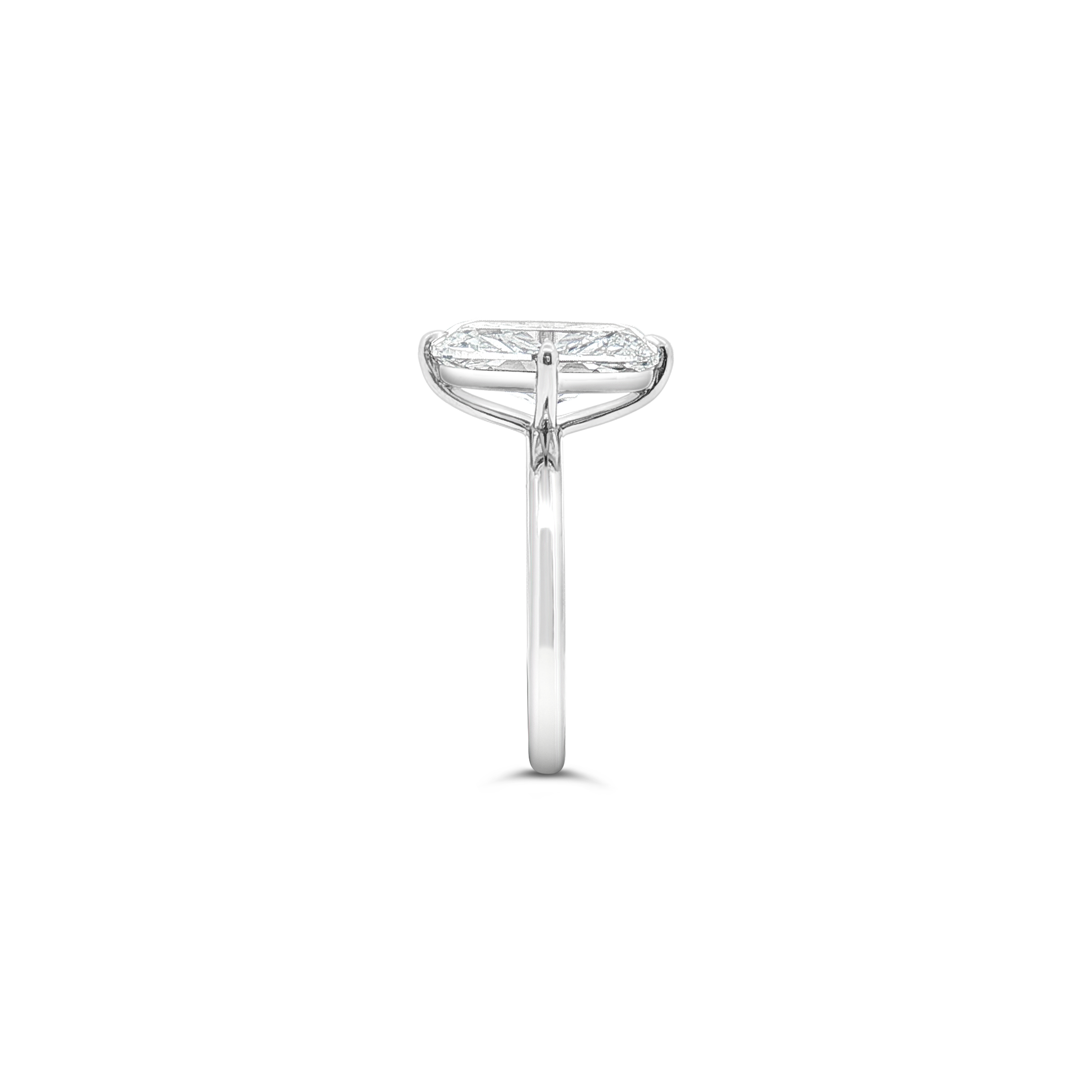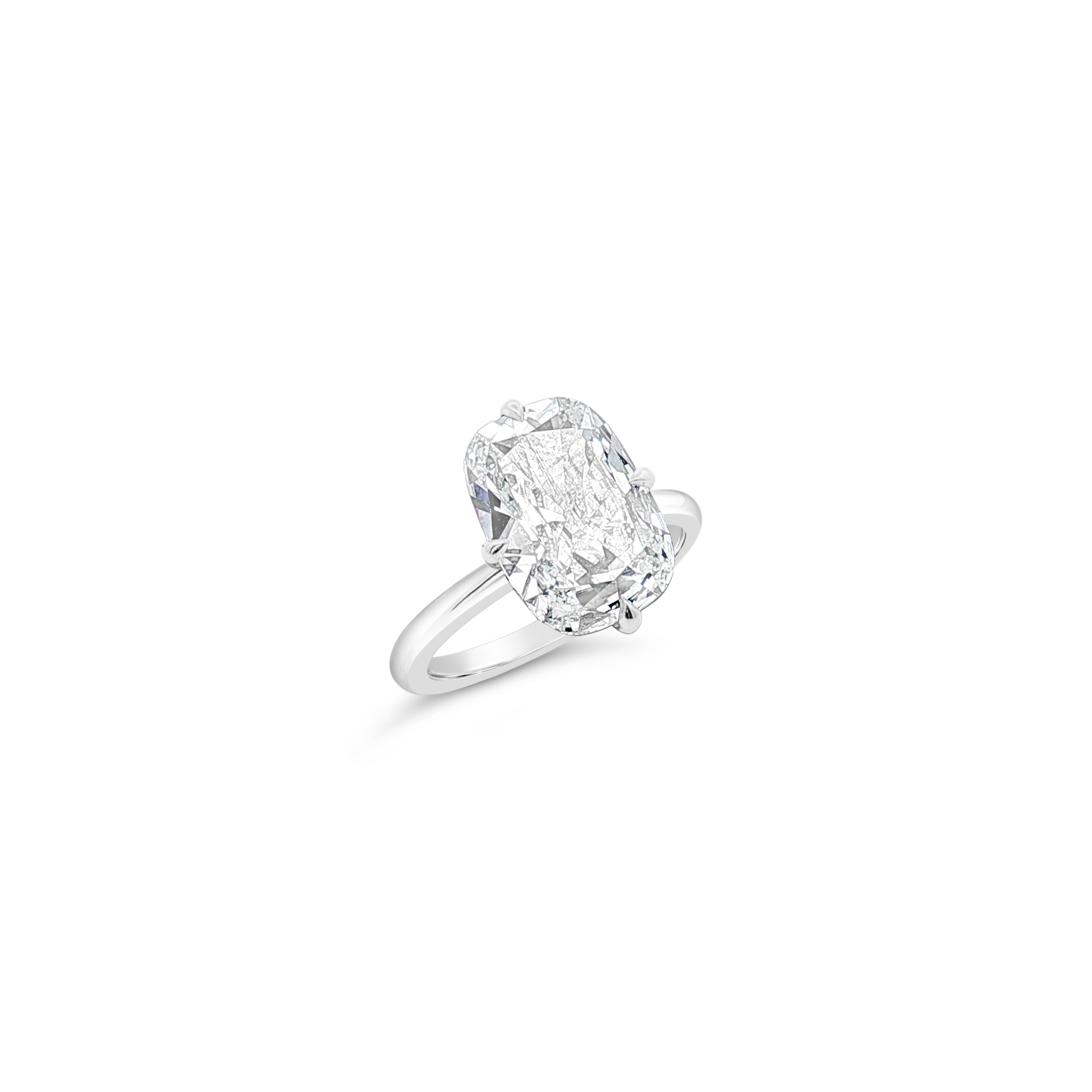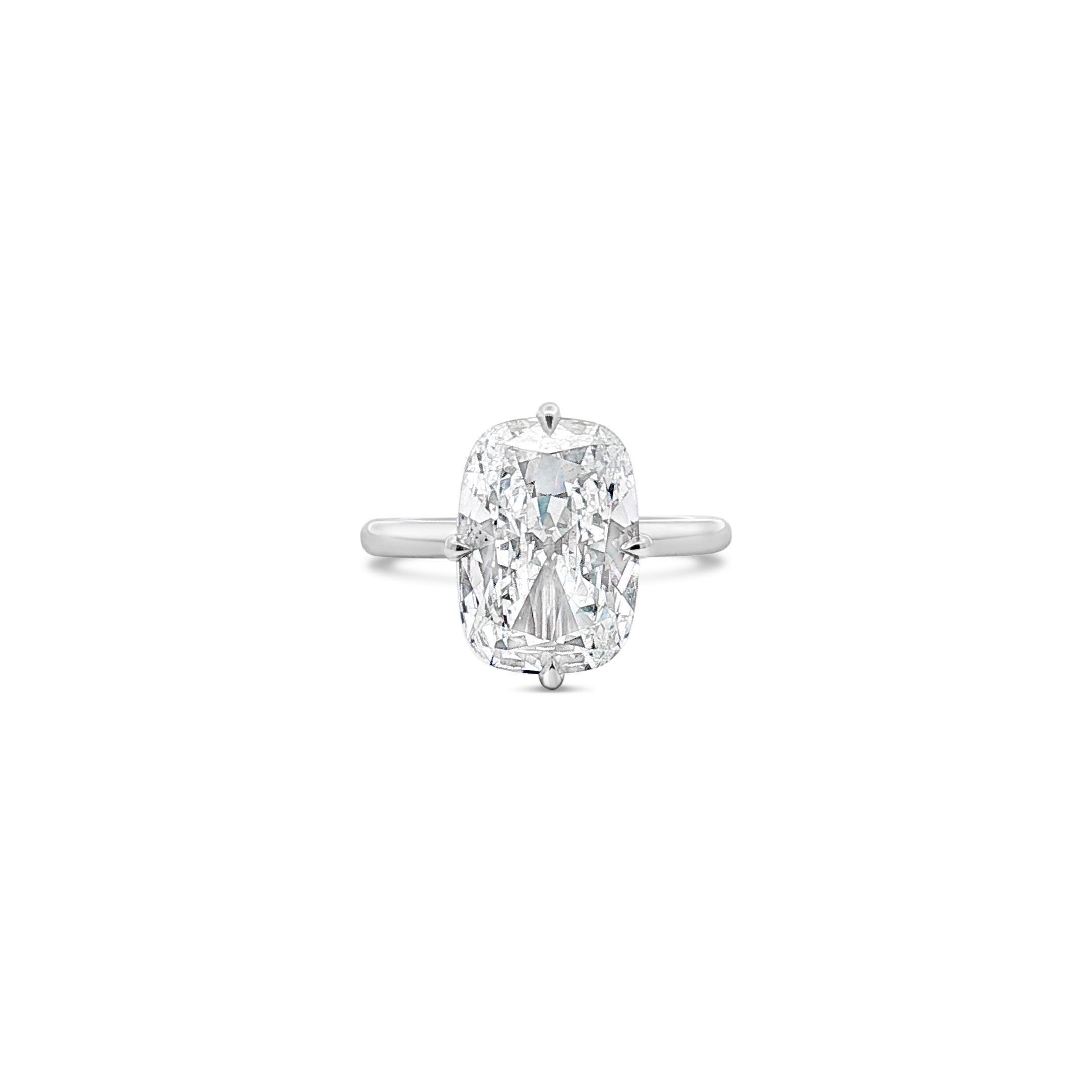 Elongated cushion cut antique diamond set in platinum in this whisper thin solitaire mounting. Diamond weight is 3.14 carats.