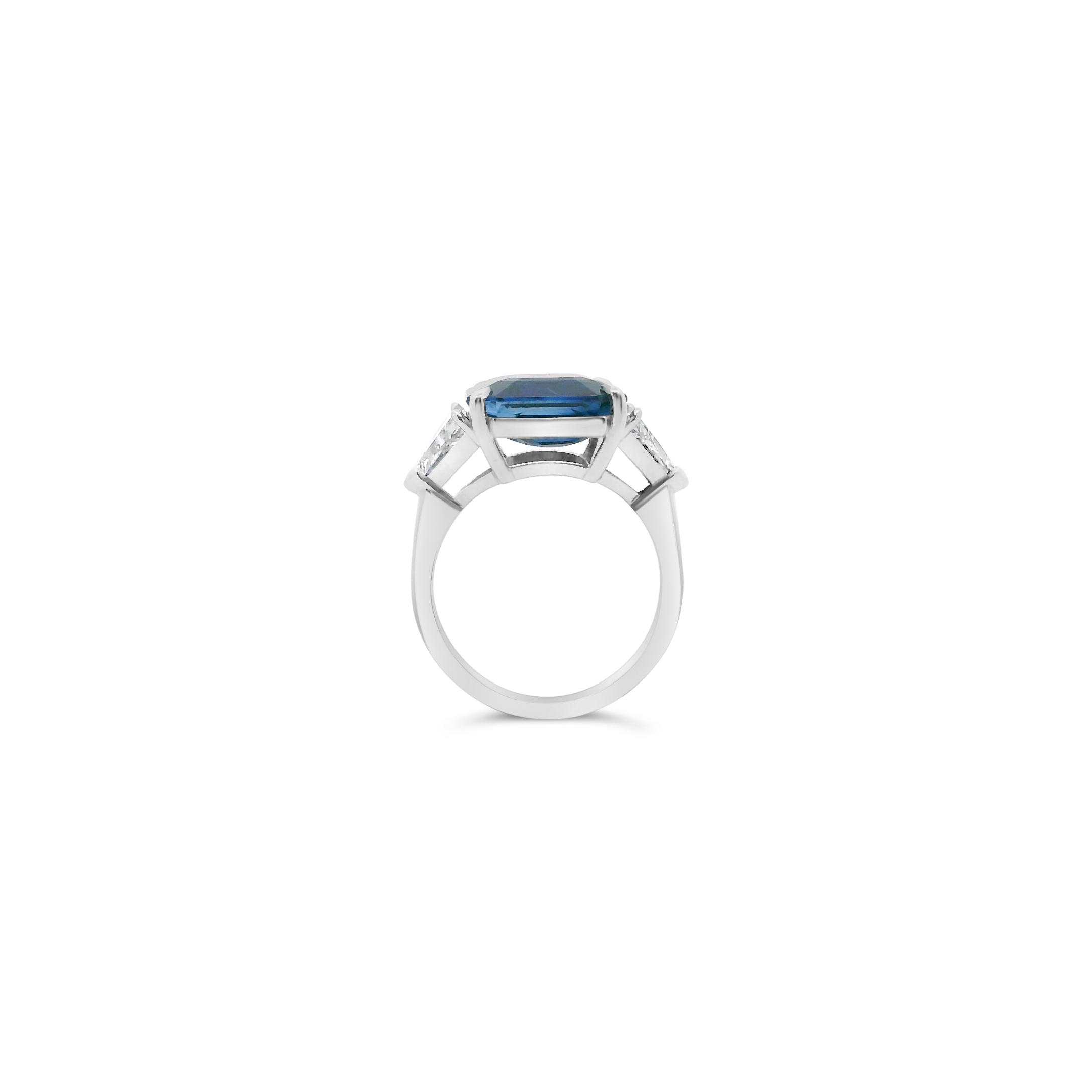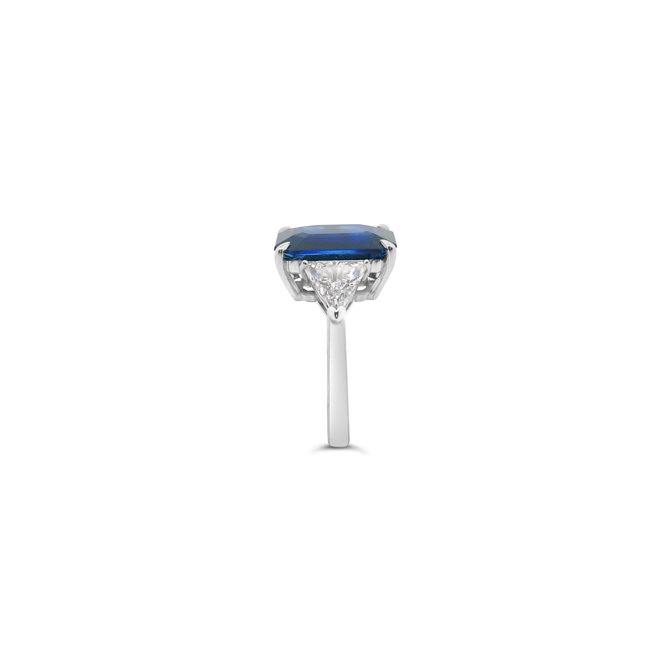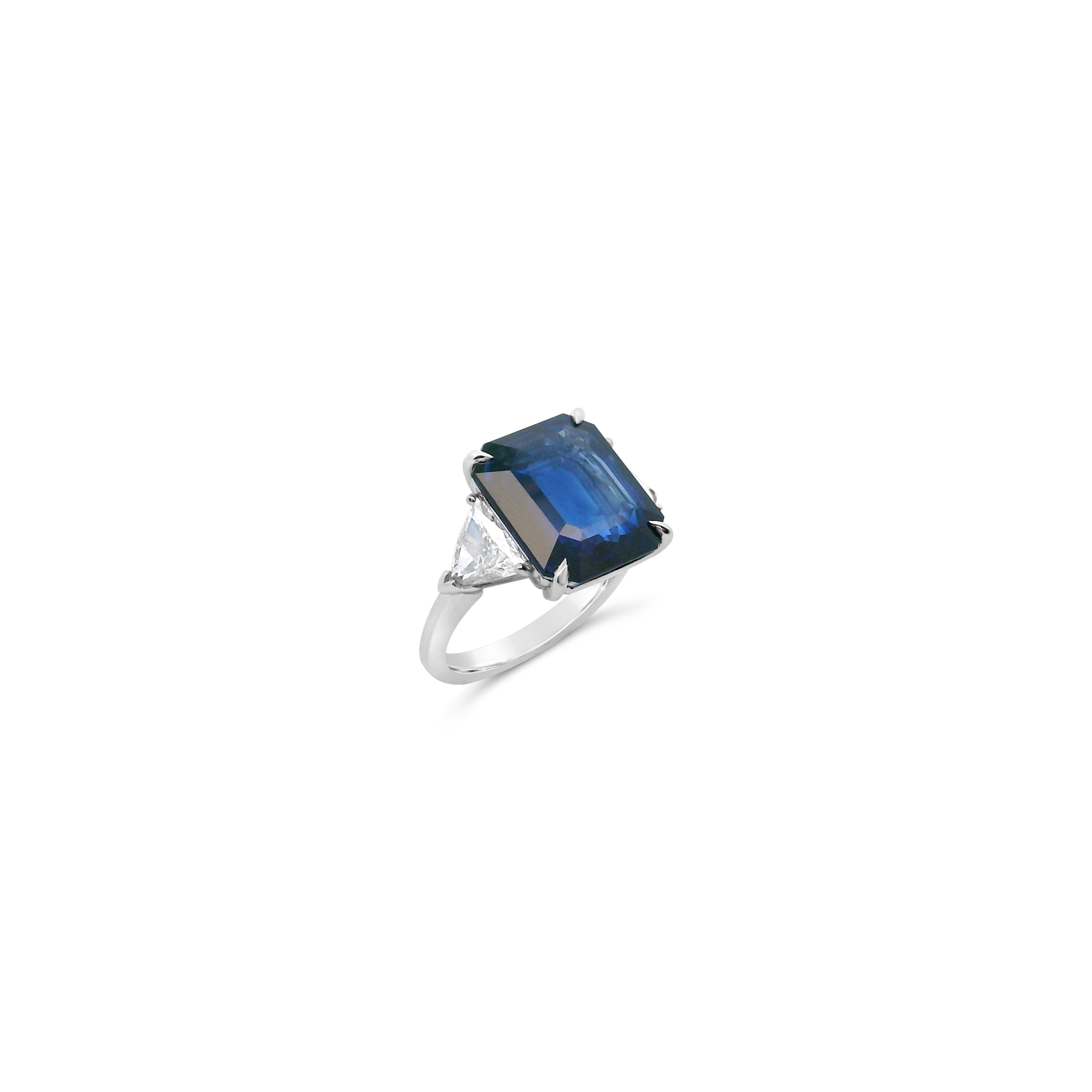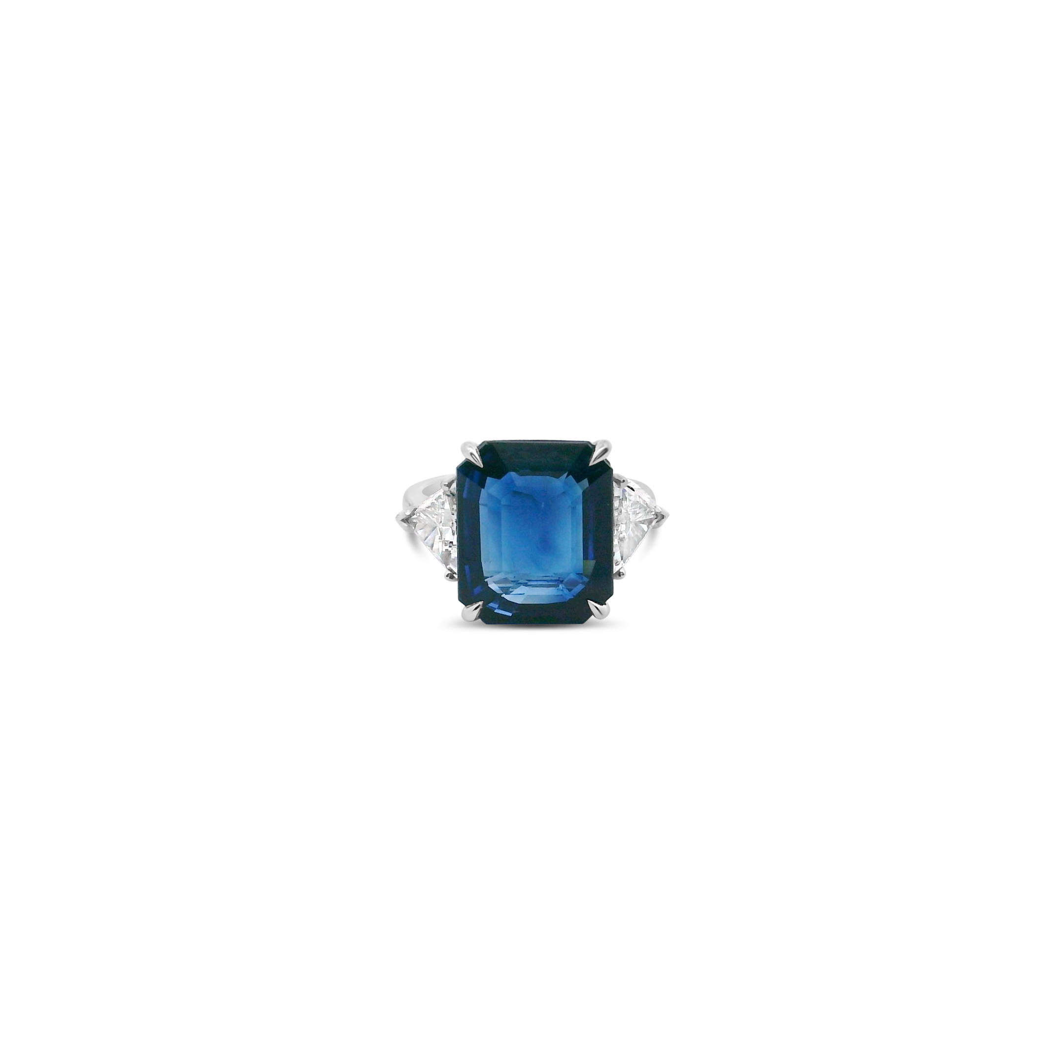 Emerald cut blue sapphire flanked by trilliant diamonds set in platinum in this ring. Weight of the sapphire is 8.98 carats. Total diamond weight is 1.09 carats.