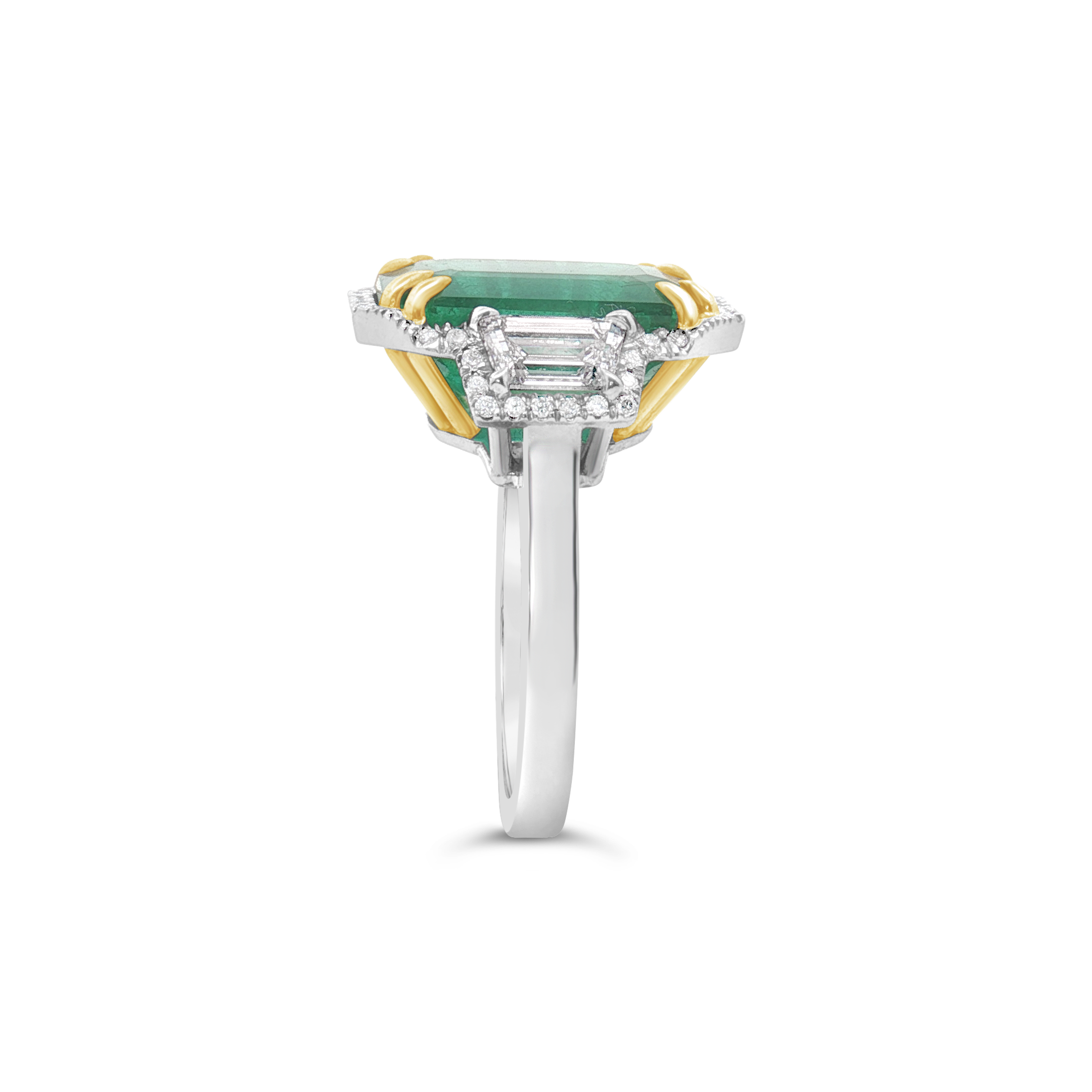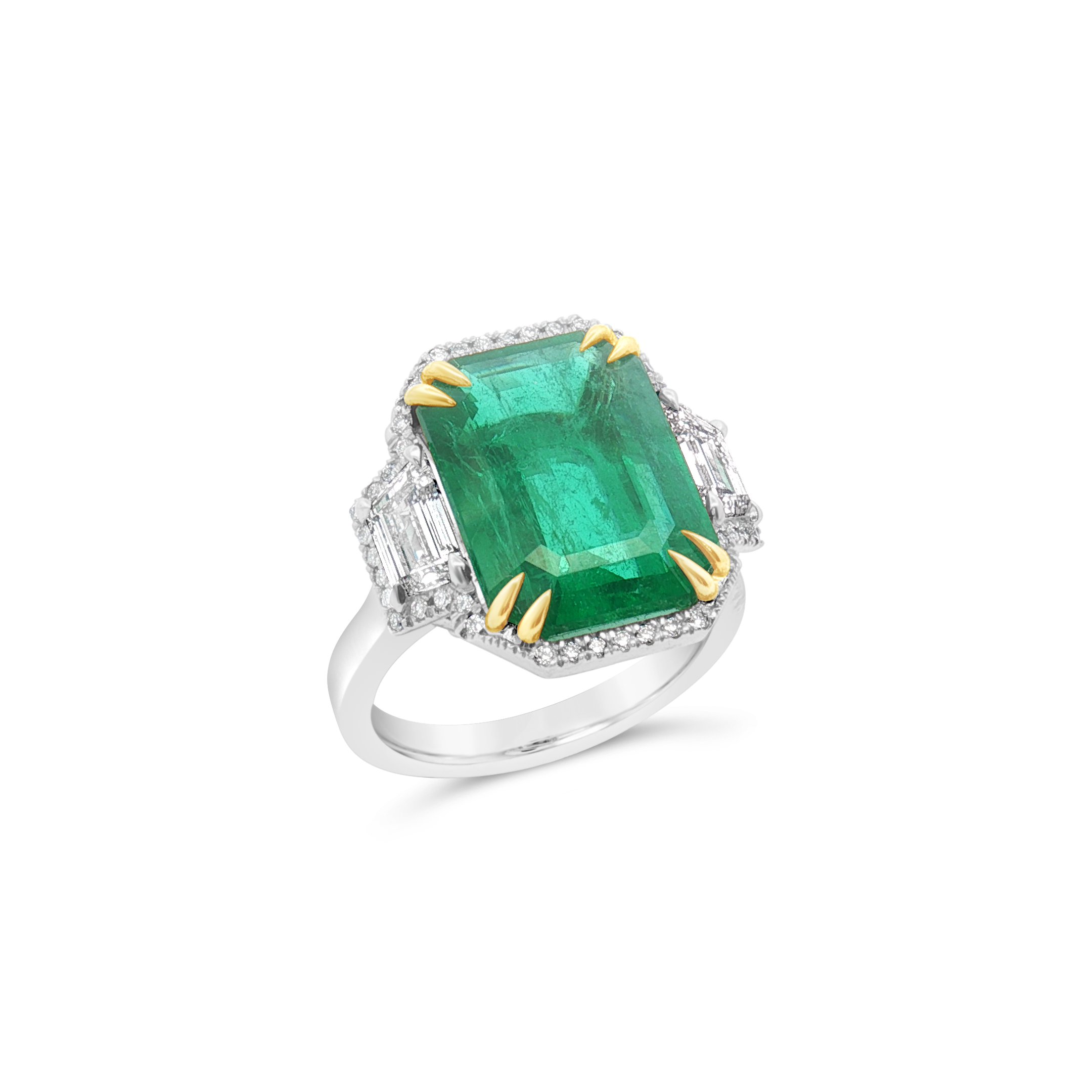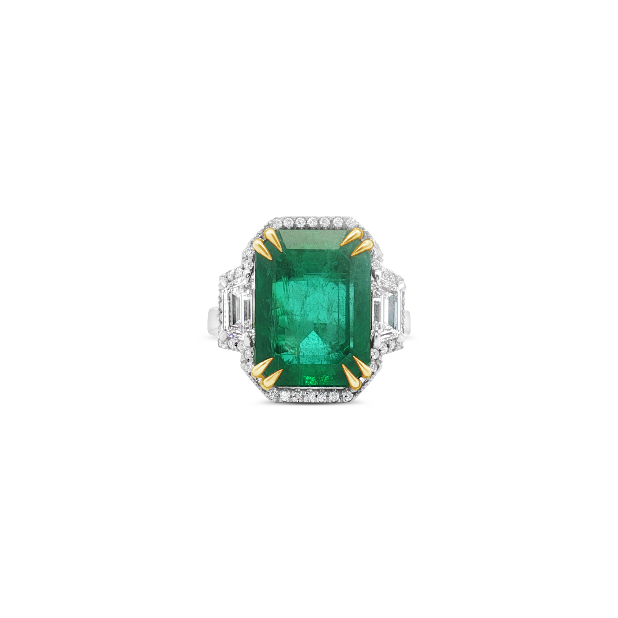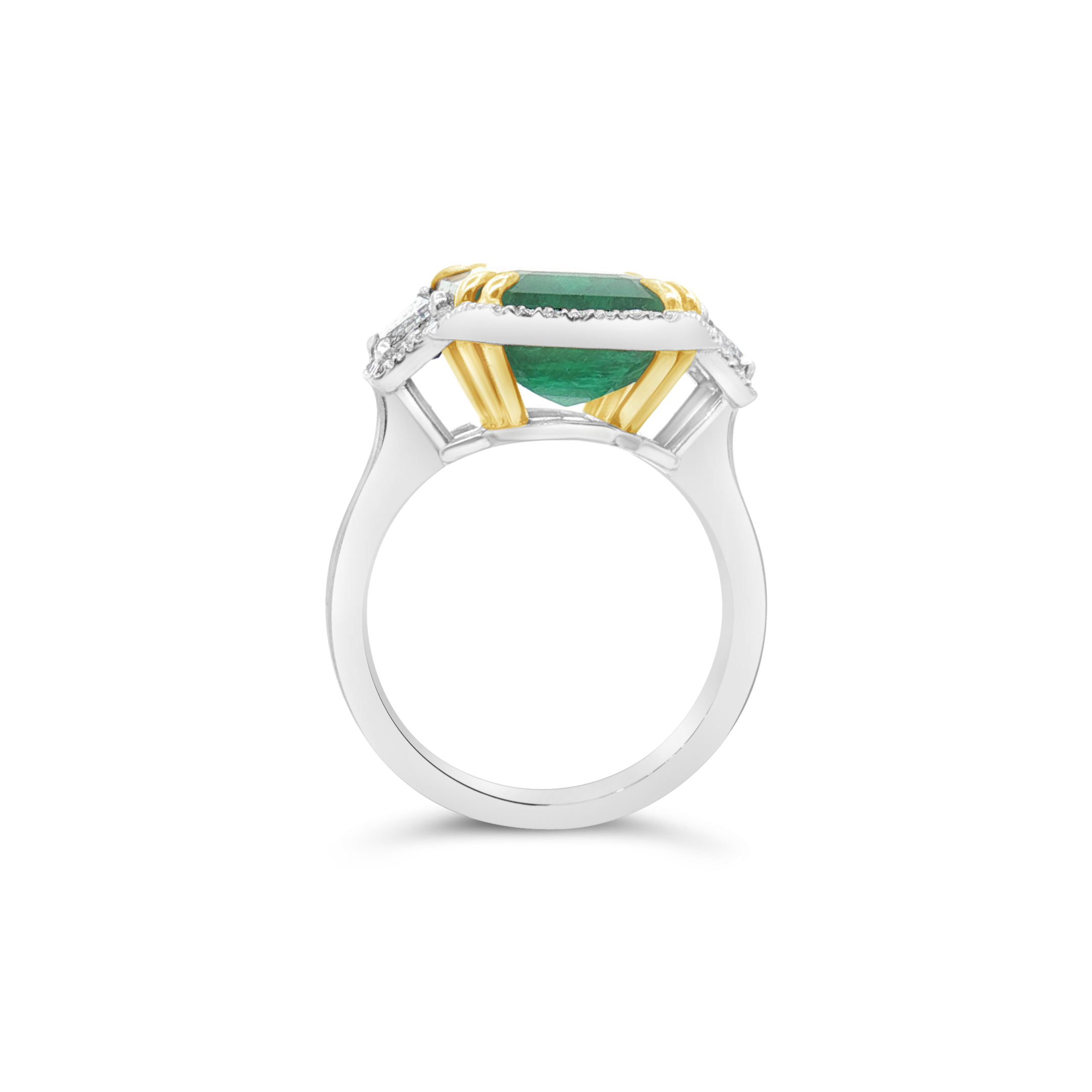 Emerald cut emerald flanked by shield diamonds with round diamonds set in platinum and 18k yellow gold in this ring. Weight of the emerald is 8.55 carats. Total weight of the shield diamonds is 1.17 carats.