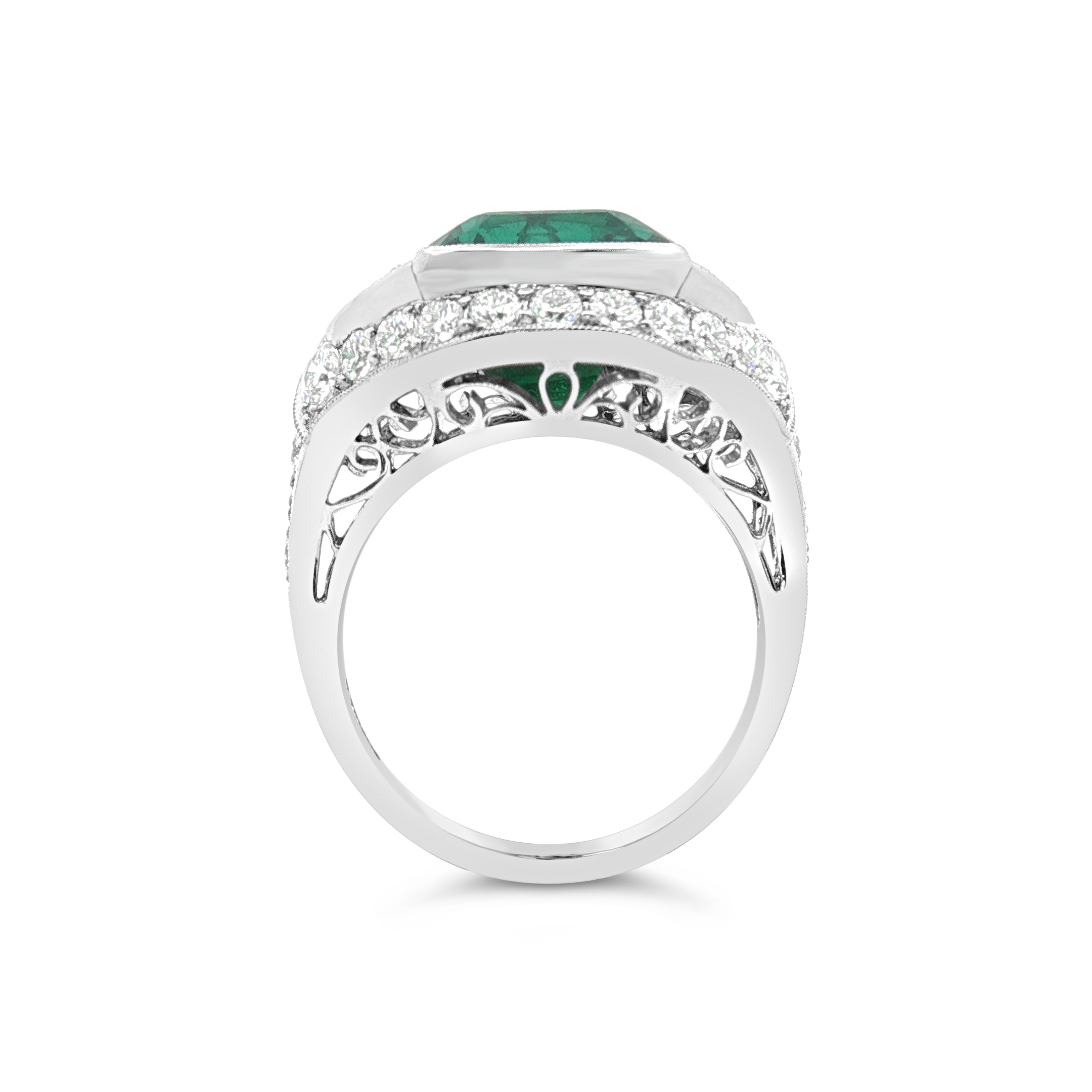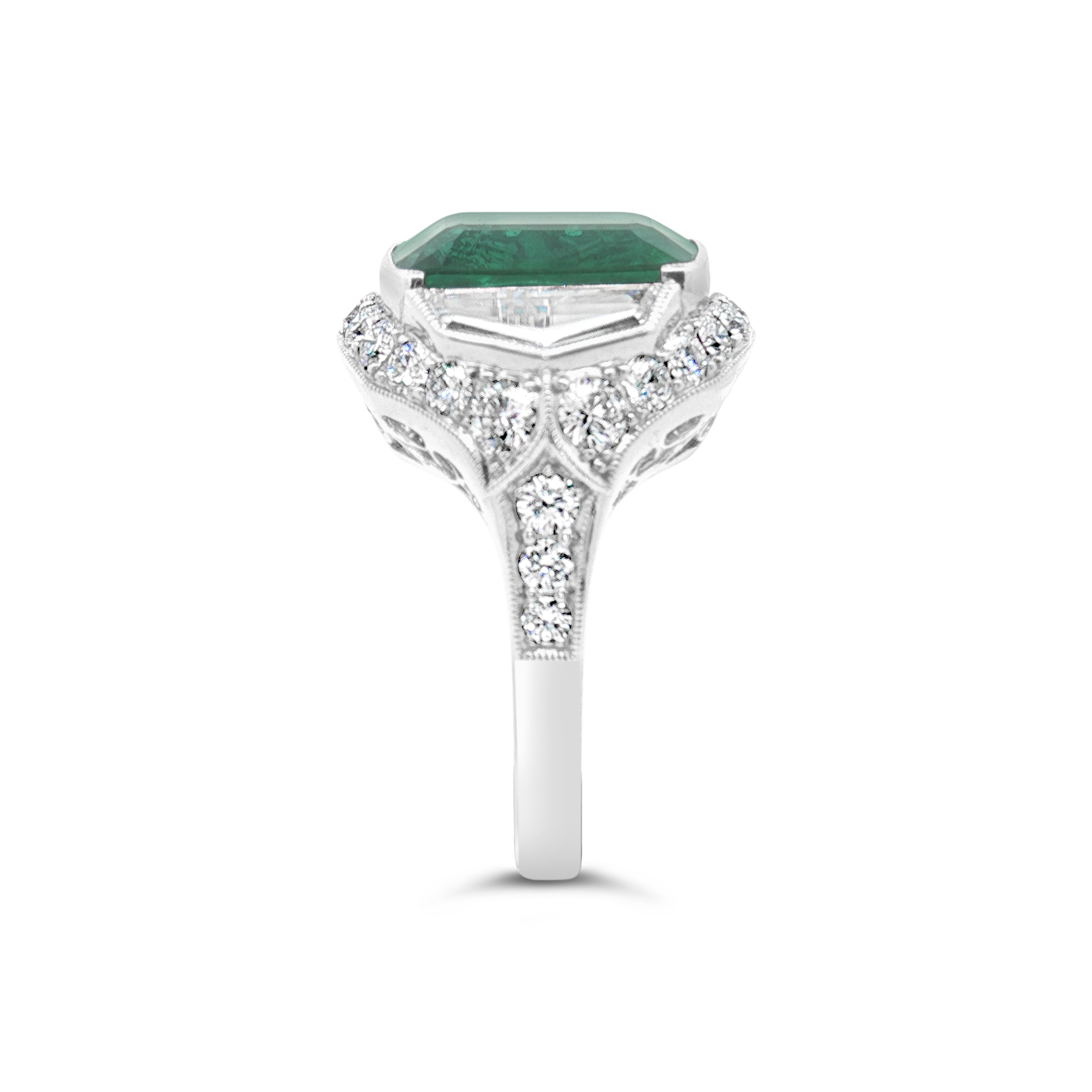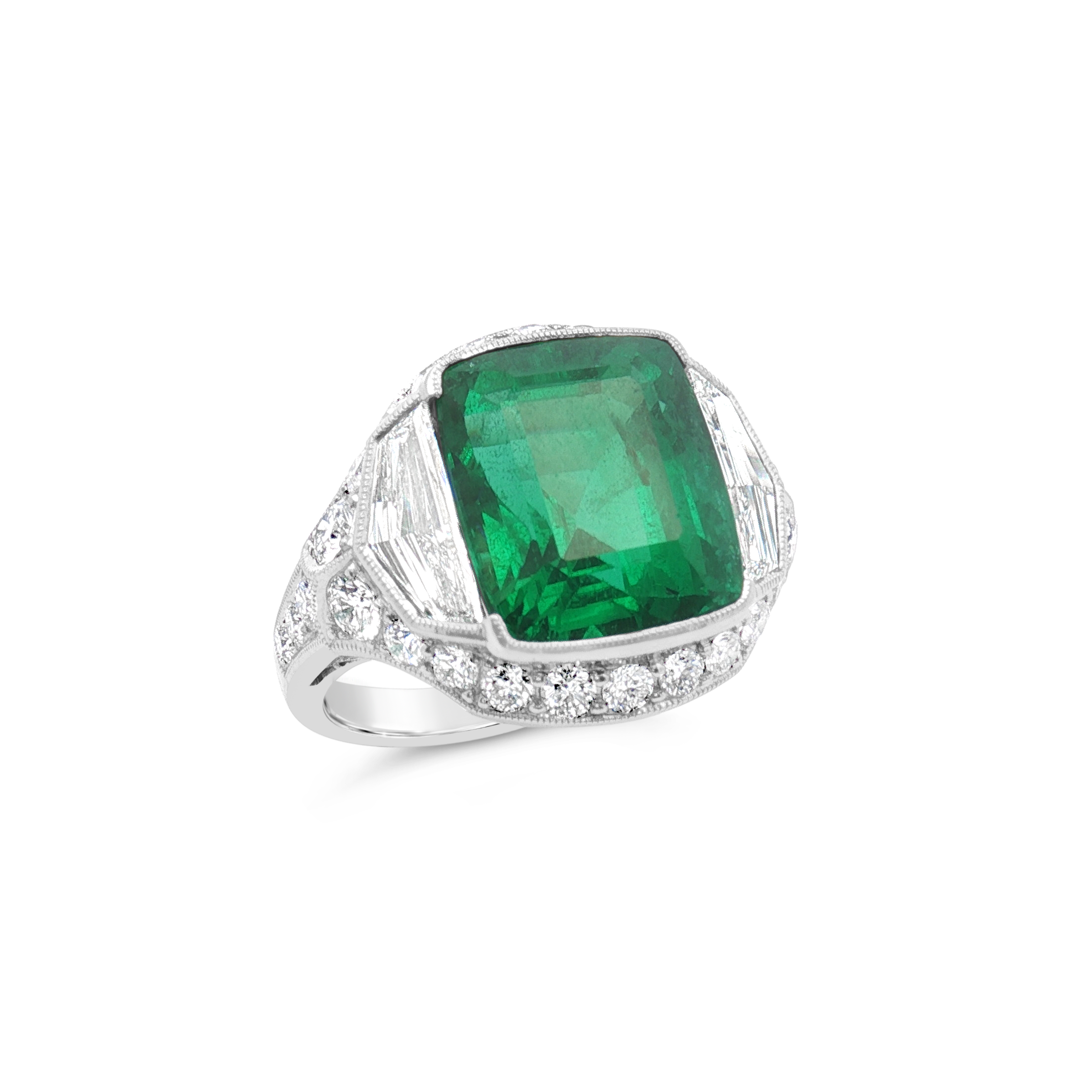 Emerald cut emerald flanked by two shield diamonds with round diamonds set in platinum in this ring. Weight of the emerald is 8.16 carats. Total diamond weight is 2.18 carats.
