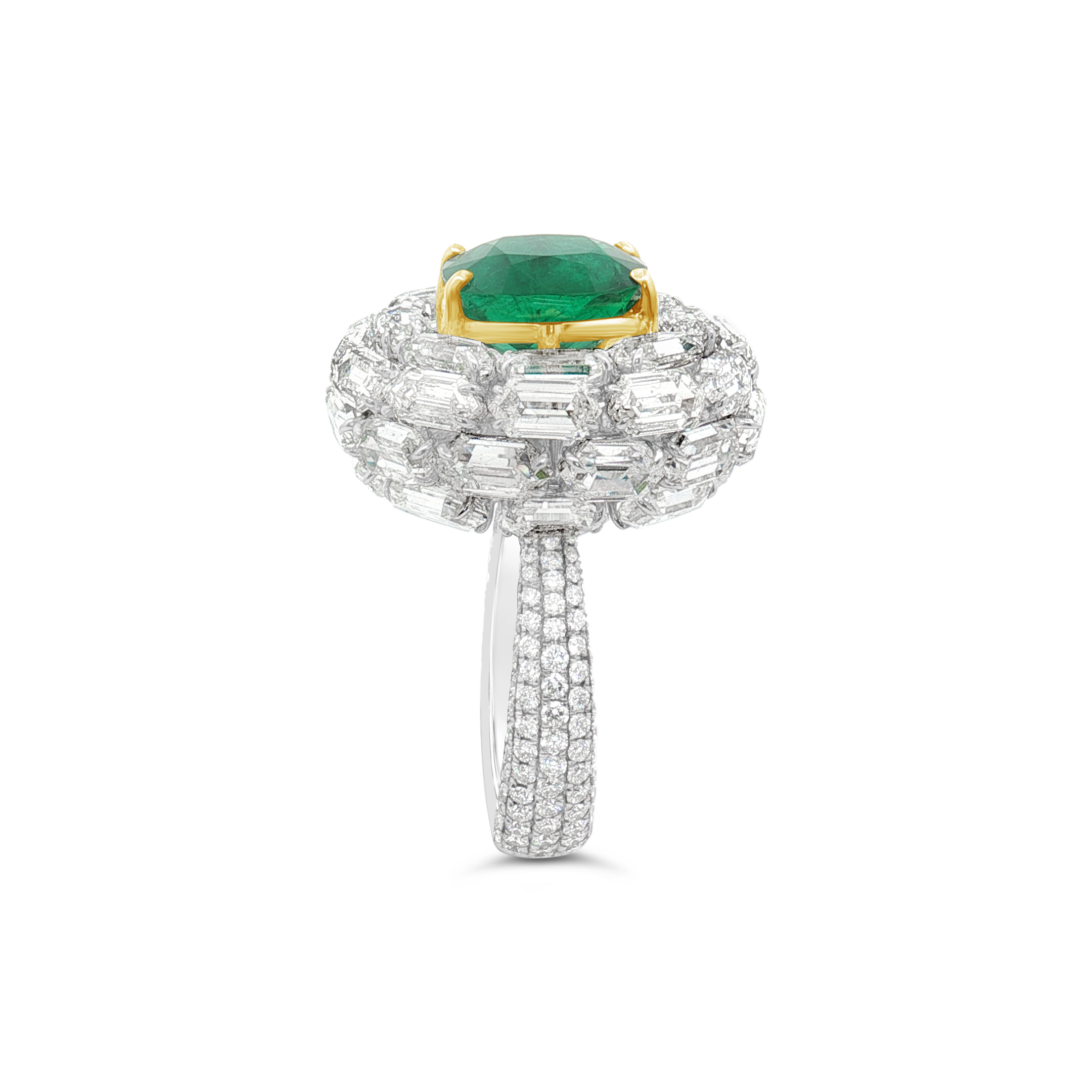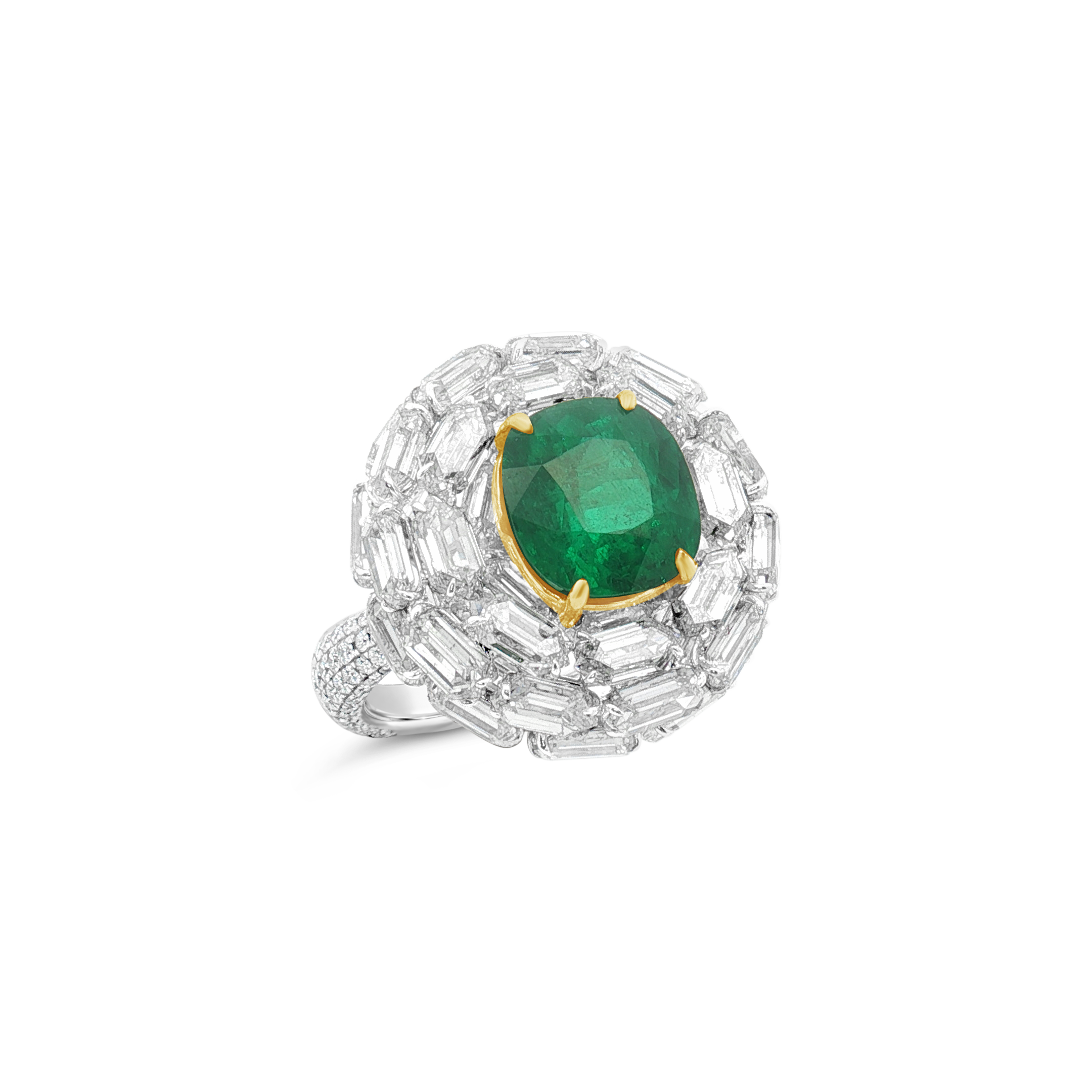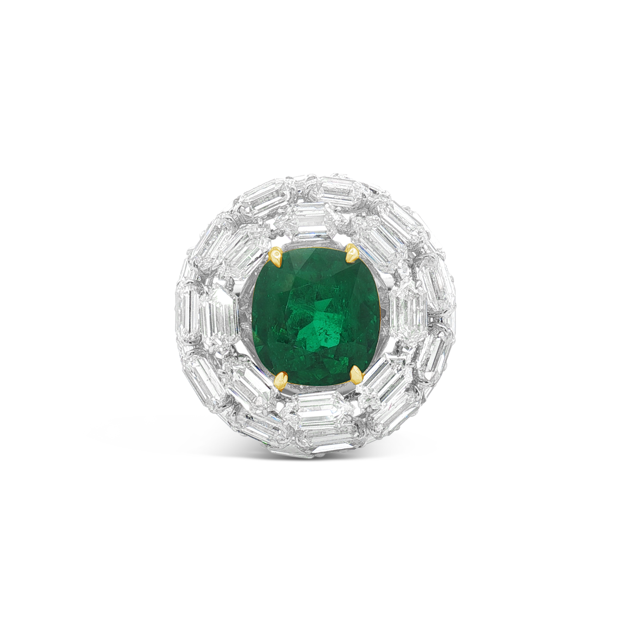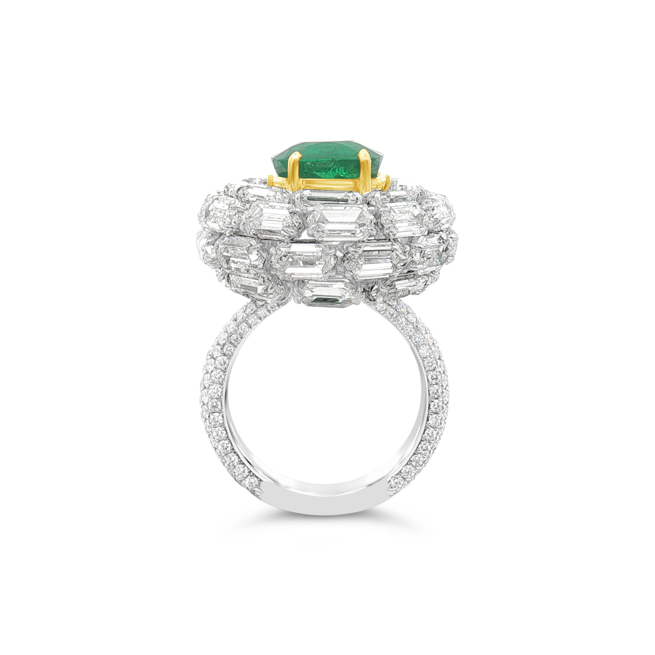 Cushion cut Colombian emerald surrounded by emerald cut and round diamonds set in 18k white and yellow gold in this ring.  Weight of the emerald is 3.98 carats.  Total diamond weight is 13.98 carats.
