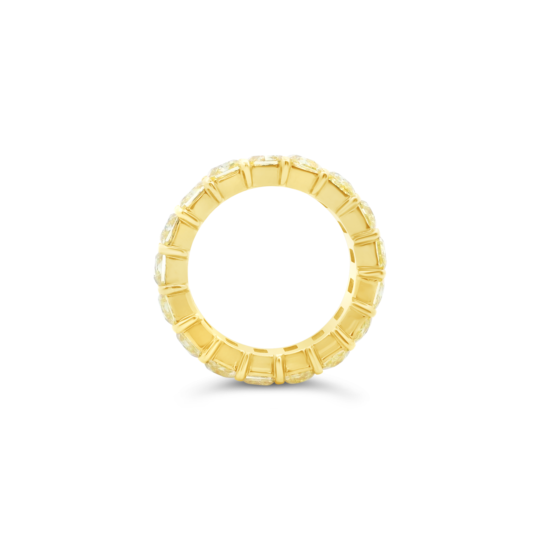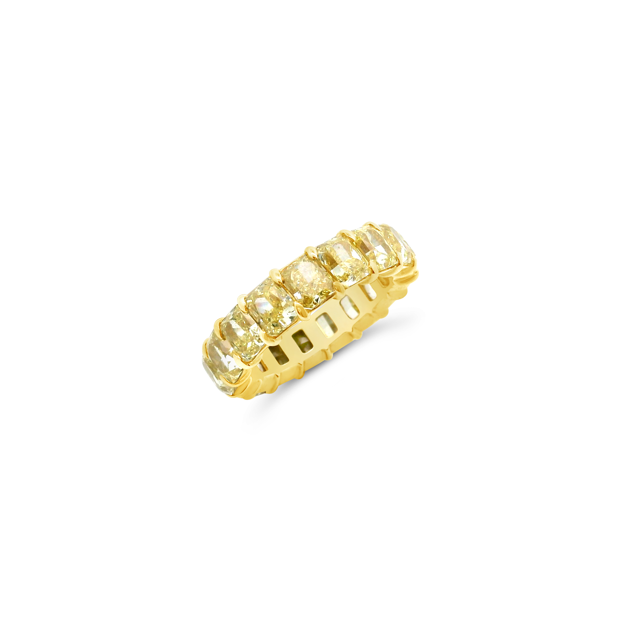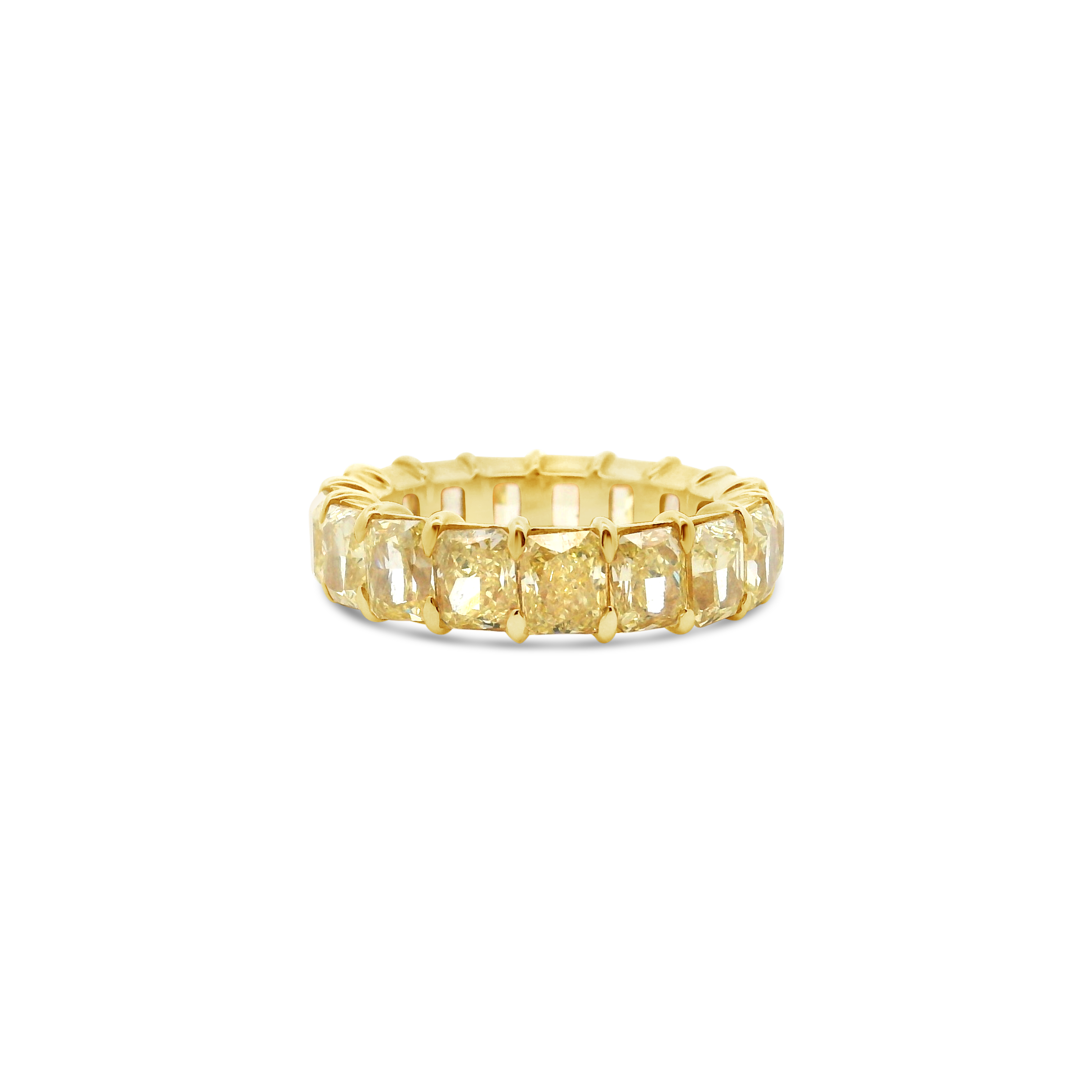 Radiant cut fancy yellow diamonds set in 18k yellow gold in this eternity band style ring. Total weight of the diamonds is 9.57 carats.