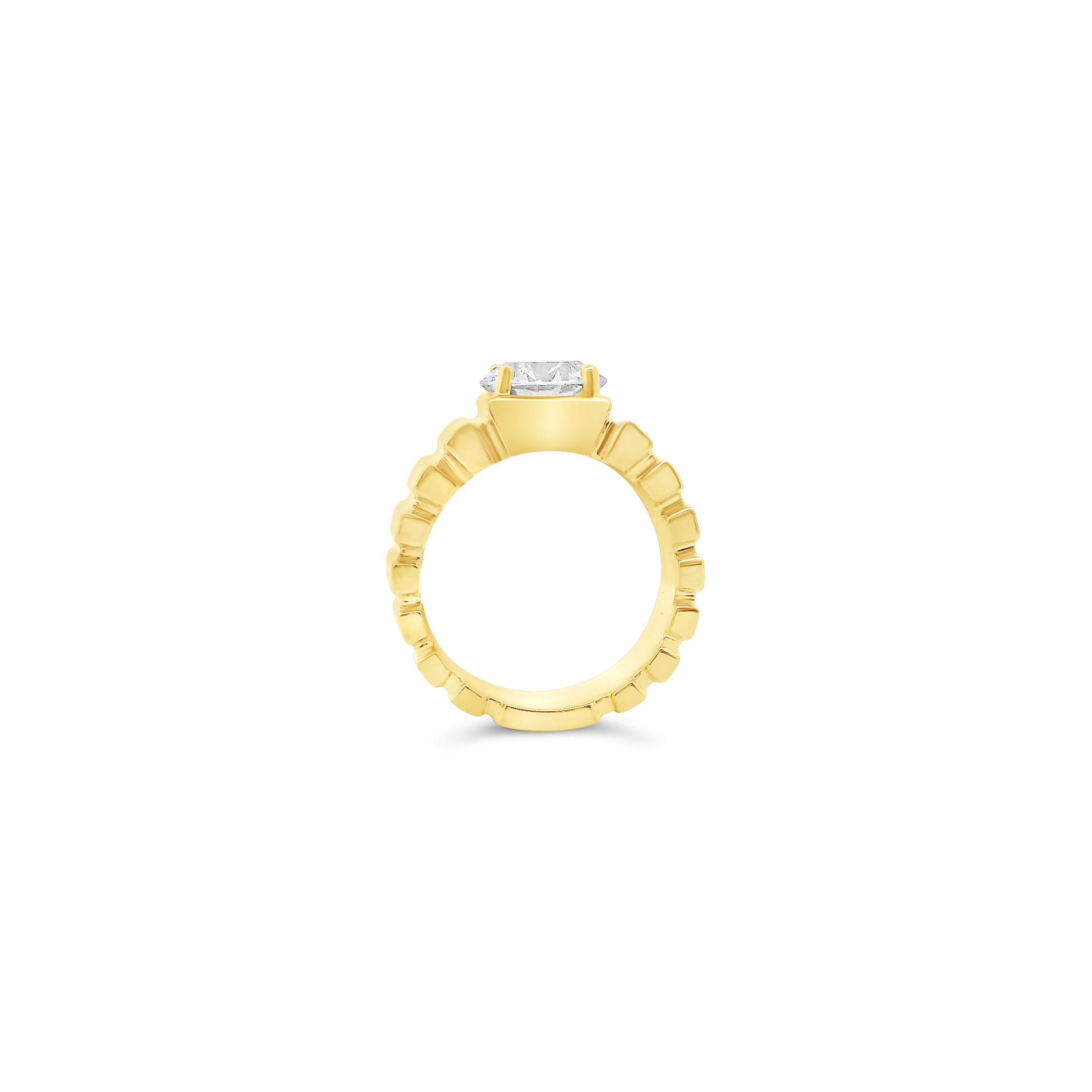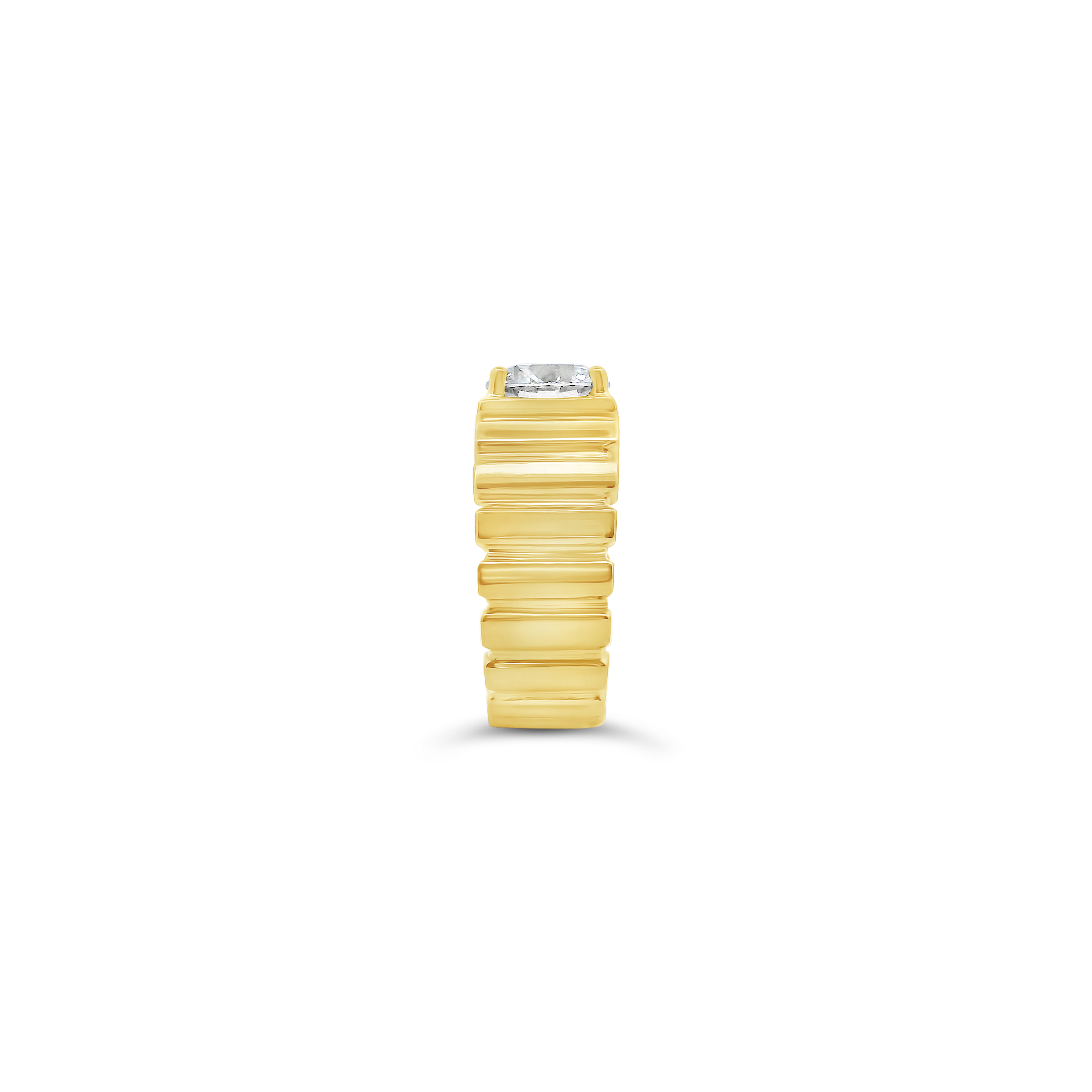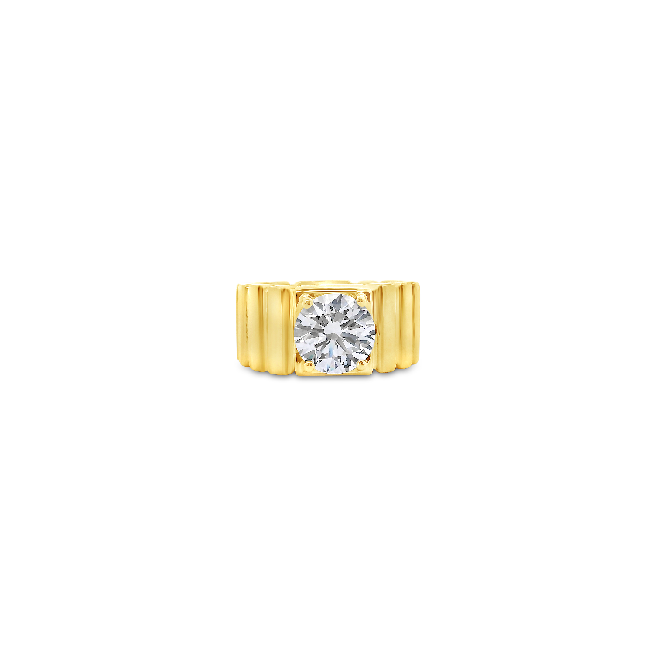 Round diamond set in 18k yellow gold in this band style ring. Weight of the single diamond is 2.07 carats.