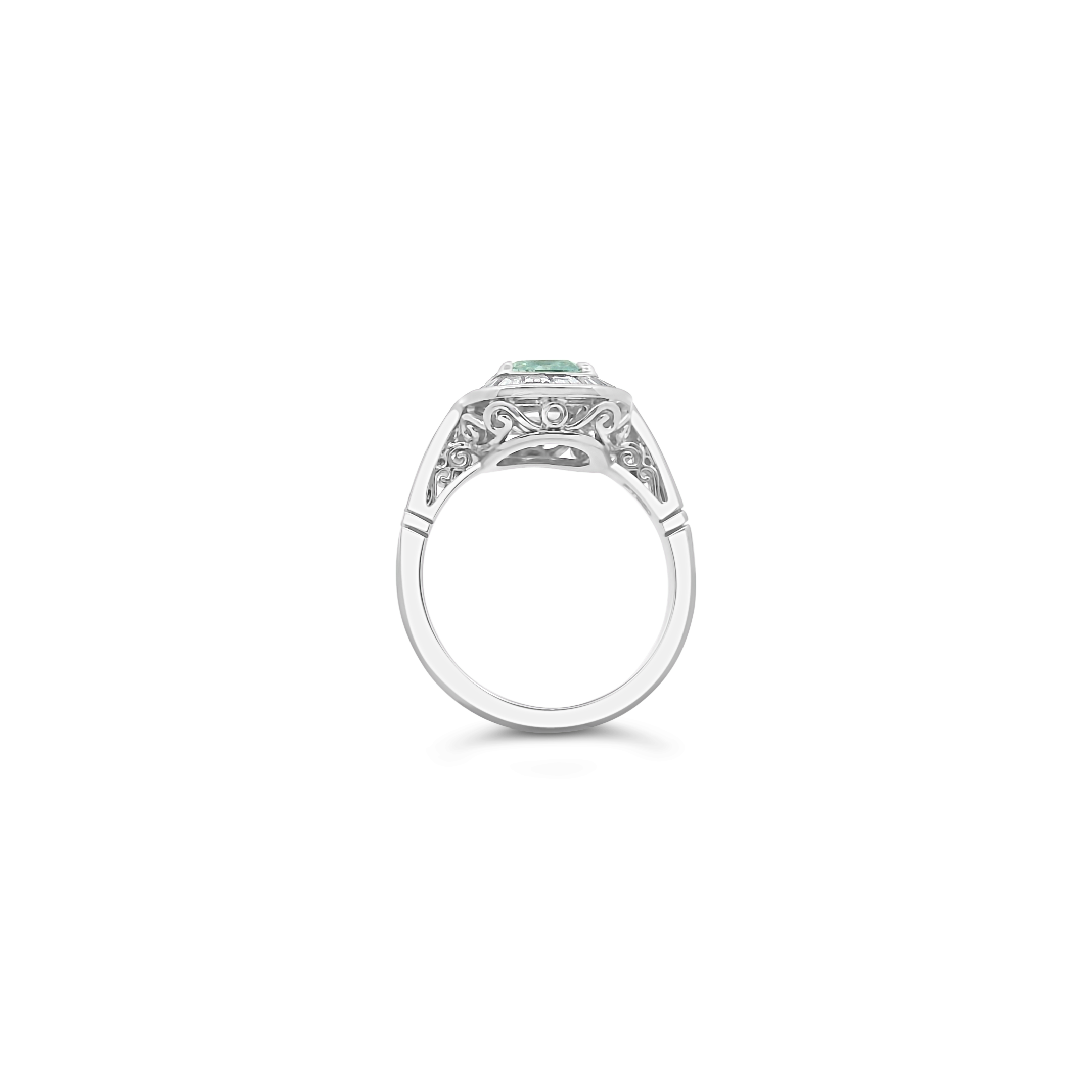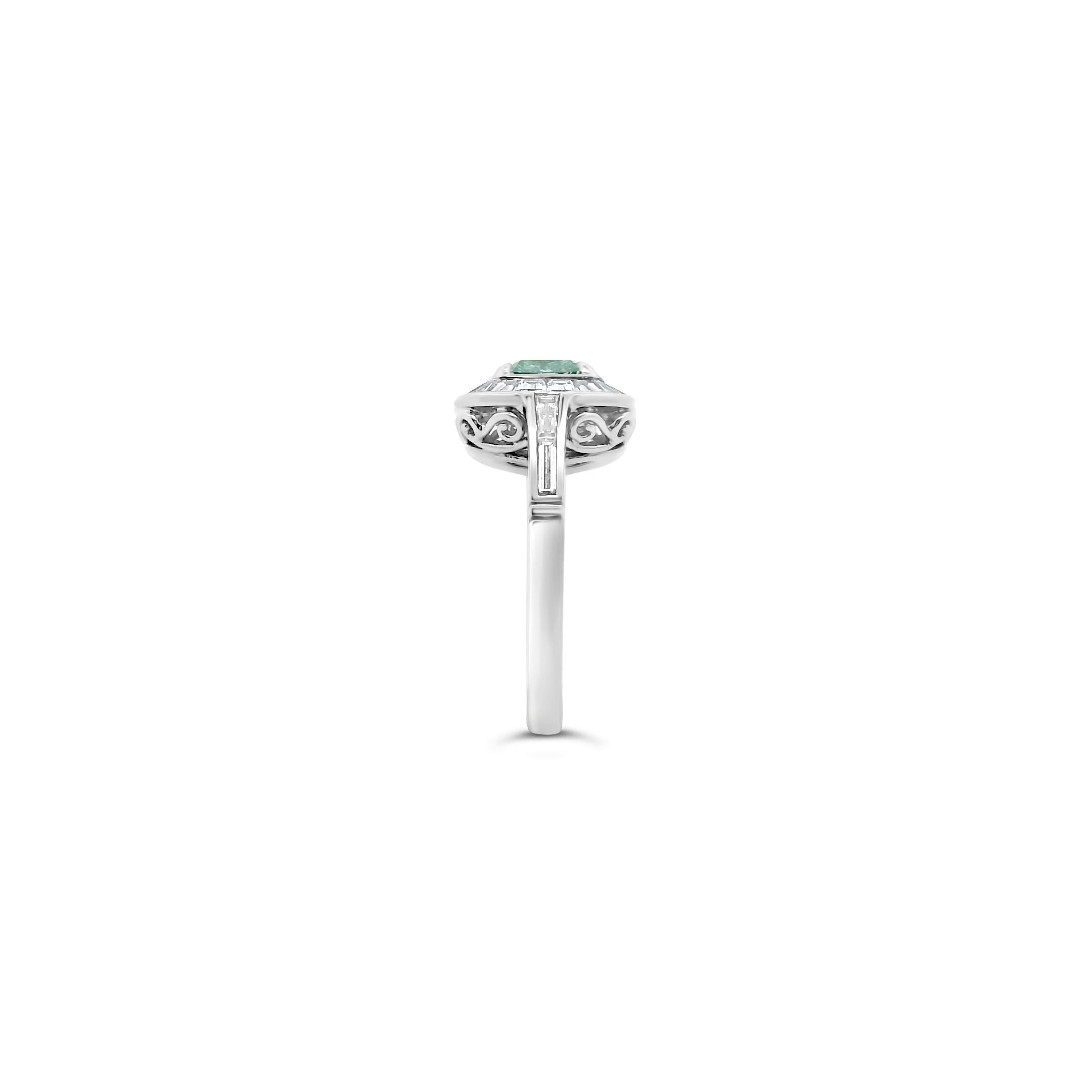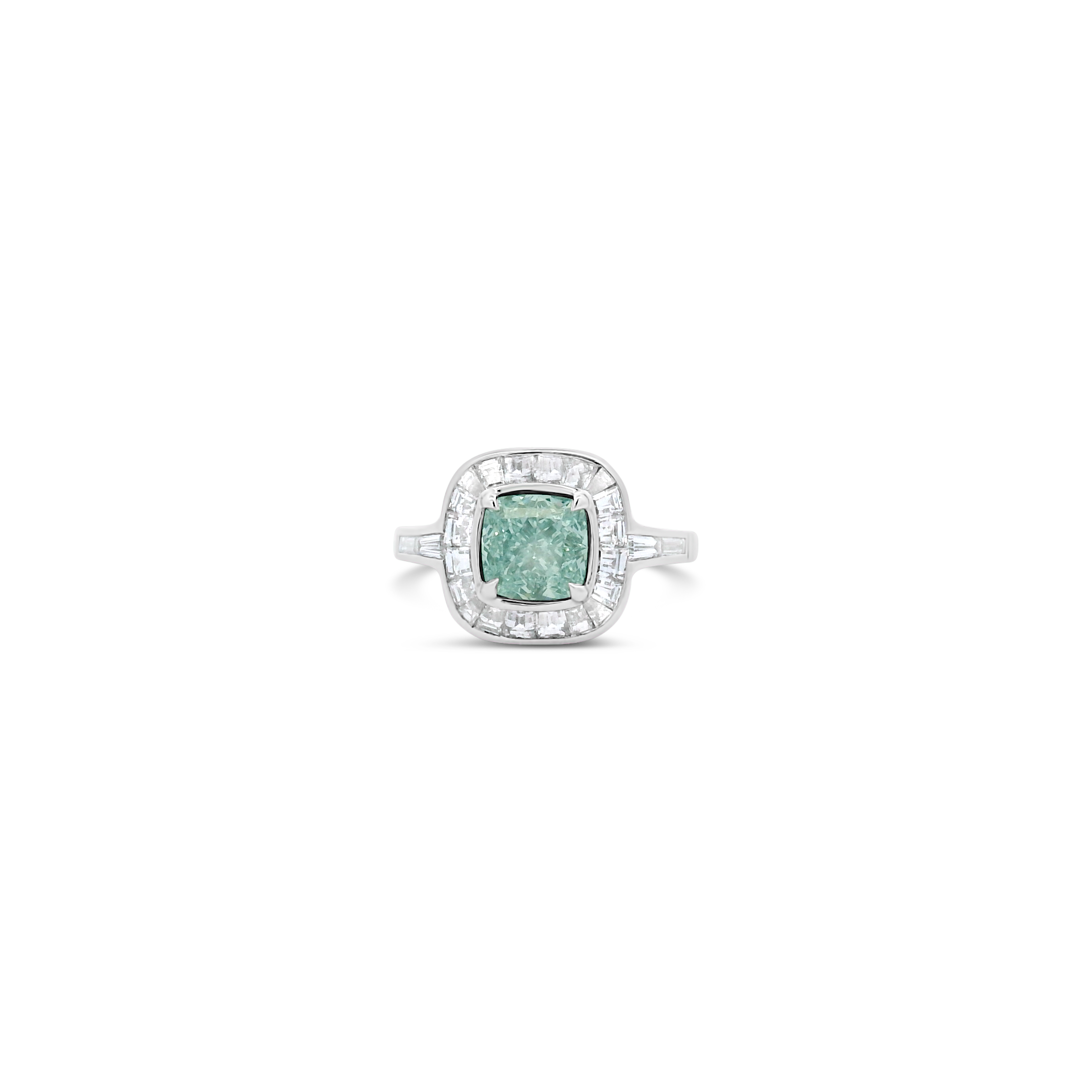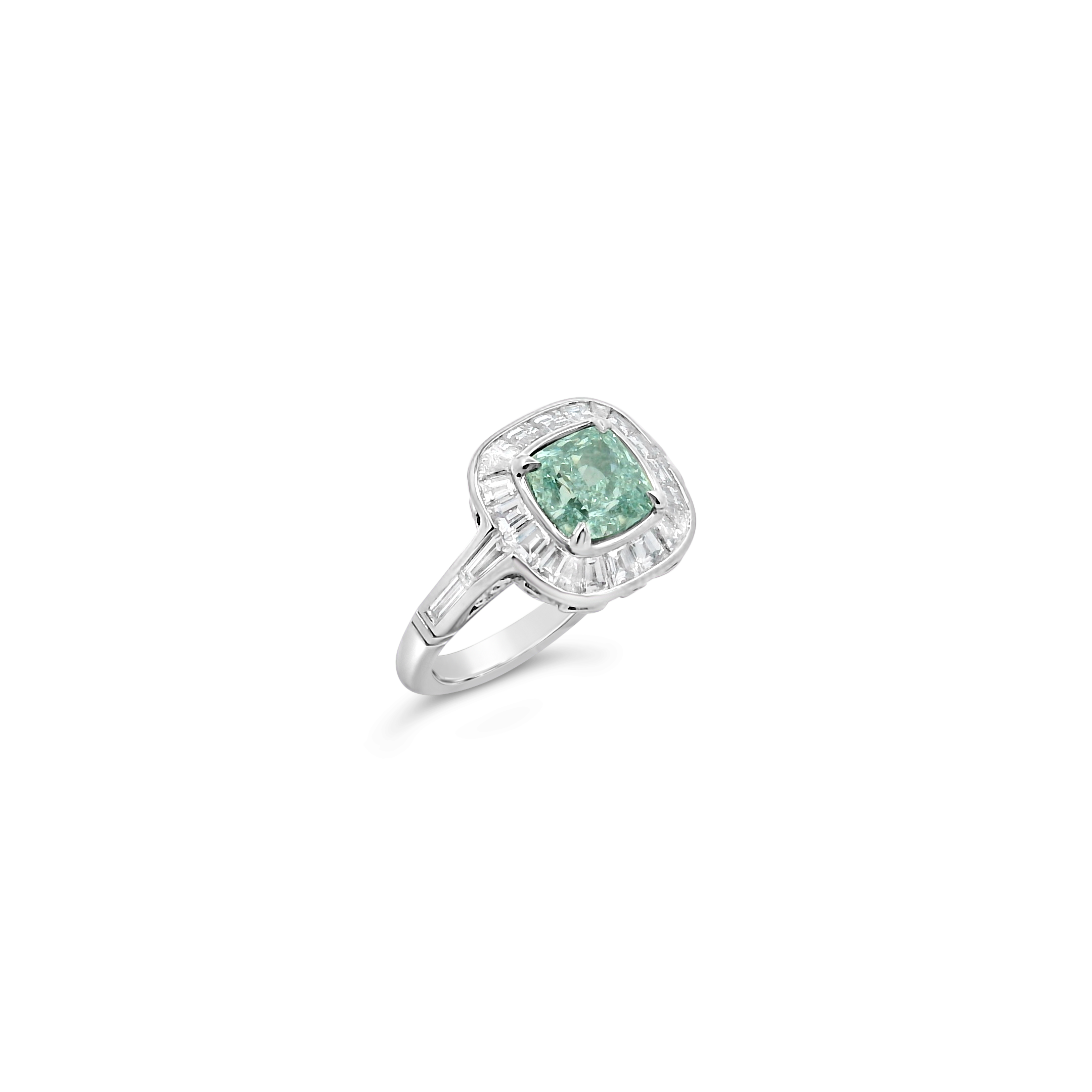 Cushion cut fancy light greenish blue diamond surrounded by fancy cut and baguette diamonds set in platinum in this ring.  Weight of the colored diamond is 1.63 carats.  Total weight of the remaining diamonds is .89 carat.