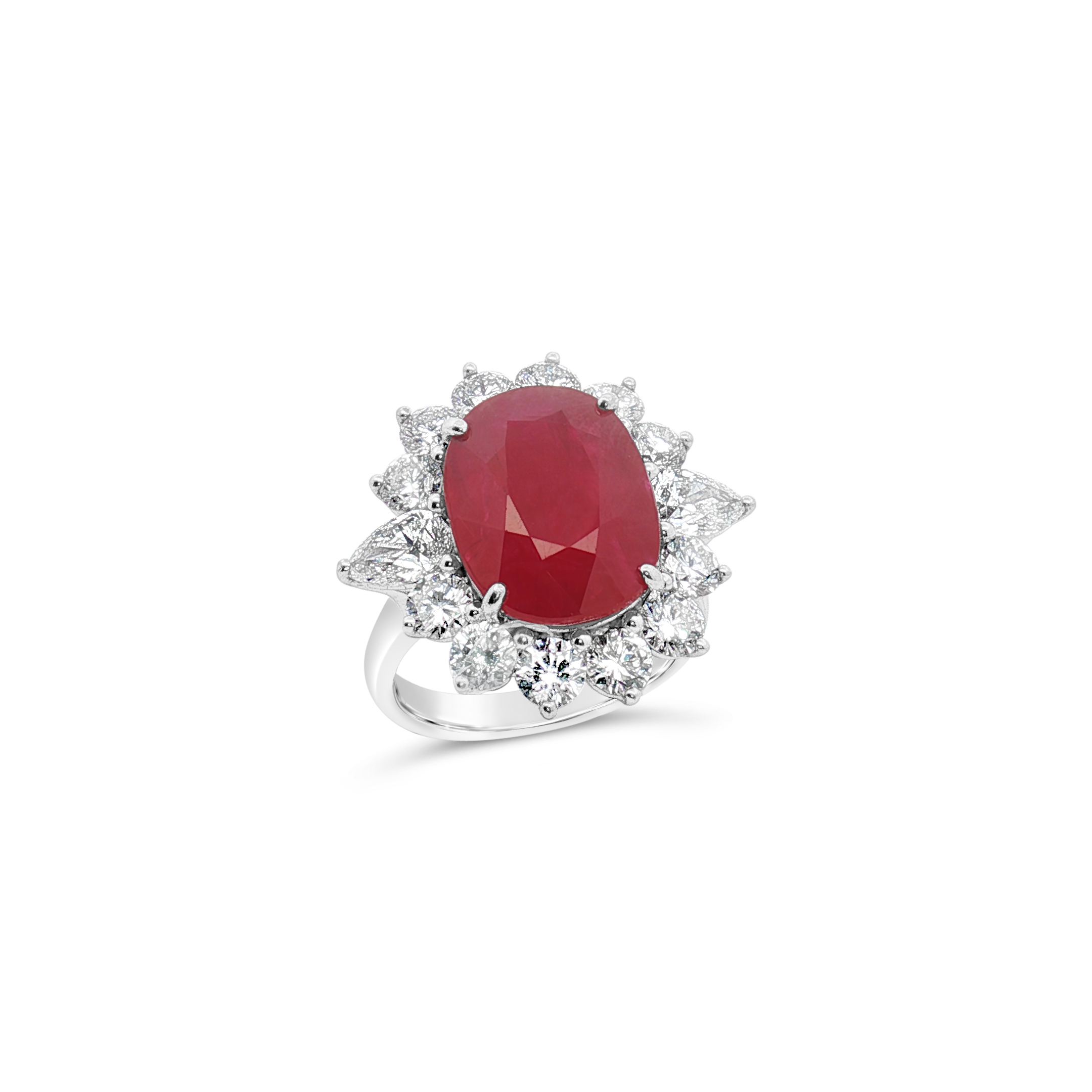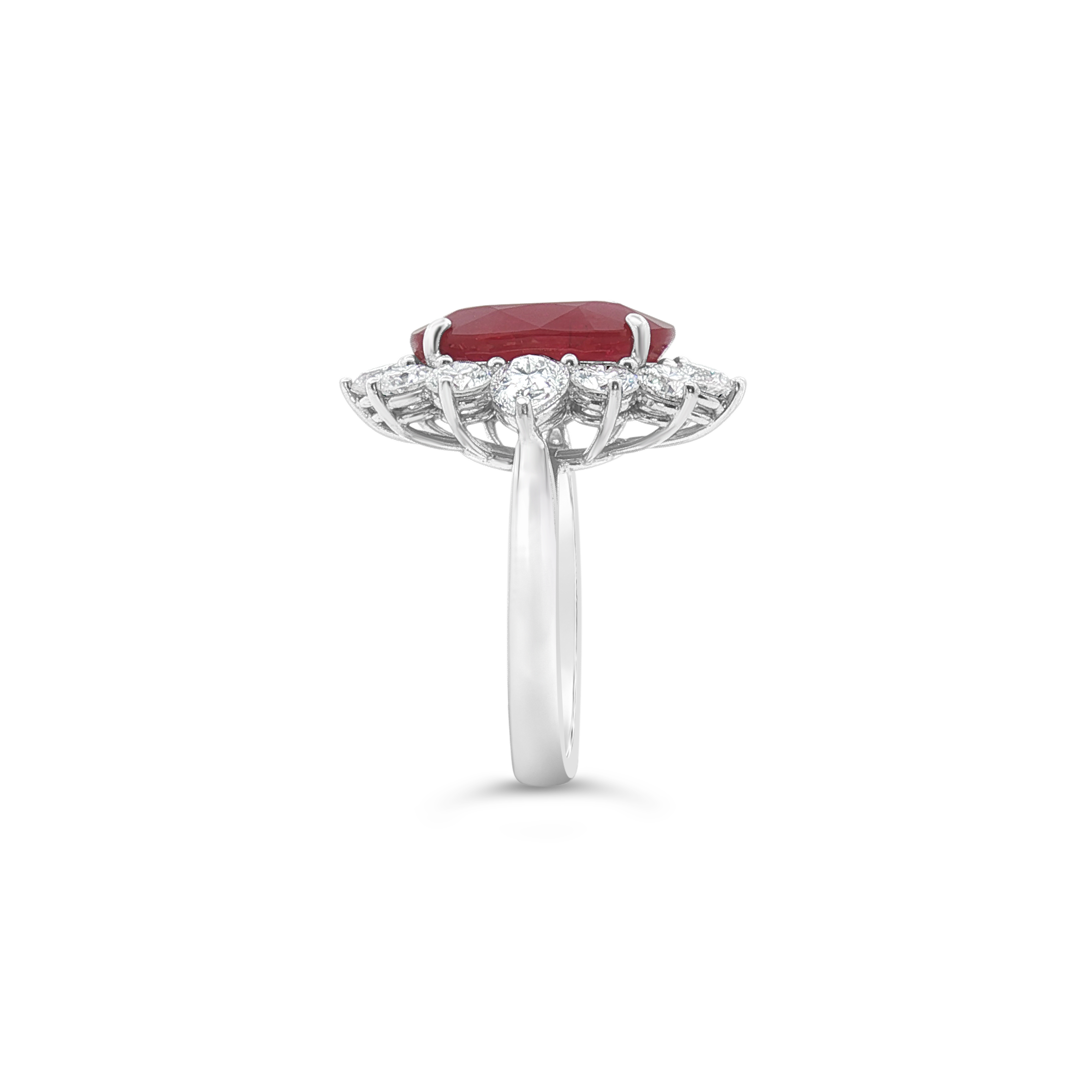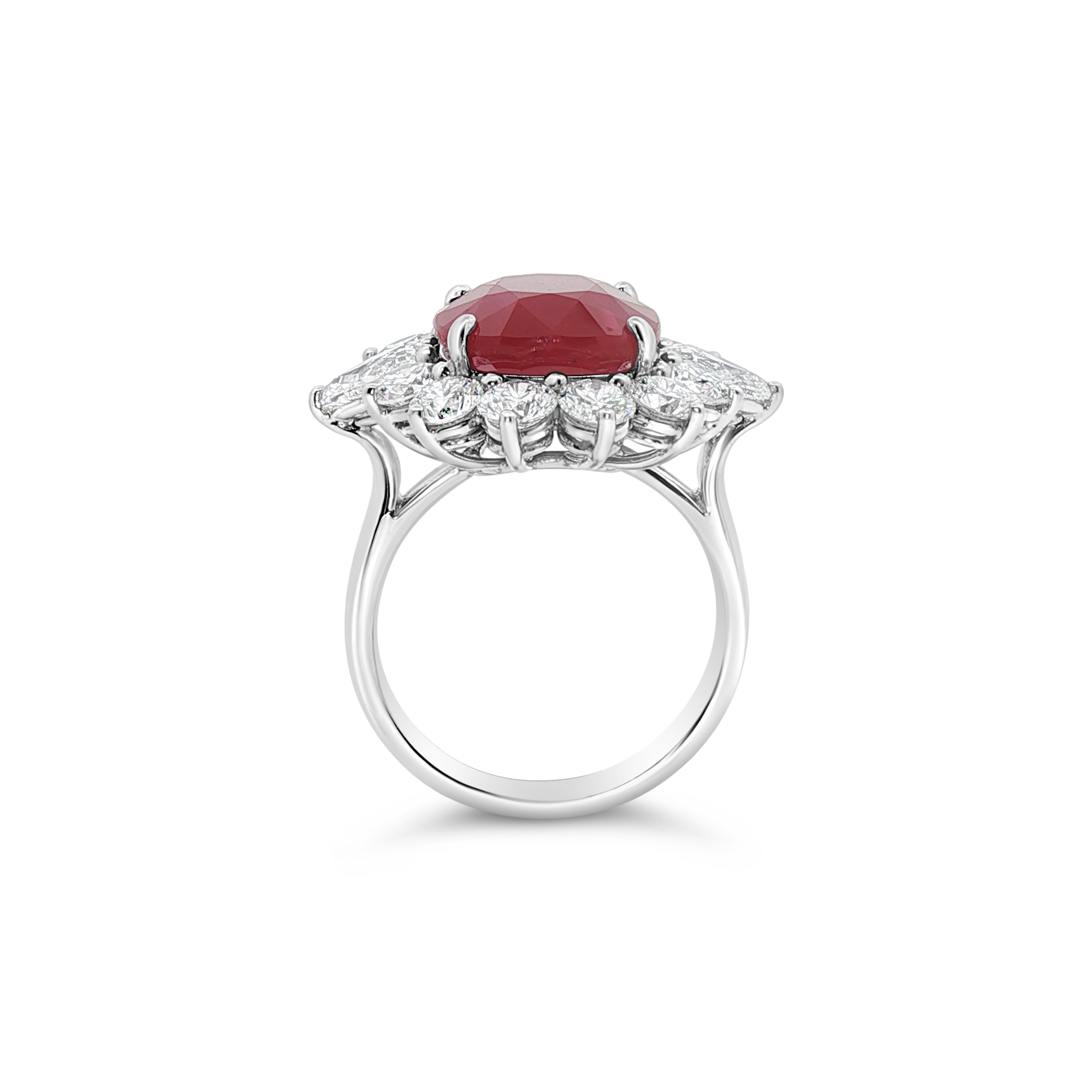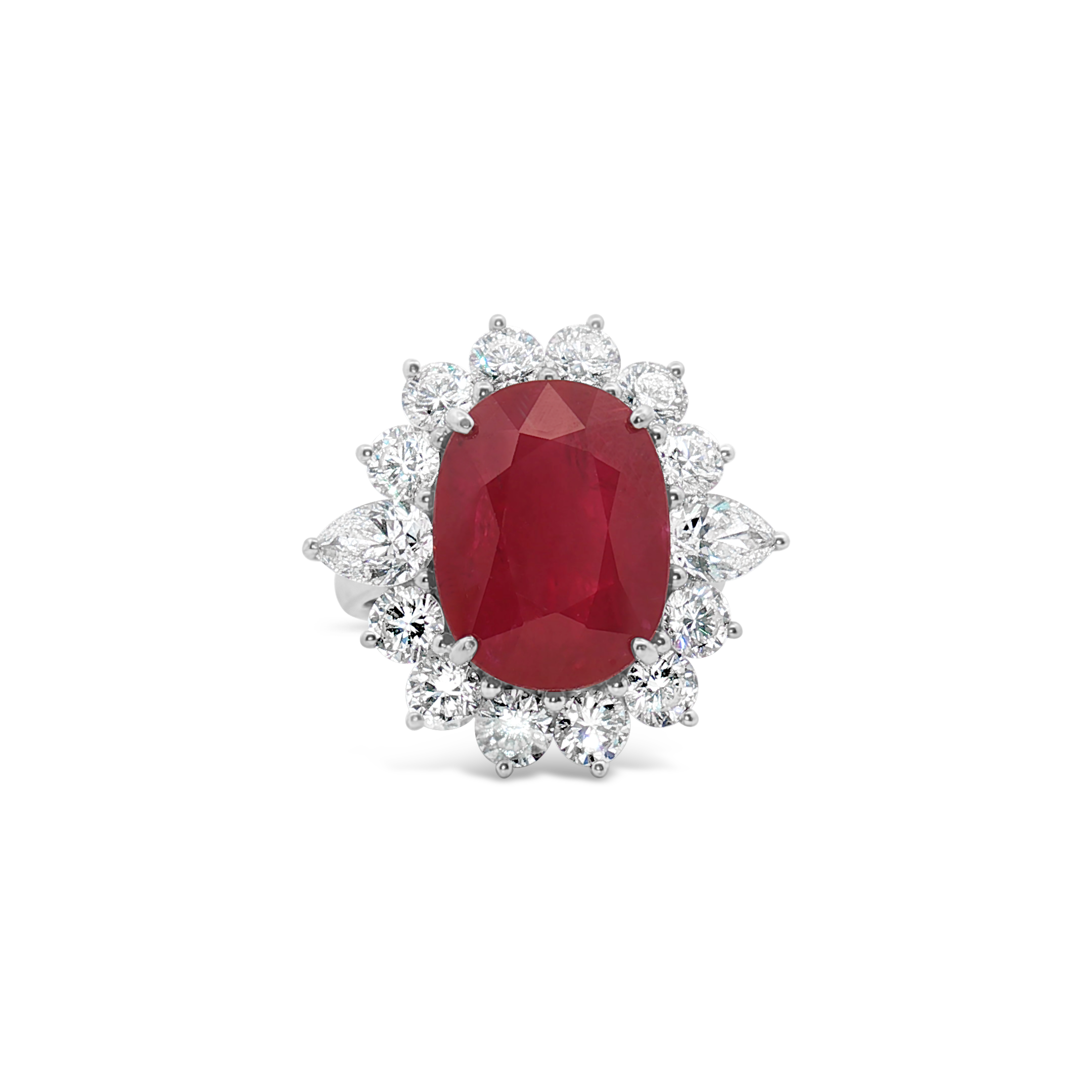 Oval ruby surrounded by pear shaped diamonds set in platinum in this ring. Weight of the ruby is 3.07 carats. Total weight of the diamonds is 8.86 carats.