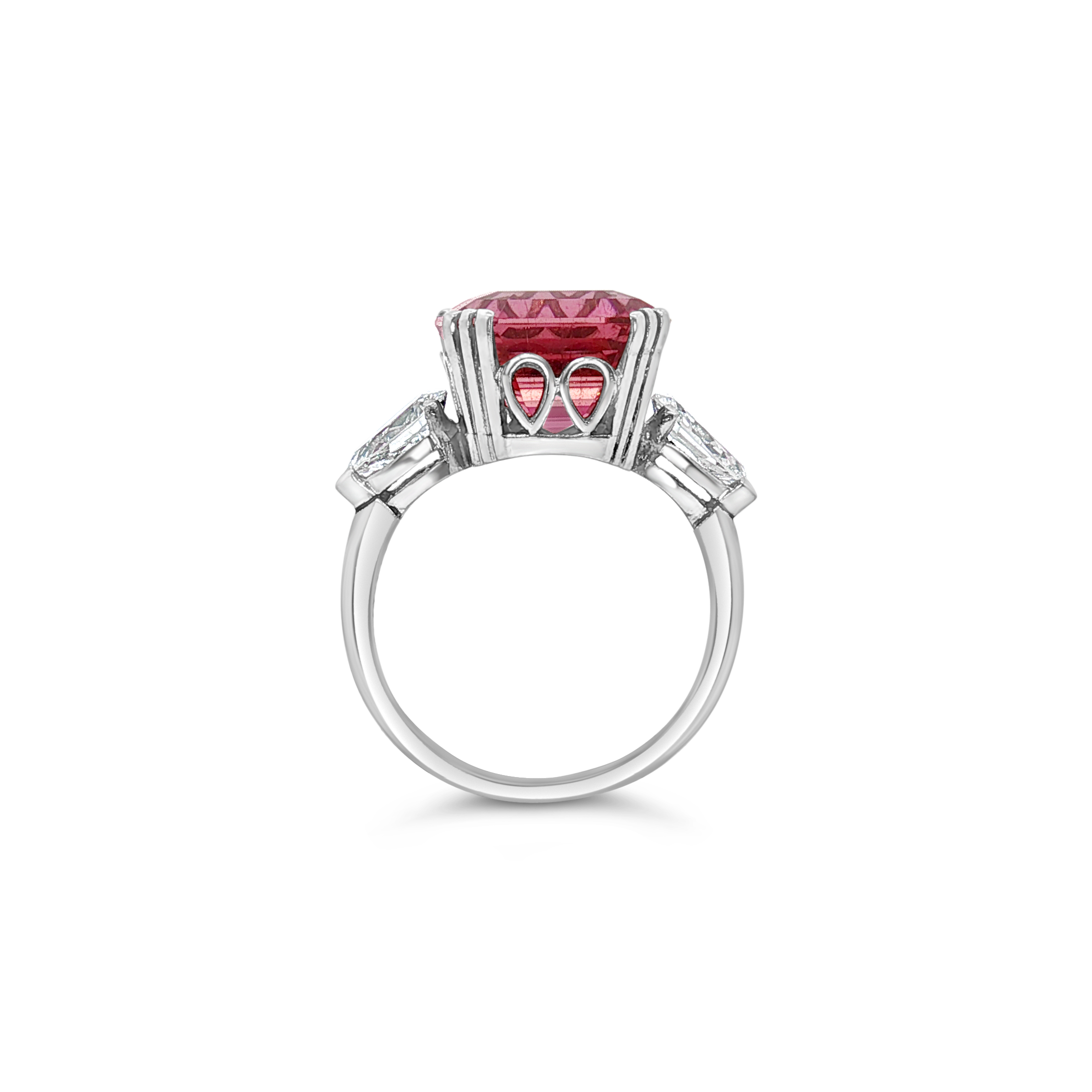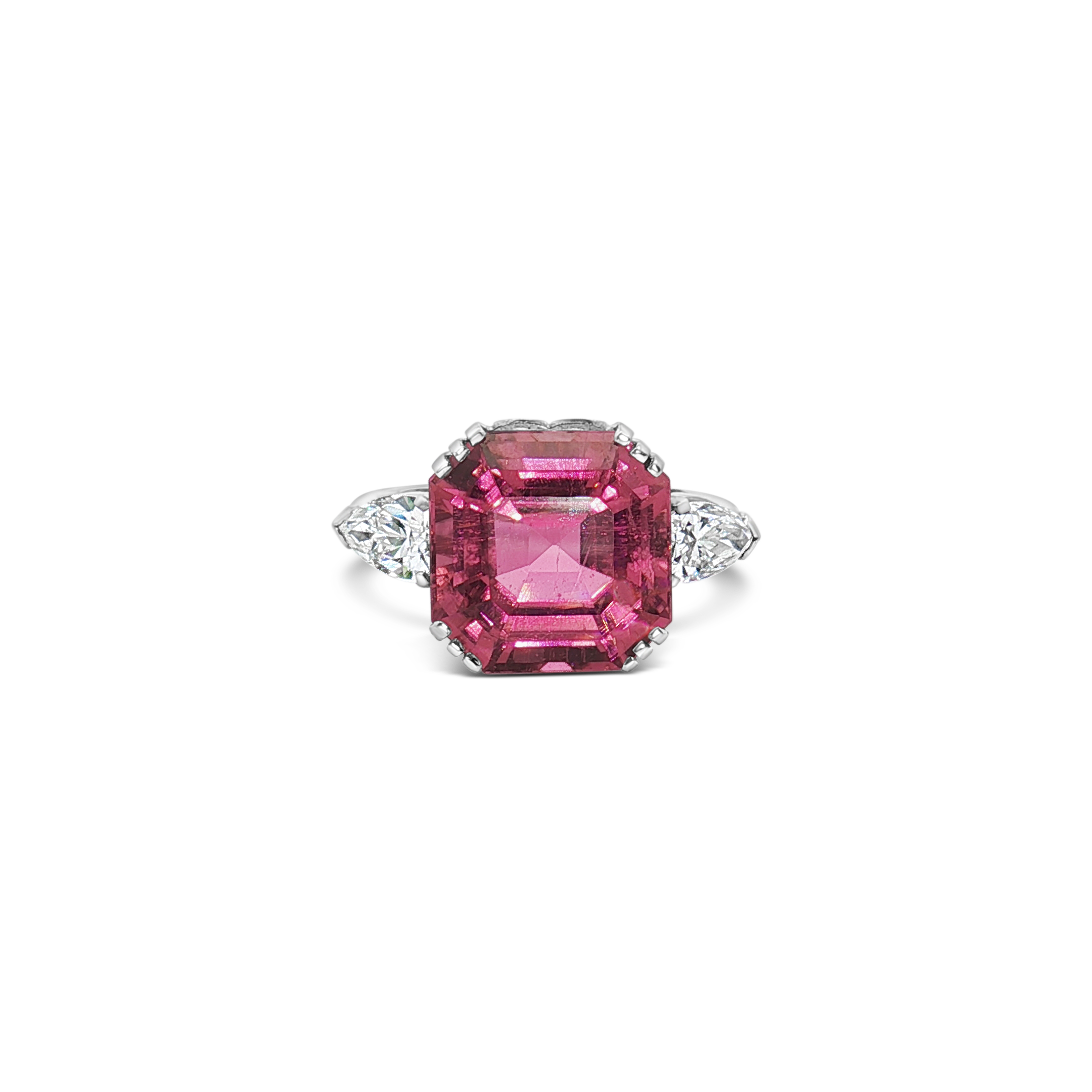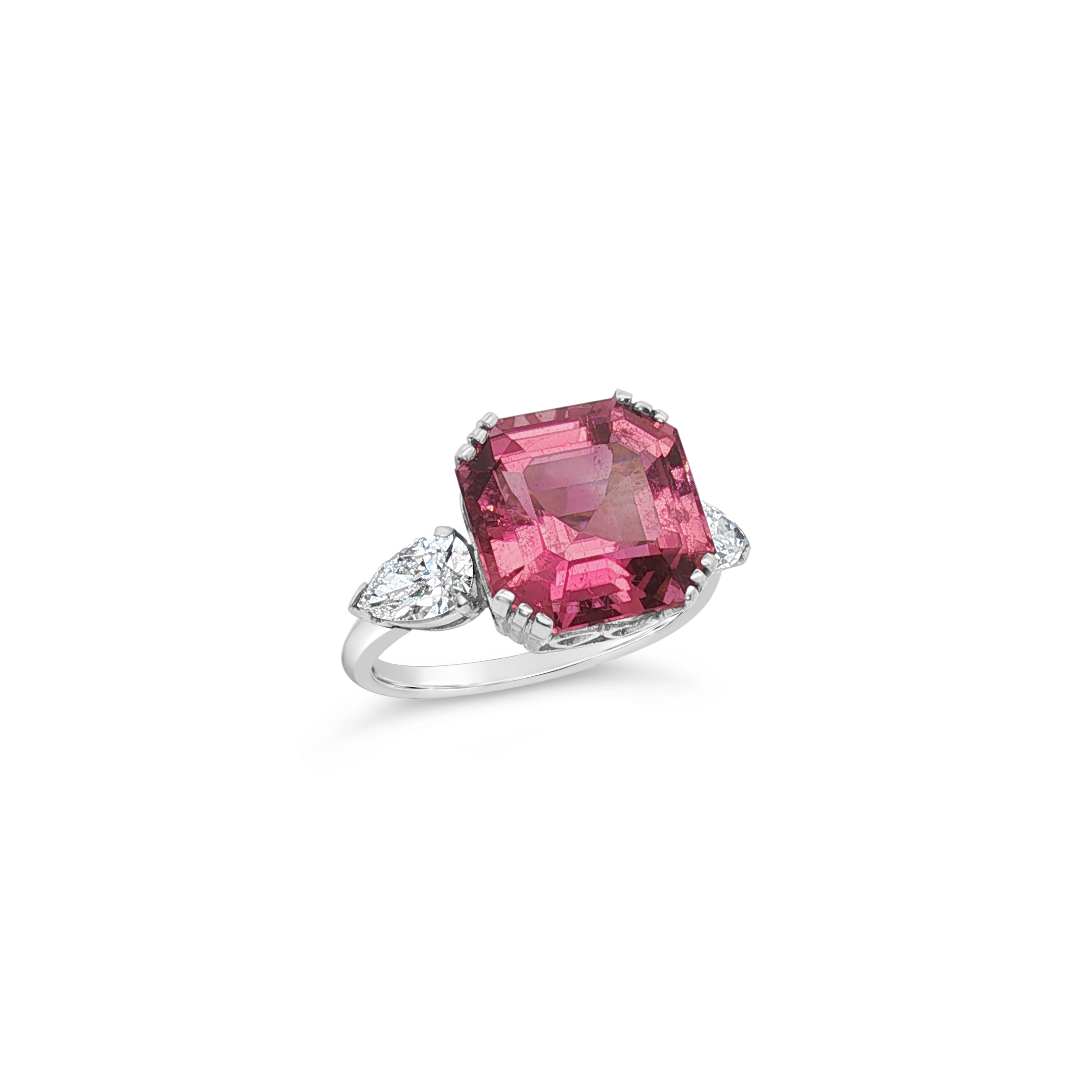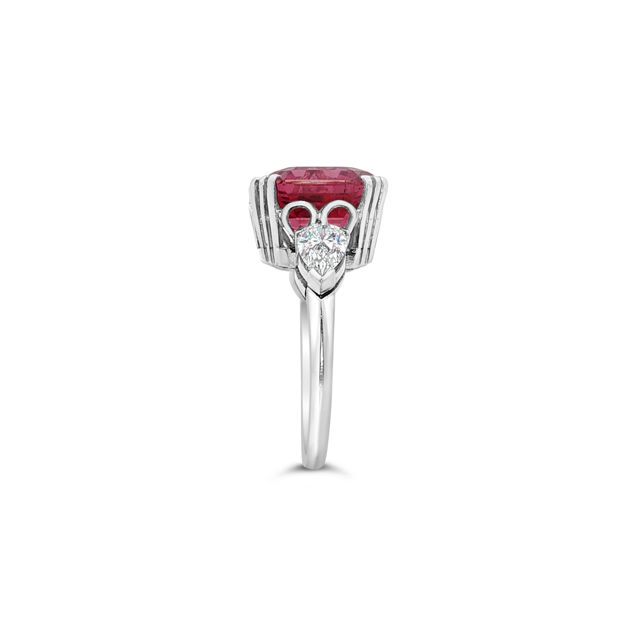 Emerald cut pink tourmaline with diamonds set in platinum in this ring. Weight of the tourmaline is 6.27 carats. Total diamond weight is .45 carat.
