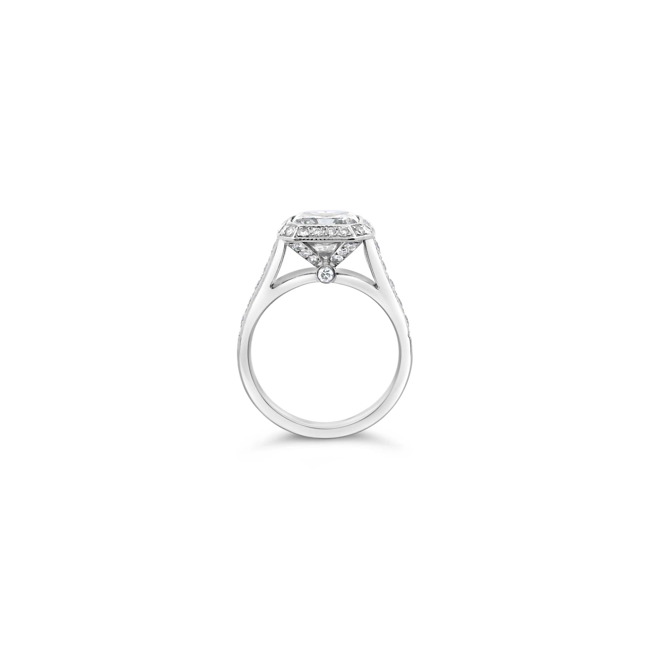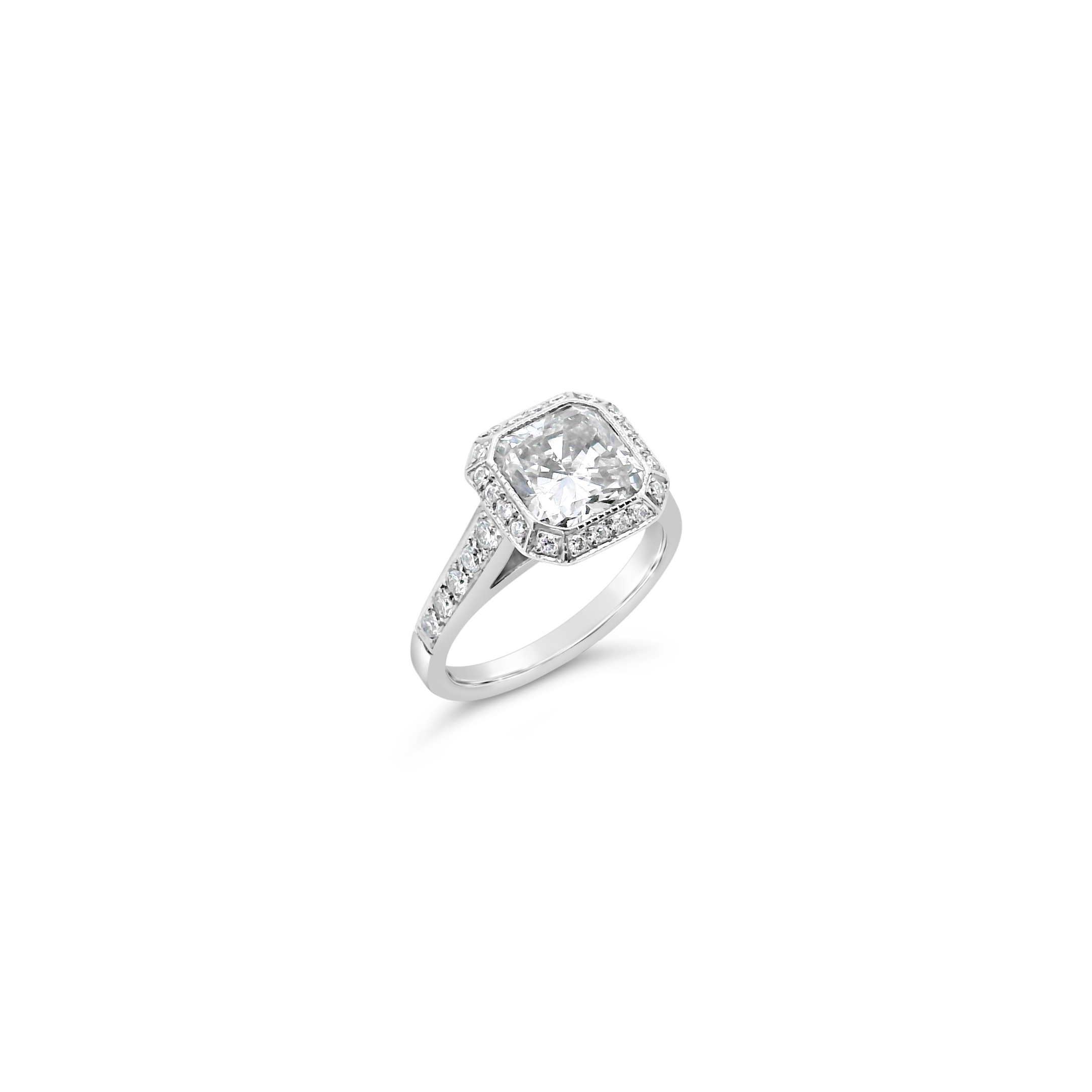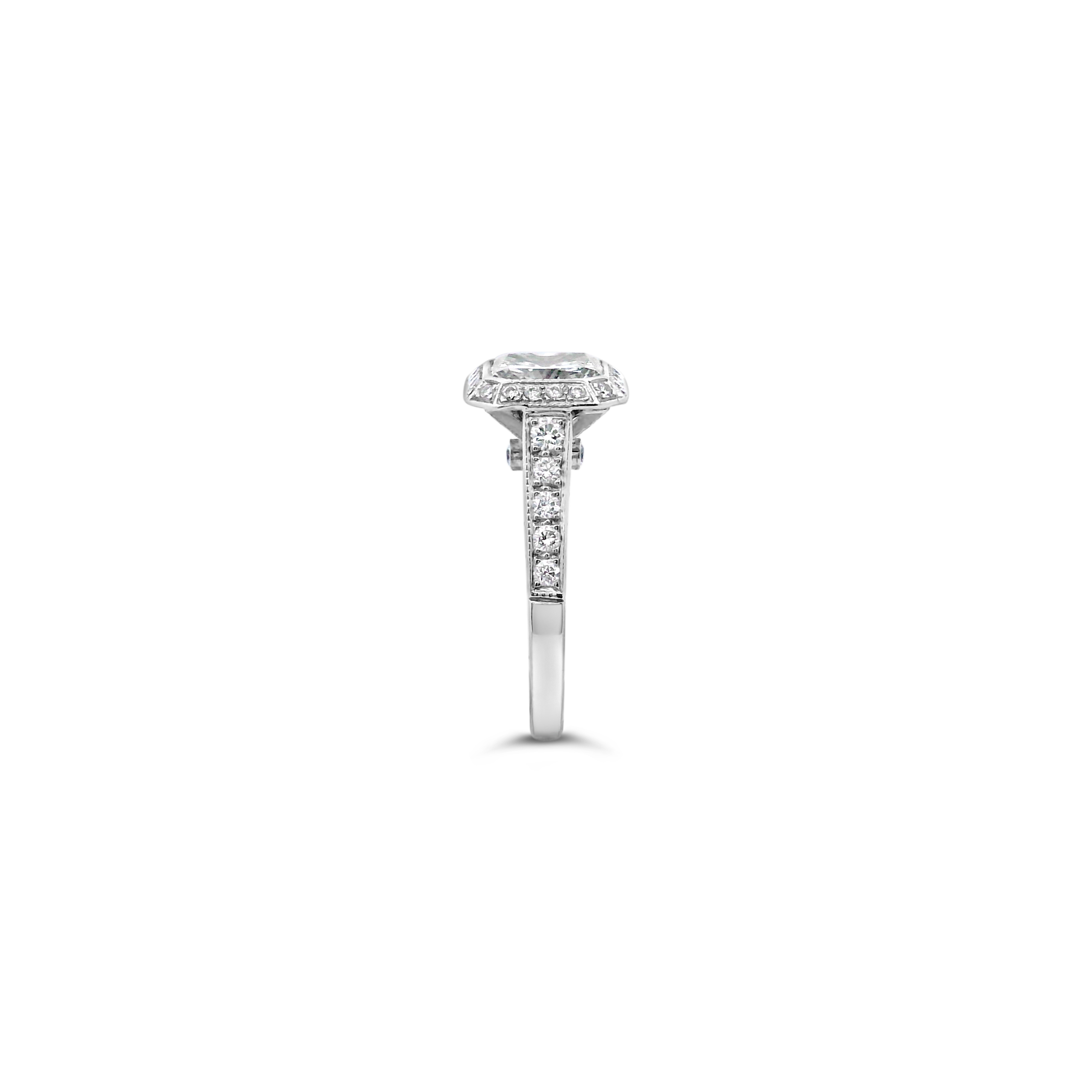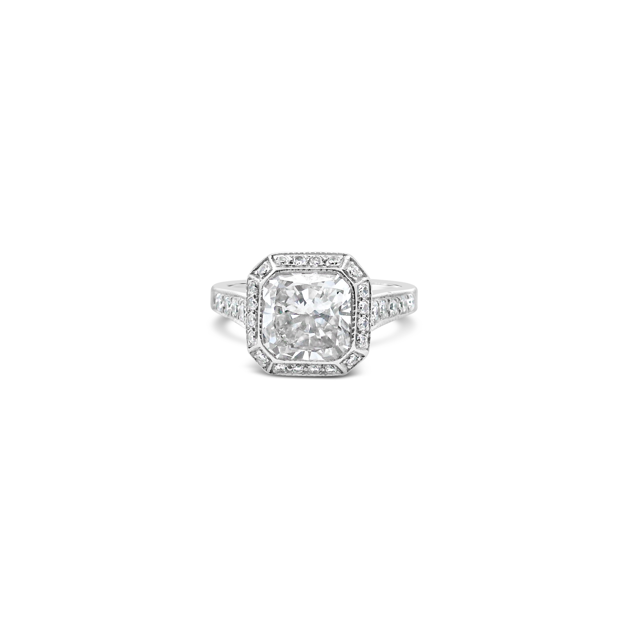 Radiant diamond ring with a halo of round diamonds set in 14k white gold. Carat weight of the center diamond is 2.10. Total weight of the remaining diamonds is .30 carat.