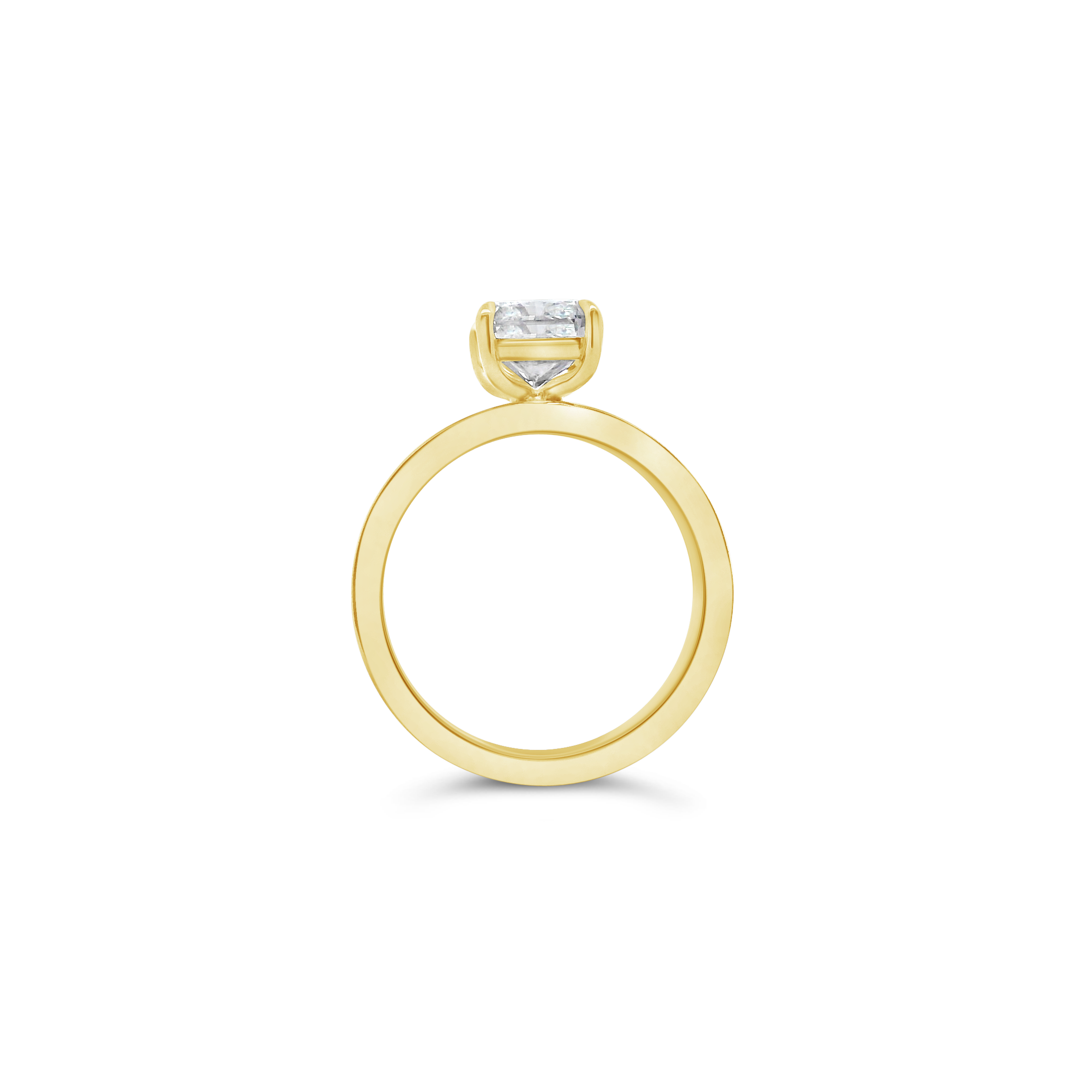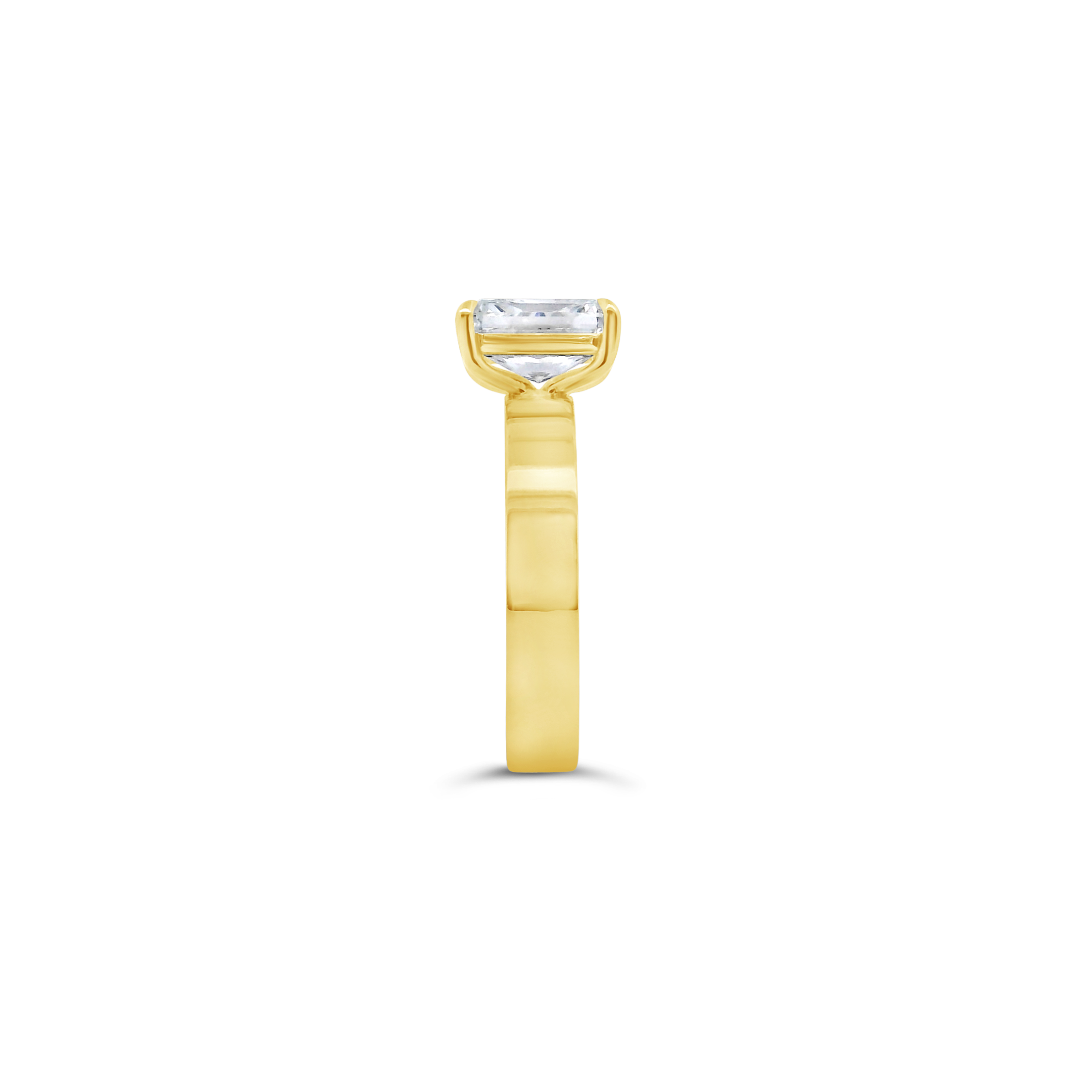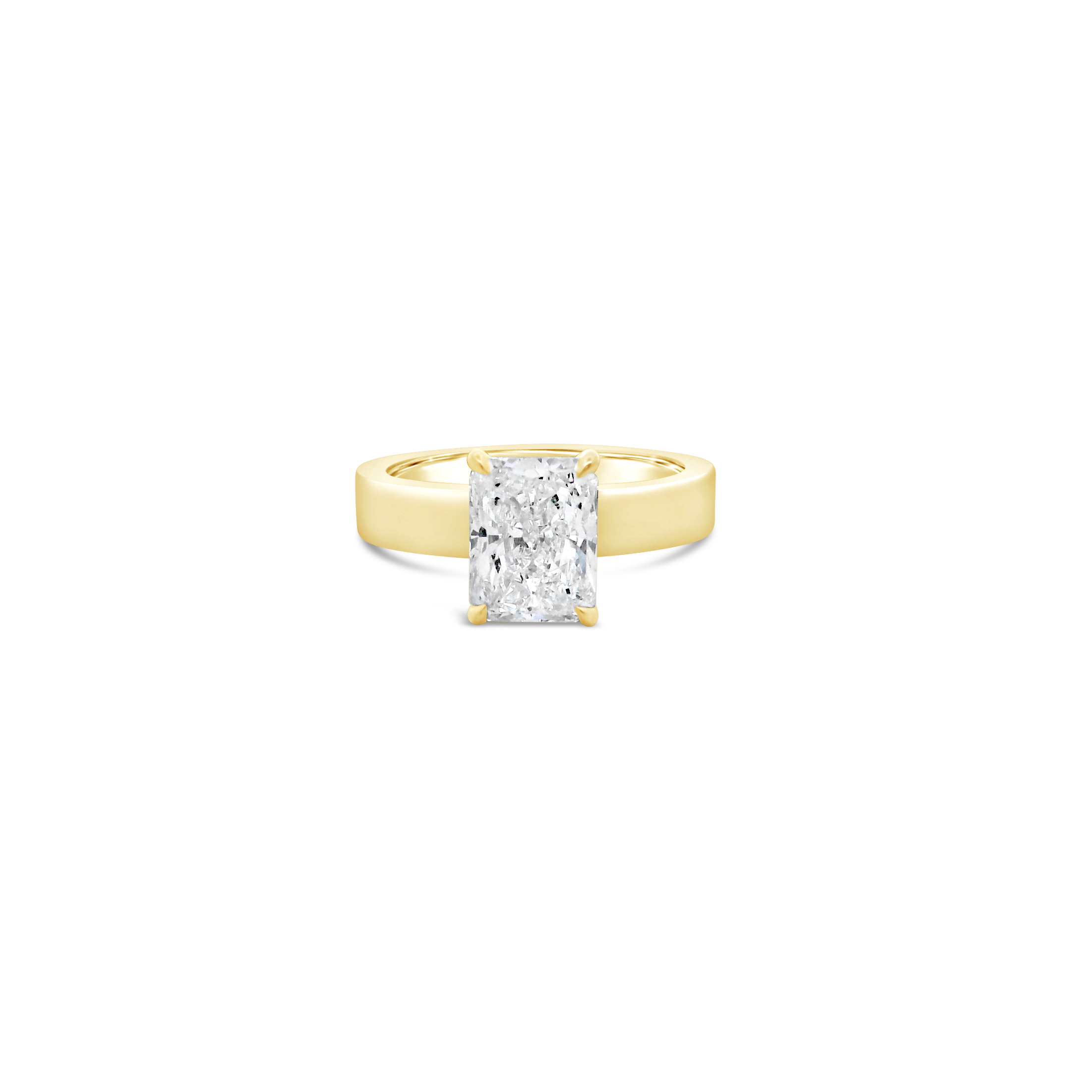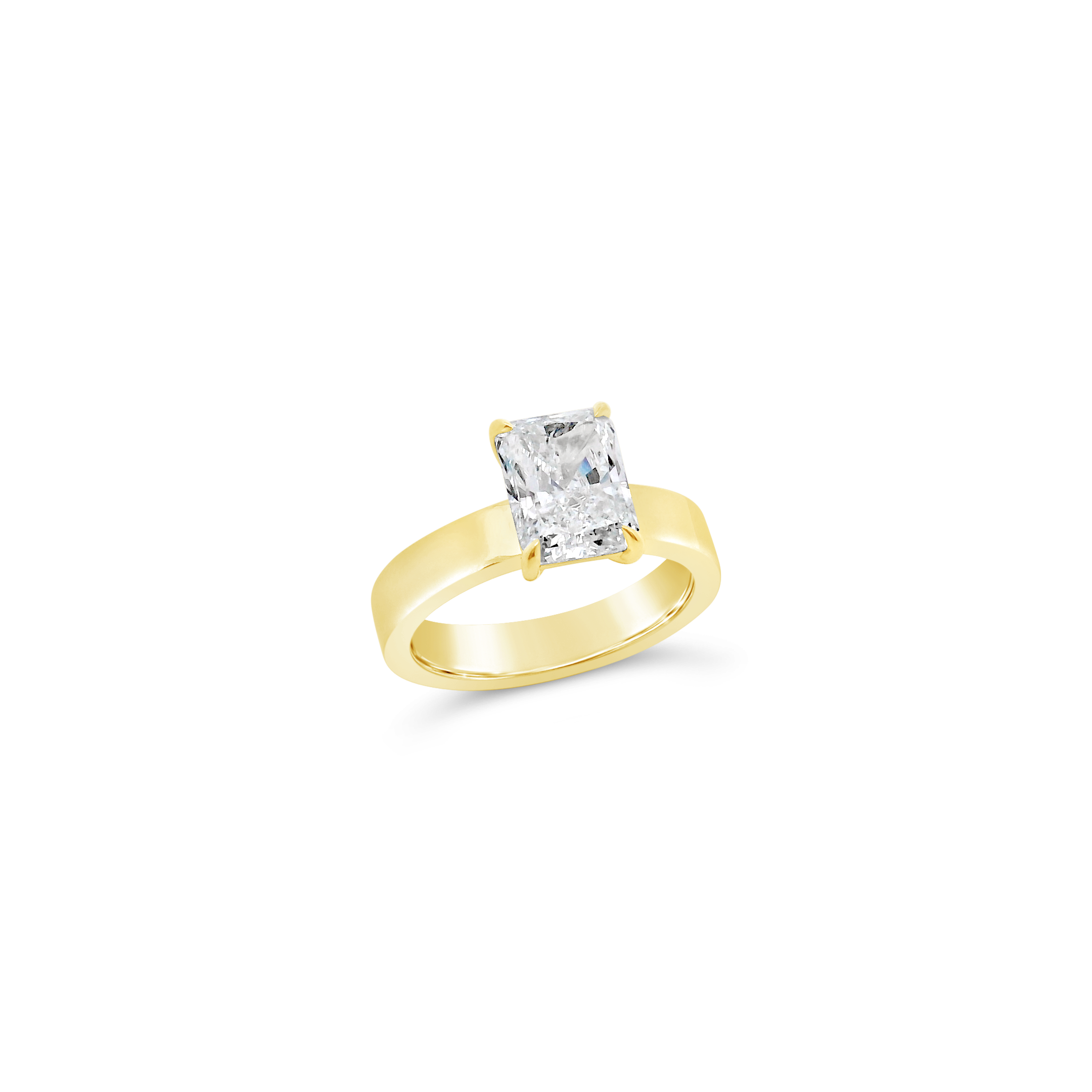 Radiant cut diamond set in 18k yellow gold in this engagement ring. Weight of the solitaire diamond is 2.02 carats.