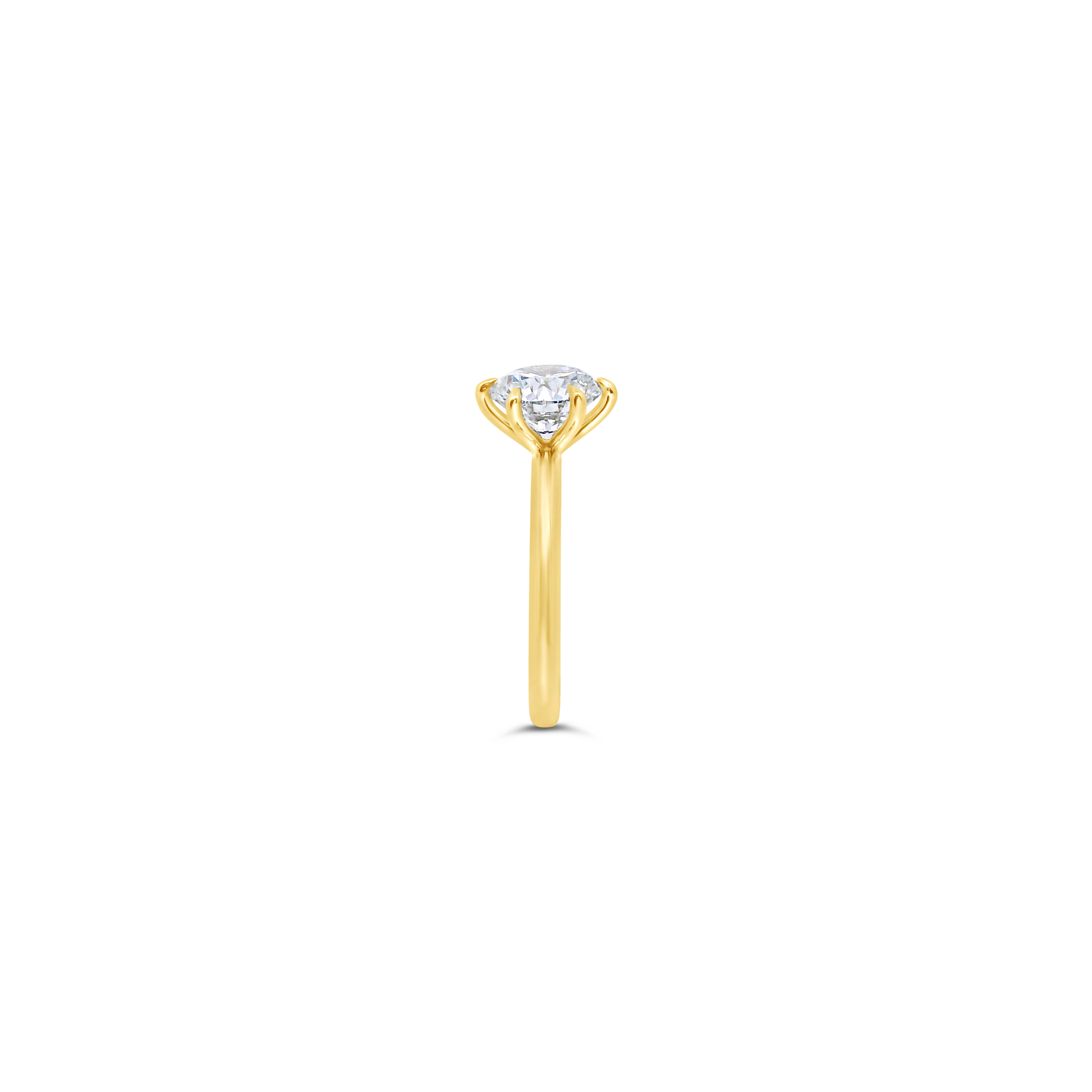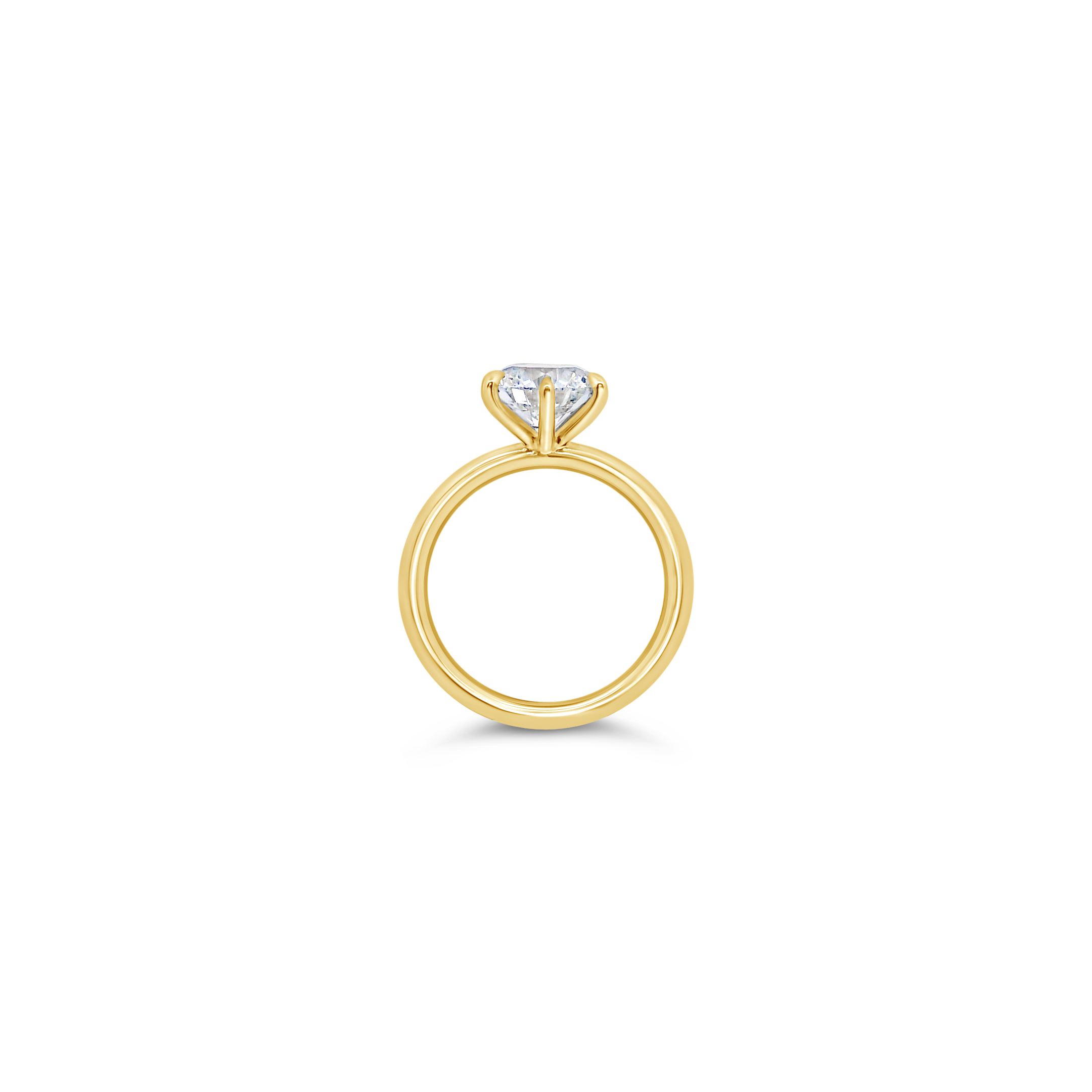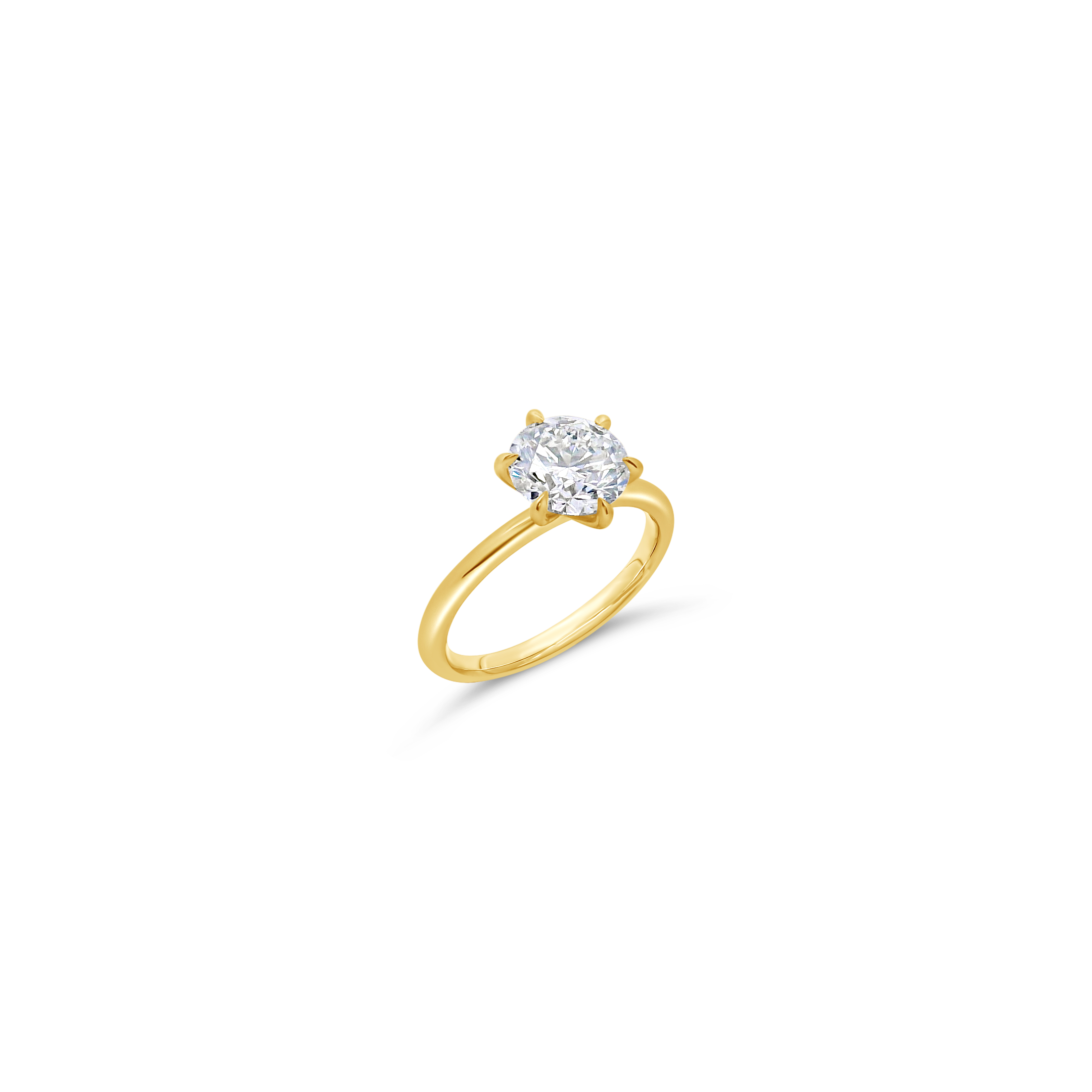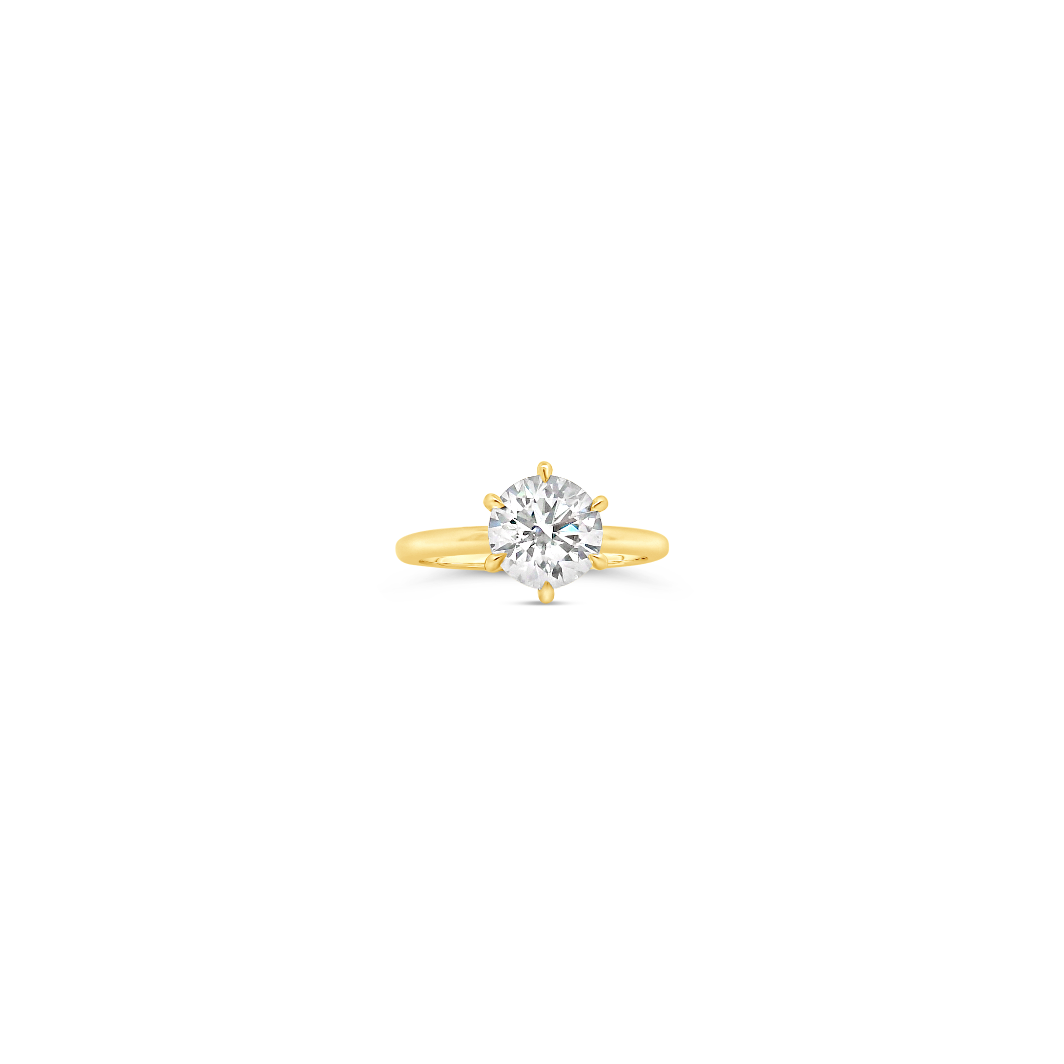 Round diamond prong set in 18k yellow gold in a solitaire six prong setting in this engagement ring. Weight of the diamond is 2.05 carats.