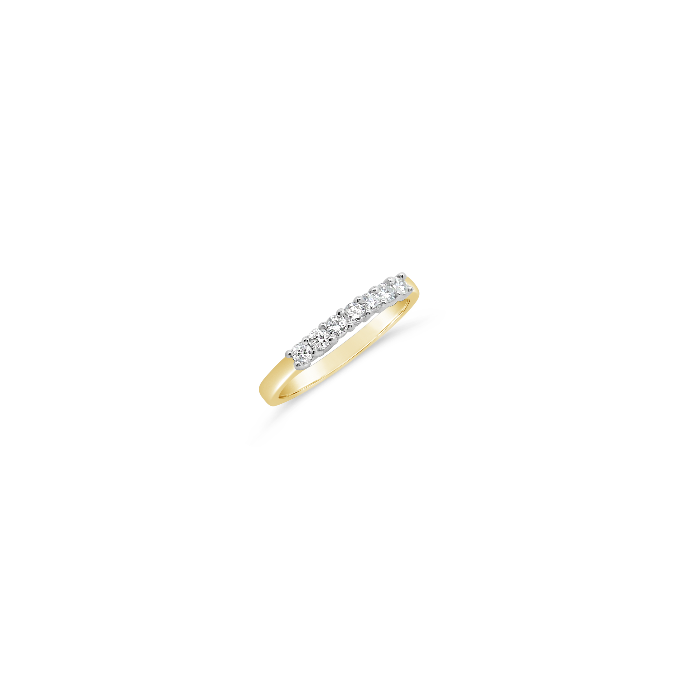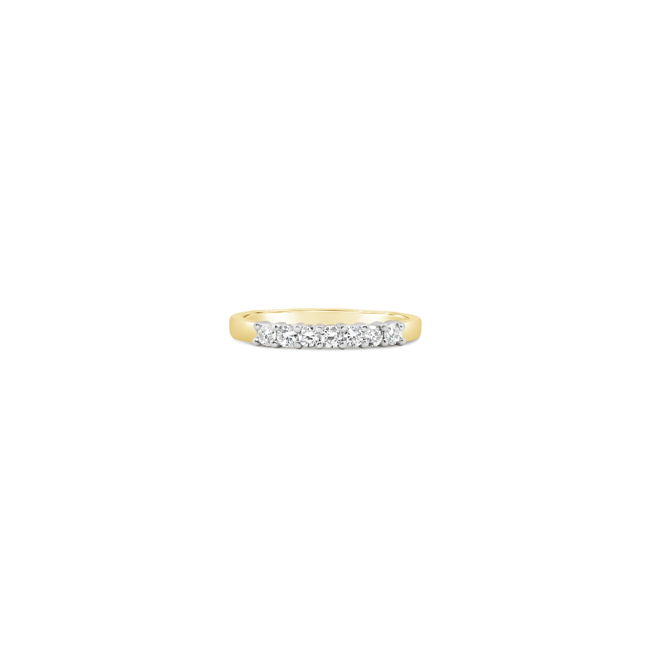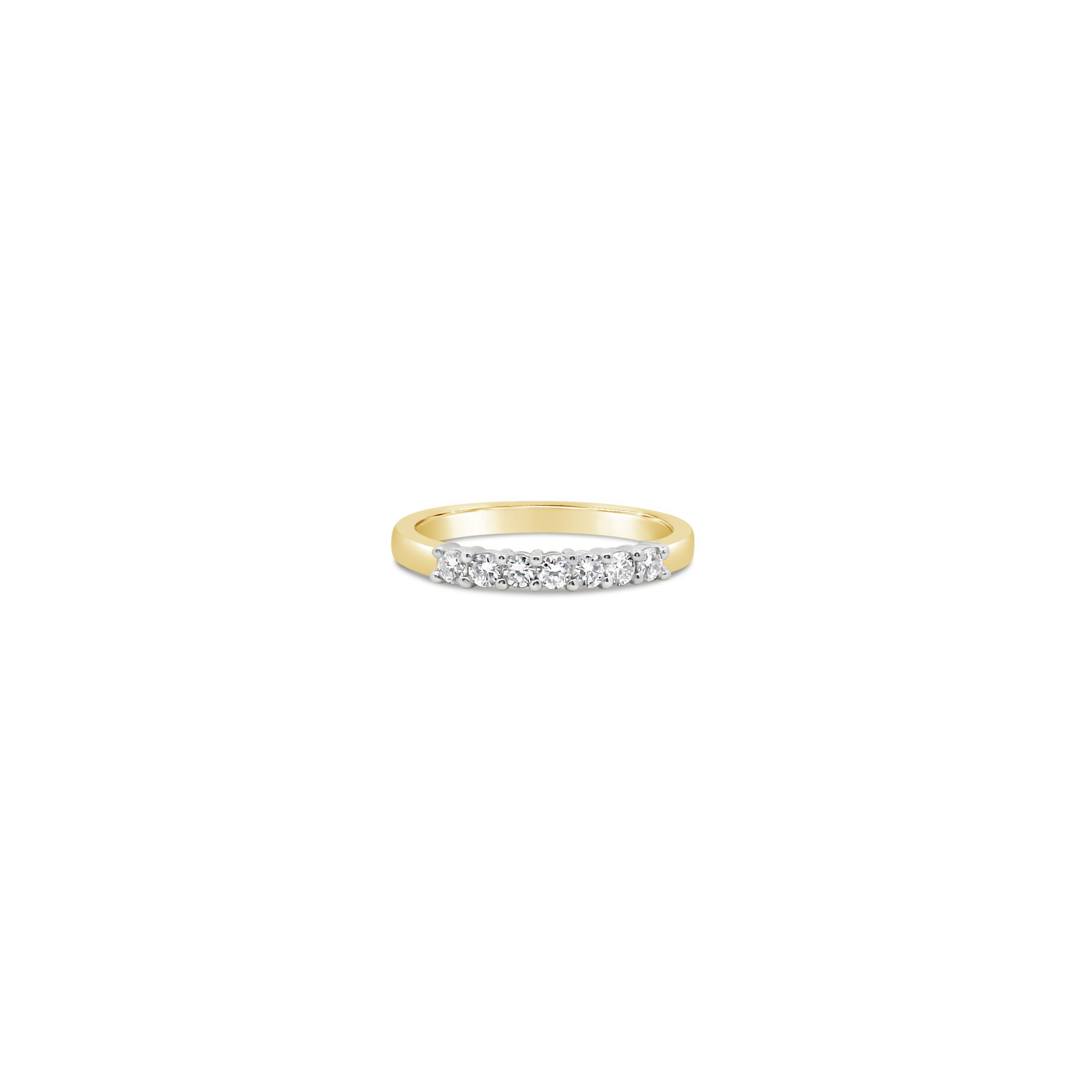Round diamonds set in a shared prong 18k yellow gold and platinum wedding band ring. Total weight of the diamonds is .23 carats.
