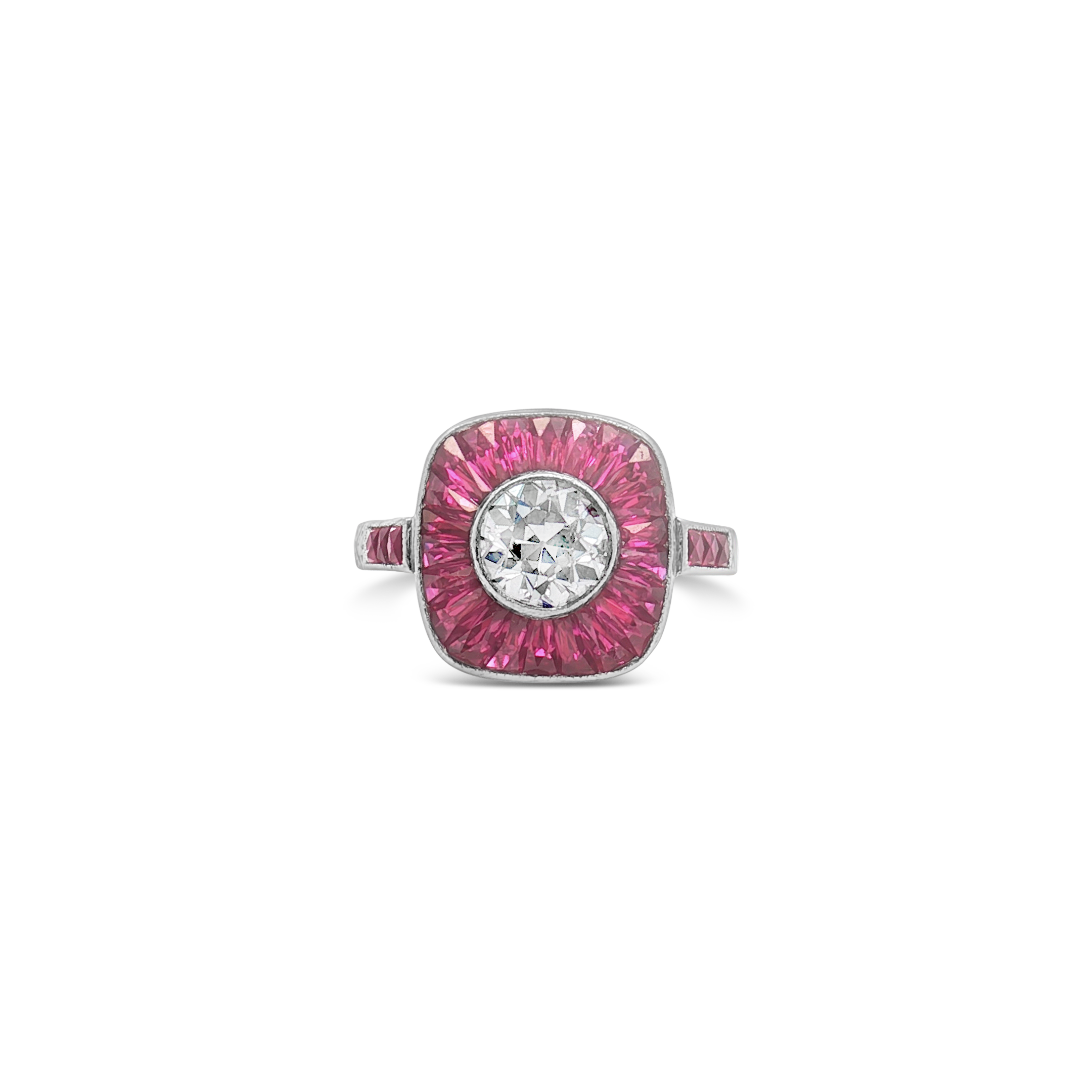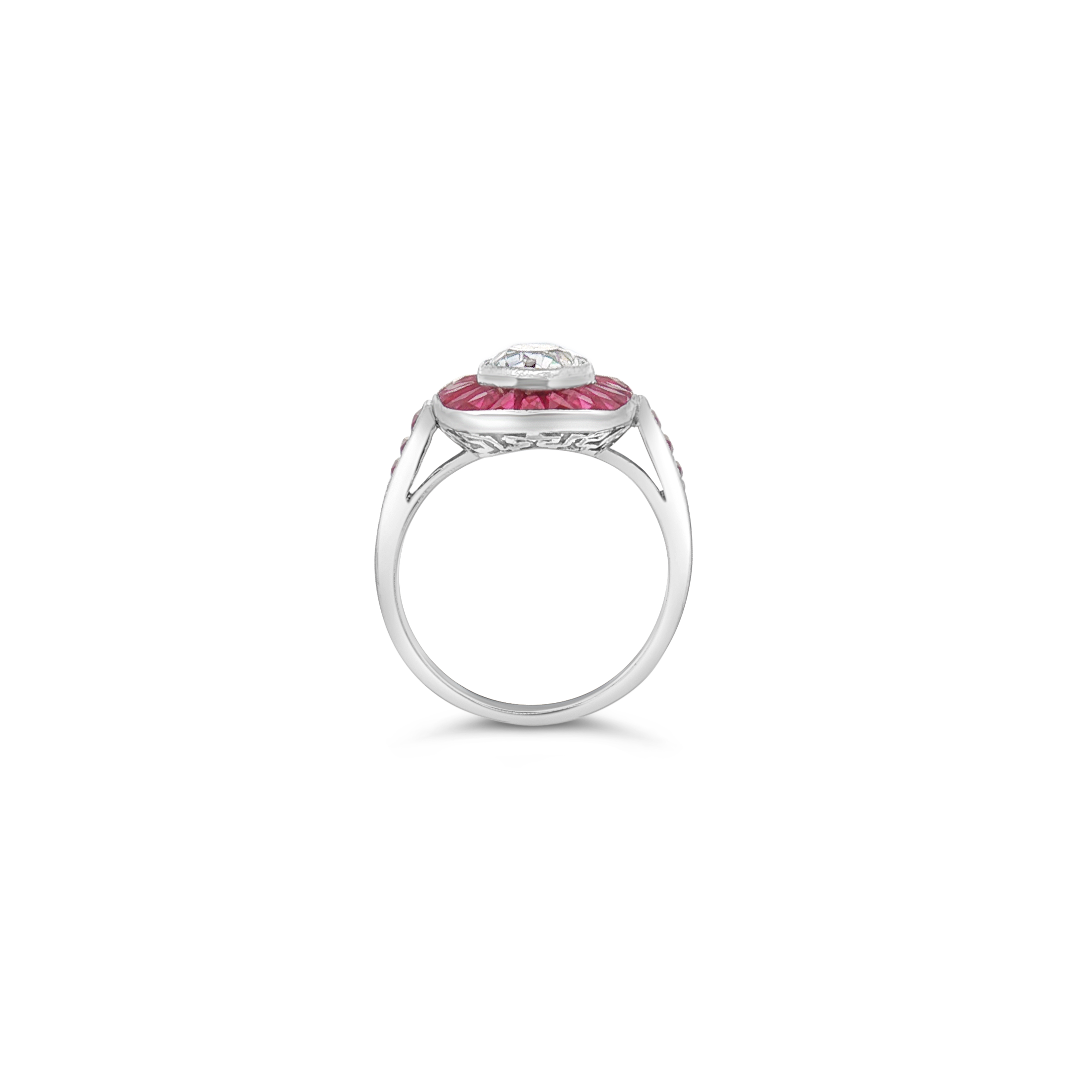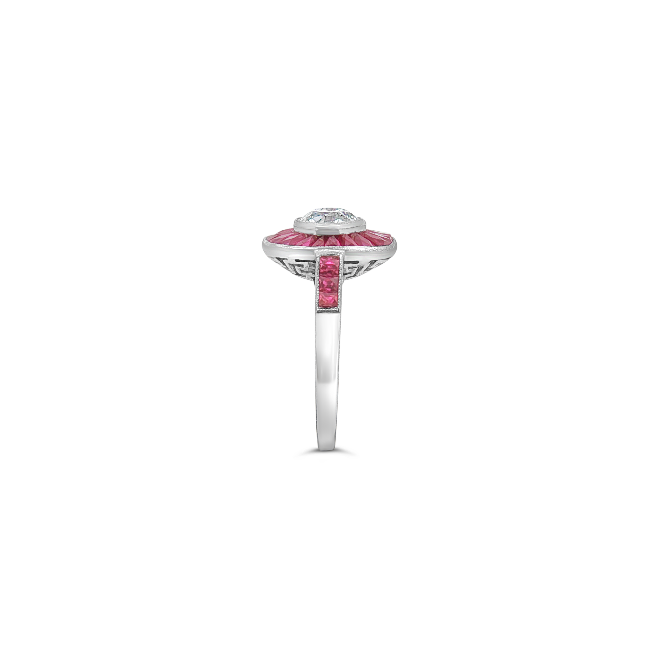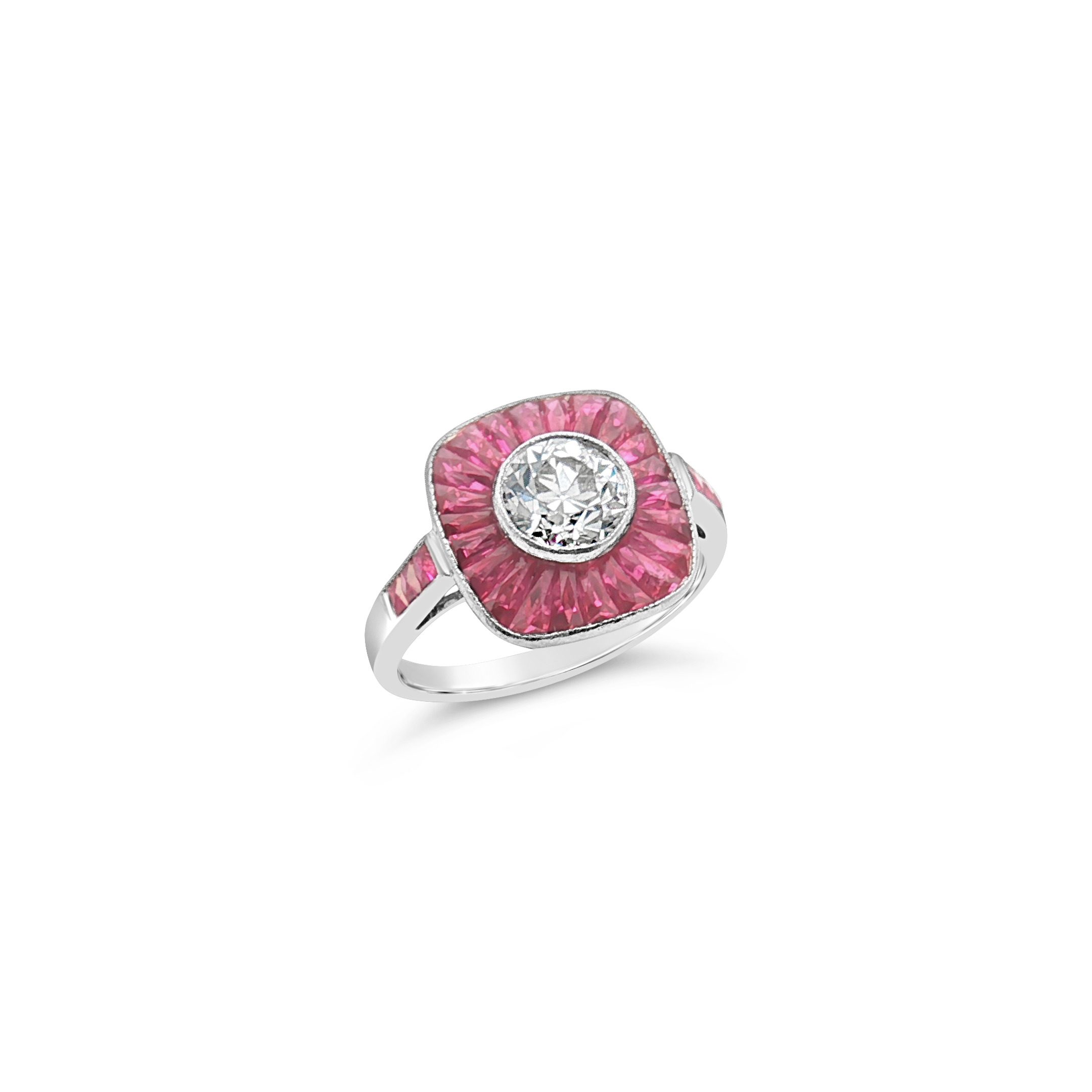 Round diamond surrounded by fancy cut rubies set in platinum in this estate ring. Weight of the diamond is 1.03 carats. Since this is from an estate, its availability is subject to prior sale.
