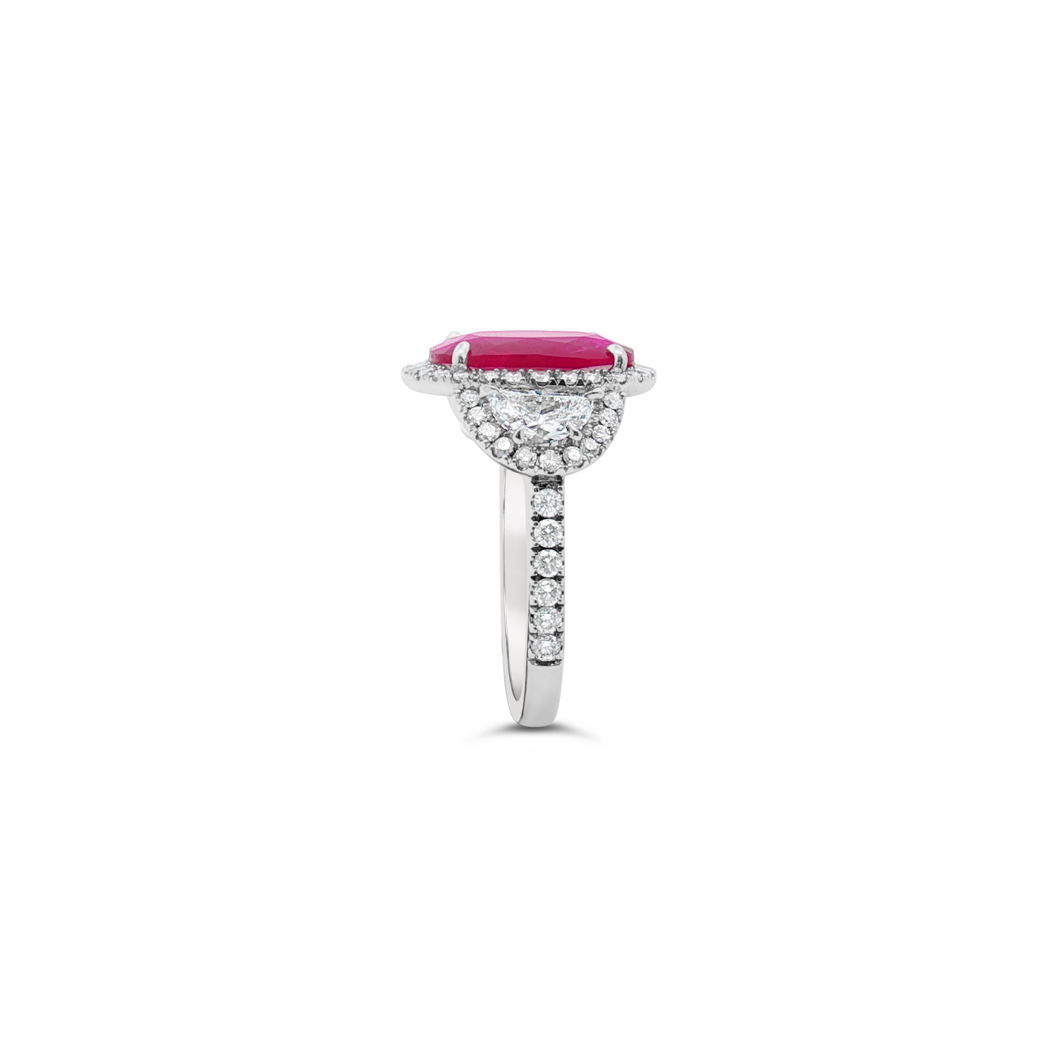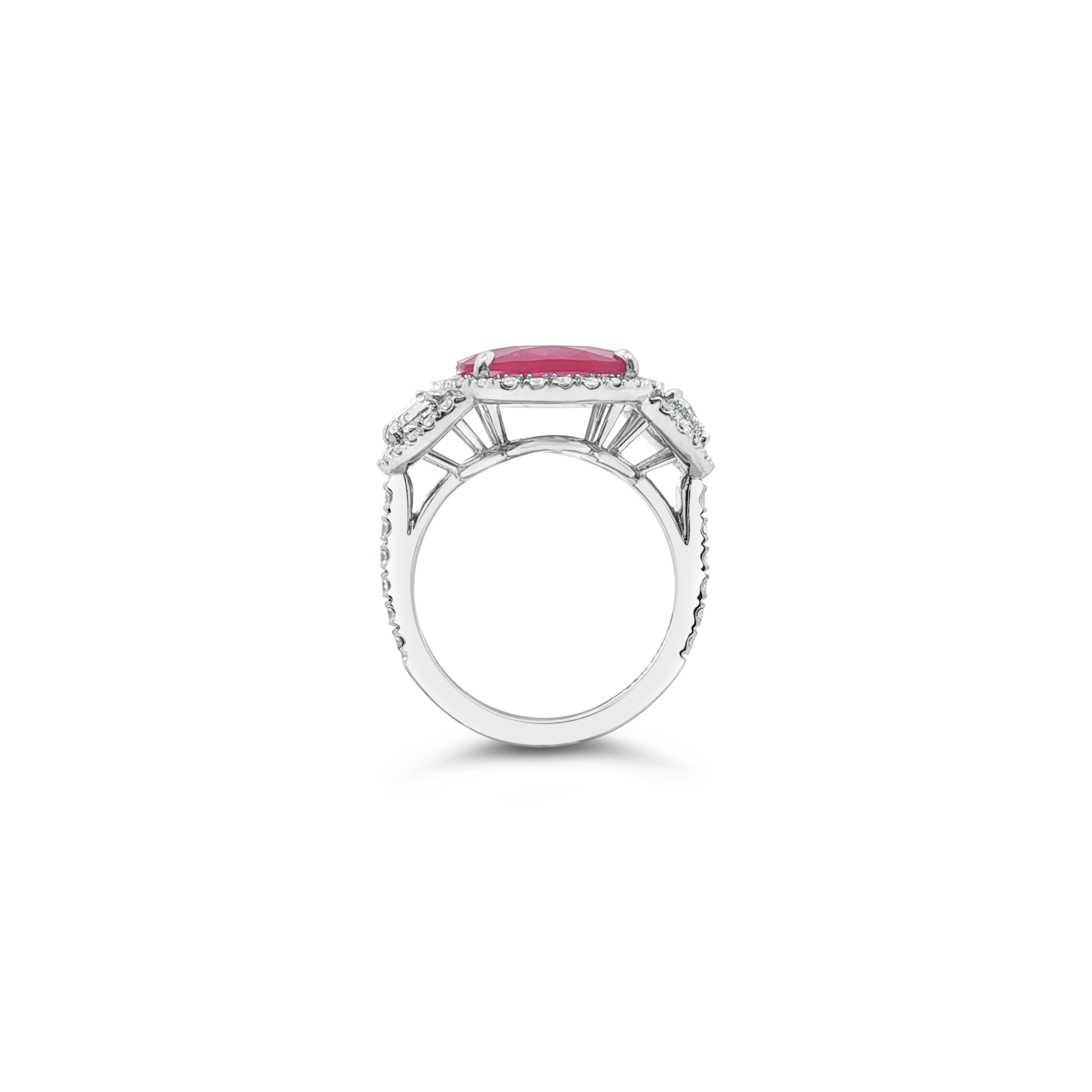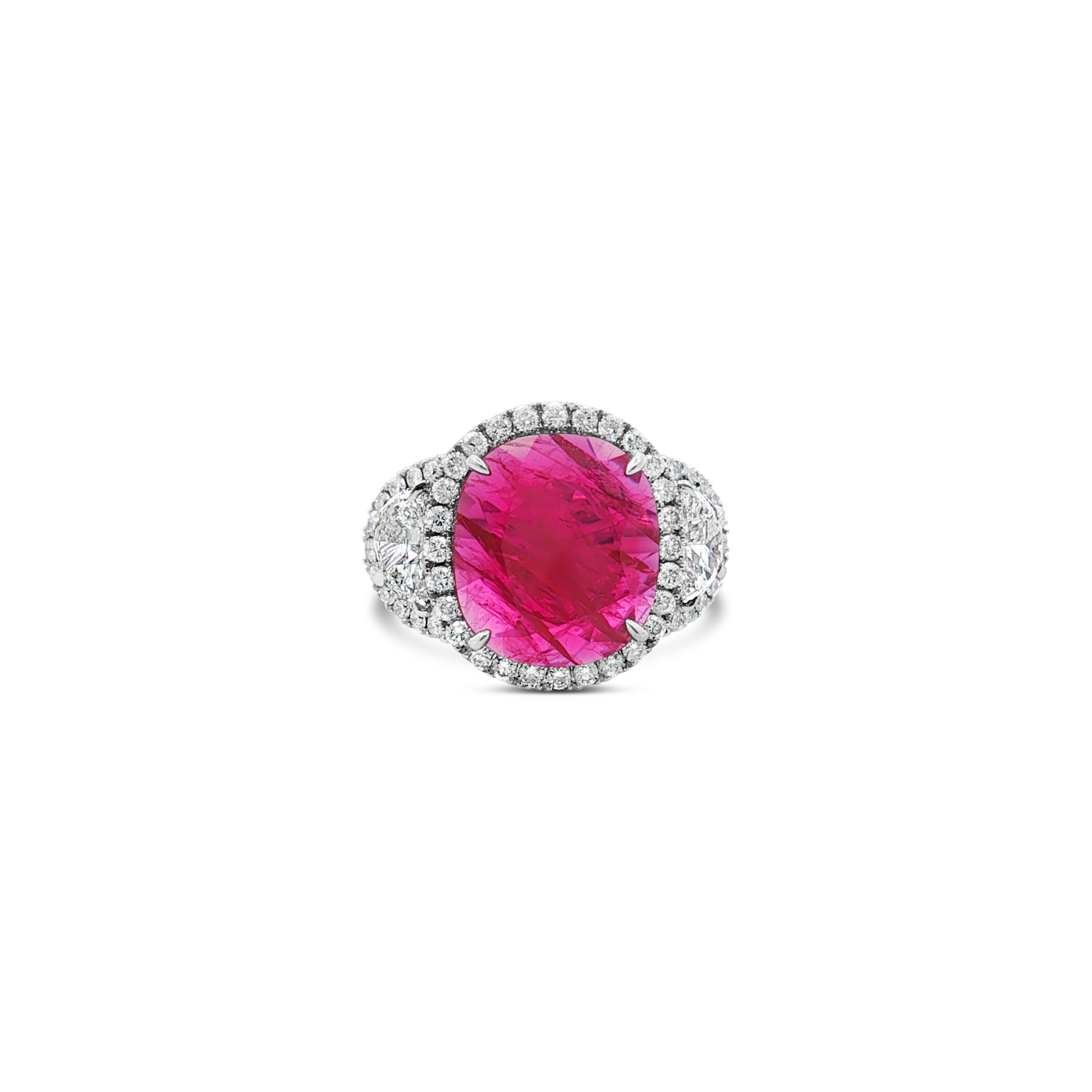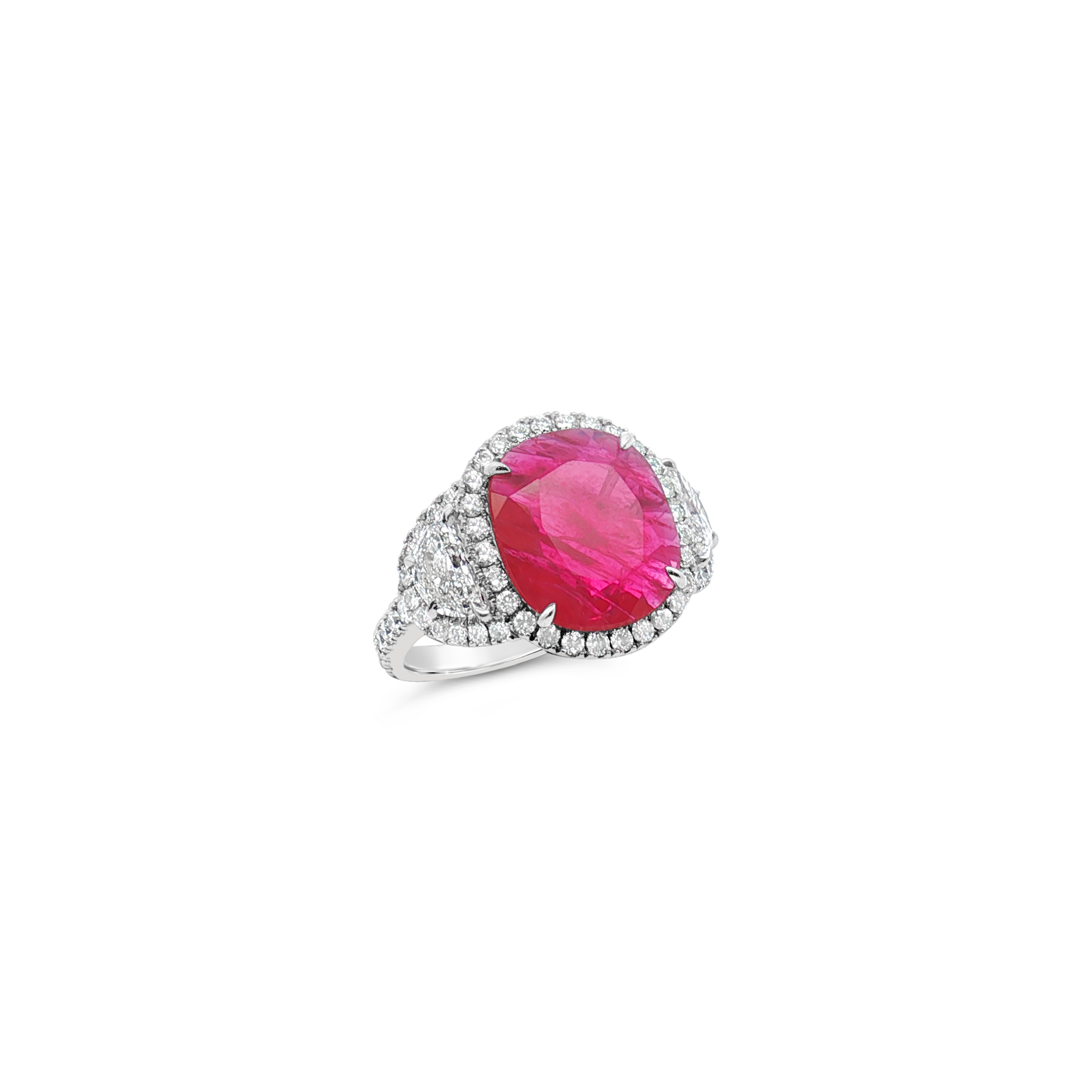 Oval ruby flanked by half moon diamonds with round diamonds set in platinum in this ring. Weight of the ruby is 5.15 carats. Total weight of the diamonds is 1.78 carats.