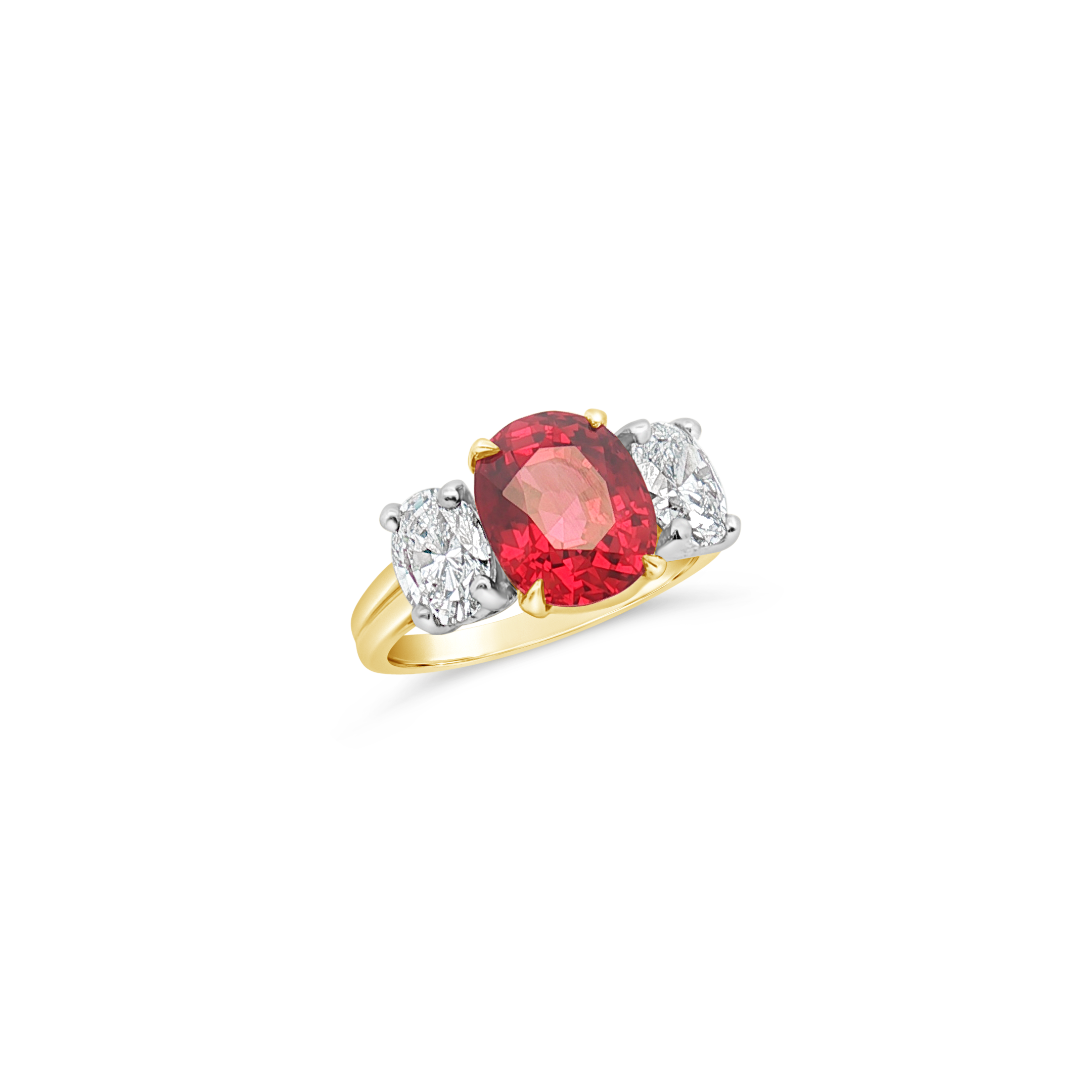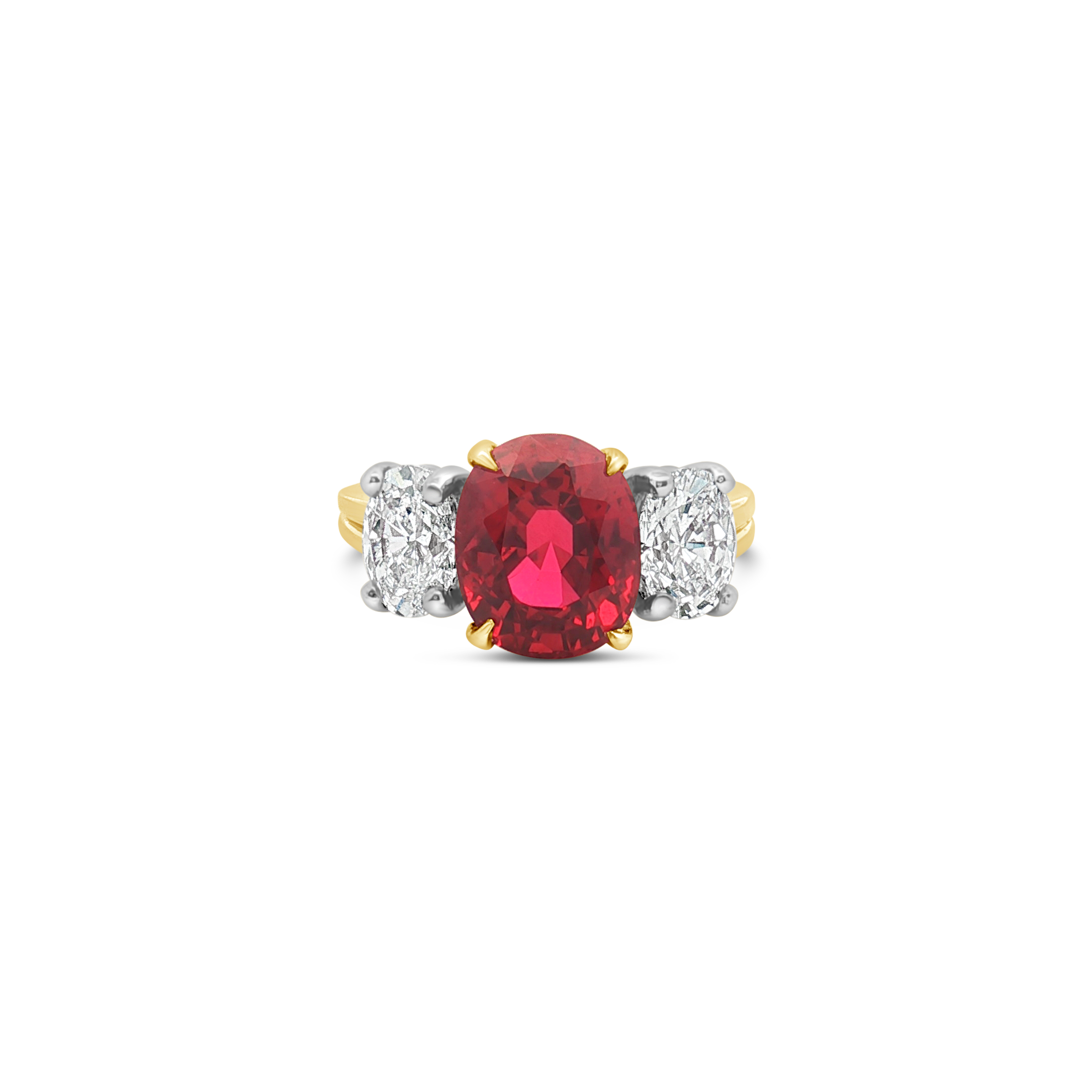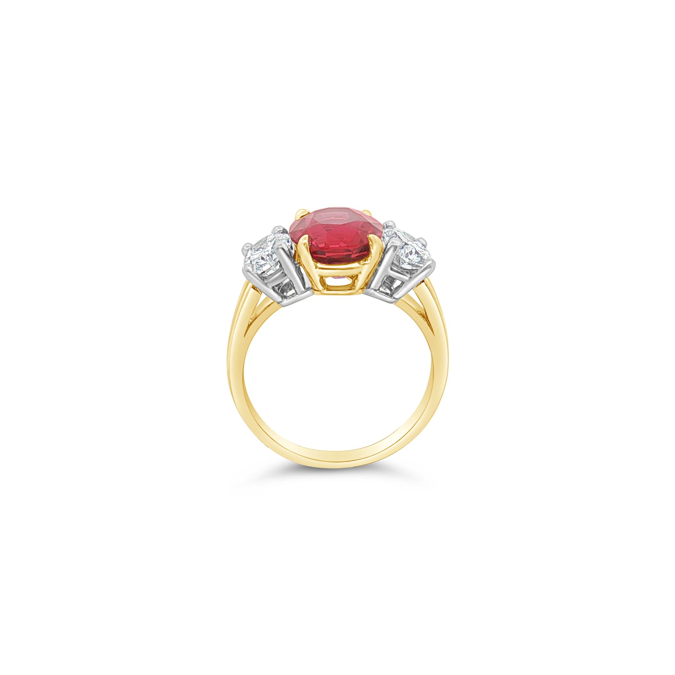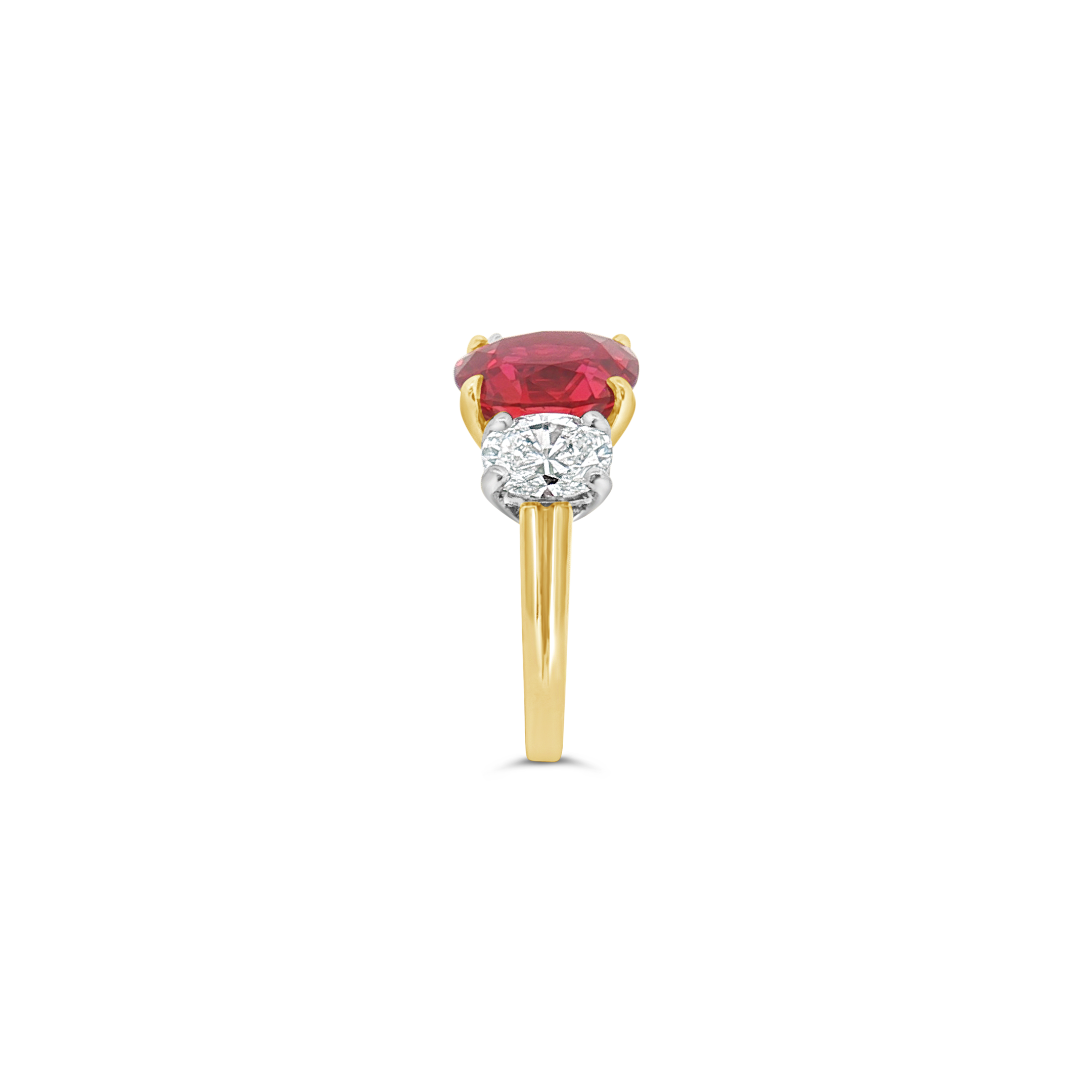 Center ruby flanked by two diamonds set in 18k yellow gold in this ring. Weight of the ruby is 4.17 carats. Total diamond weight is 1.00 carat.